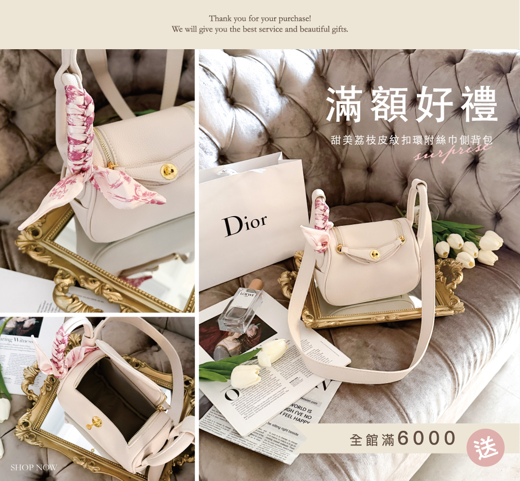 全館消費 折扣後 滿NT.6000元 即贈送【甜美荔枝皮紋扣環附絲巾側背包】乙件。