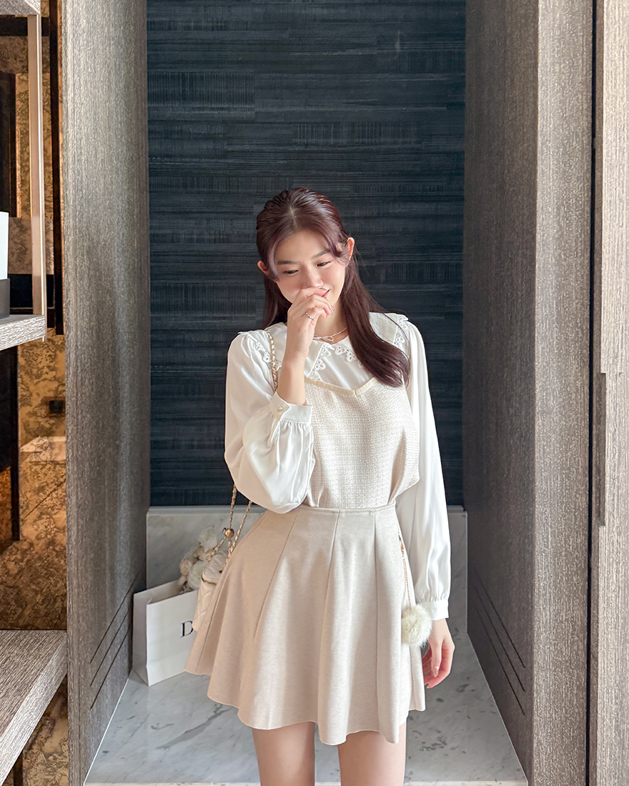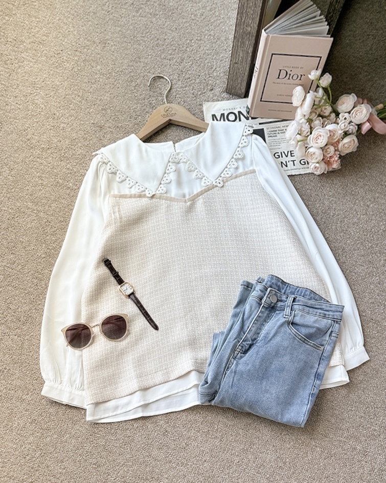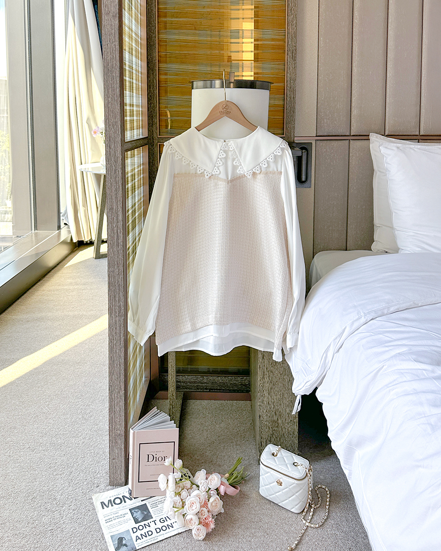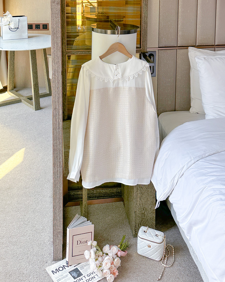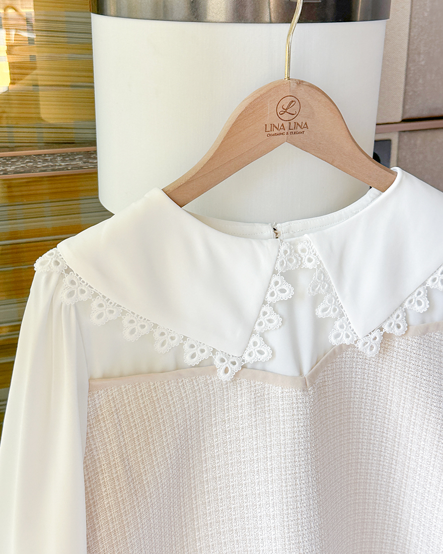 LINA LINA貴氣甜氛緹花翻領織紋假兩件上衣-奶茶杏