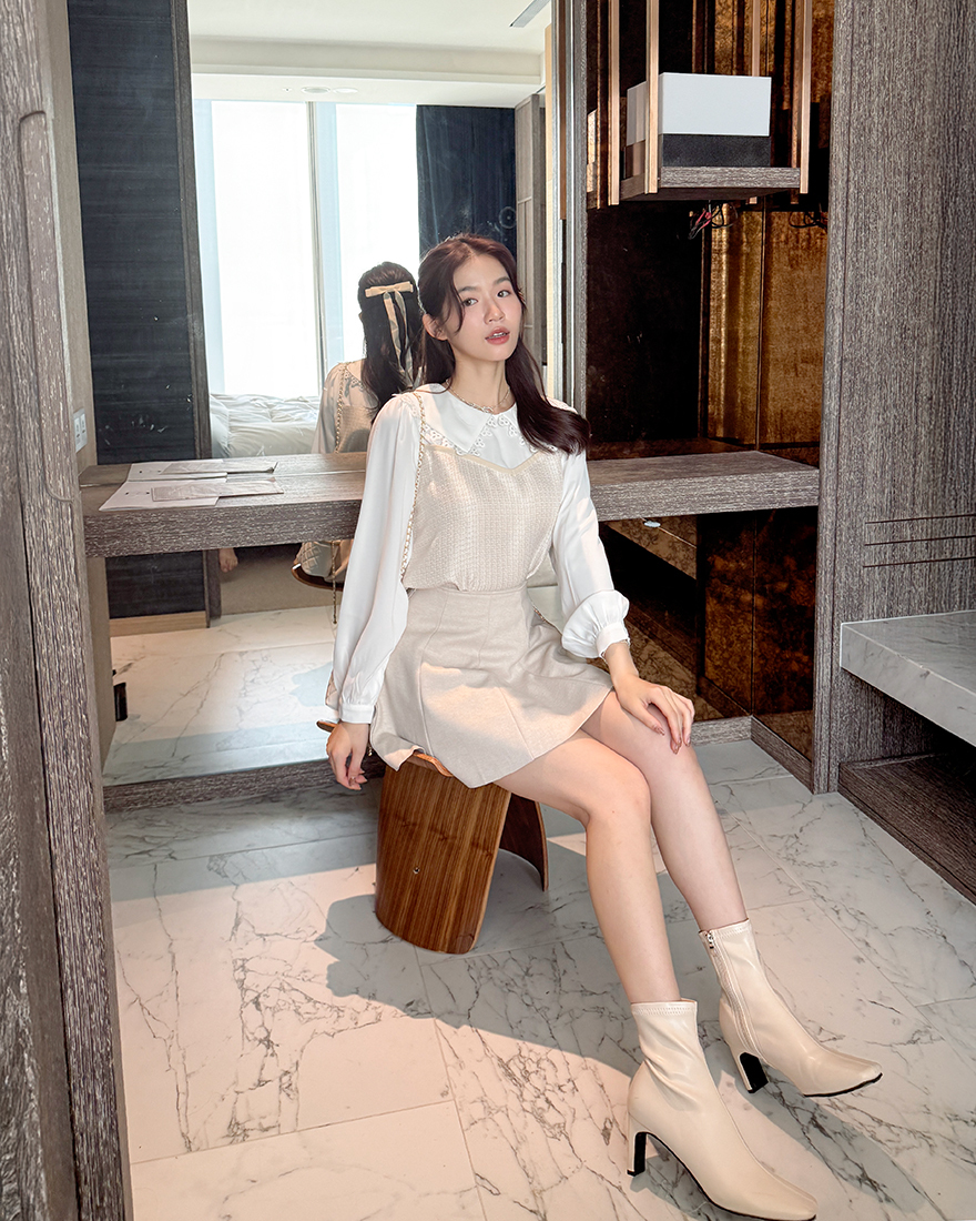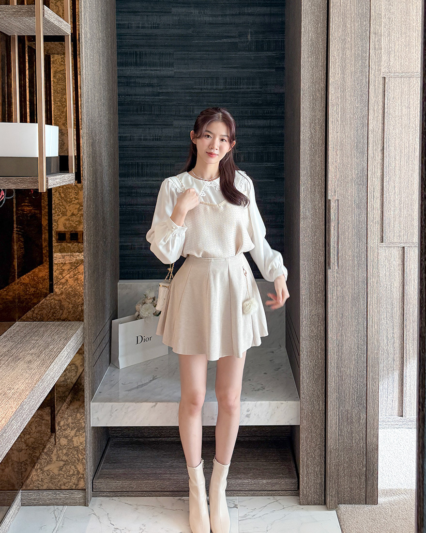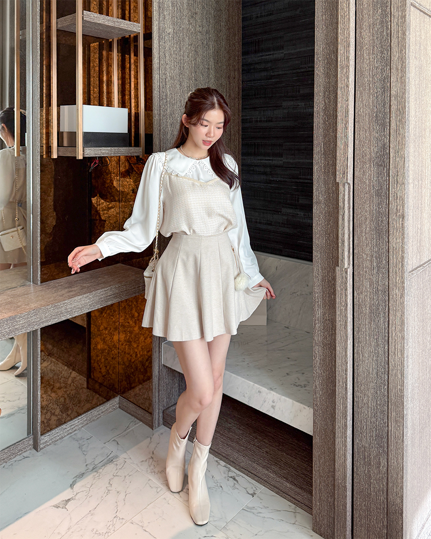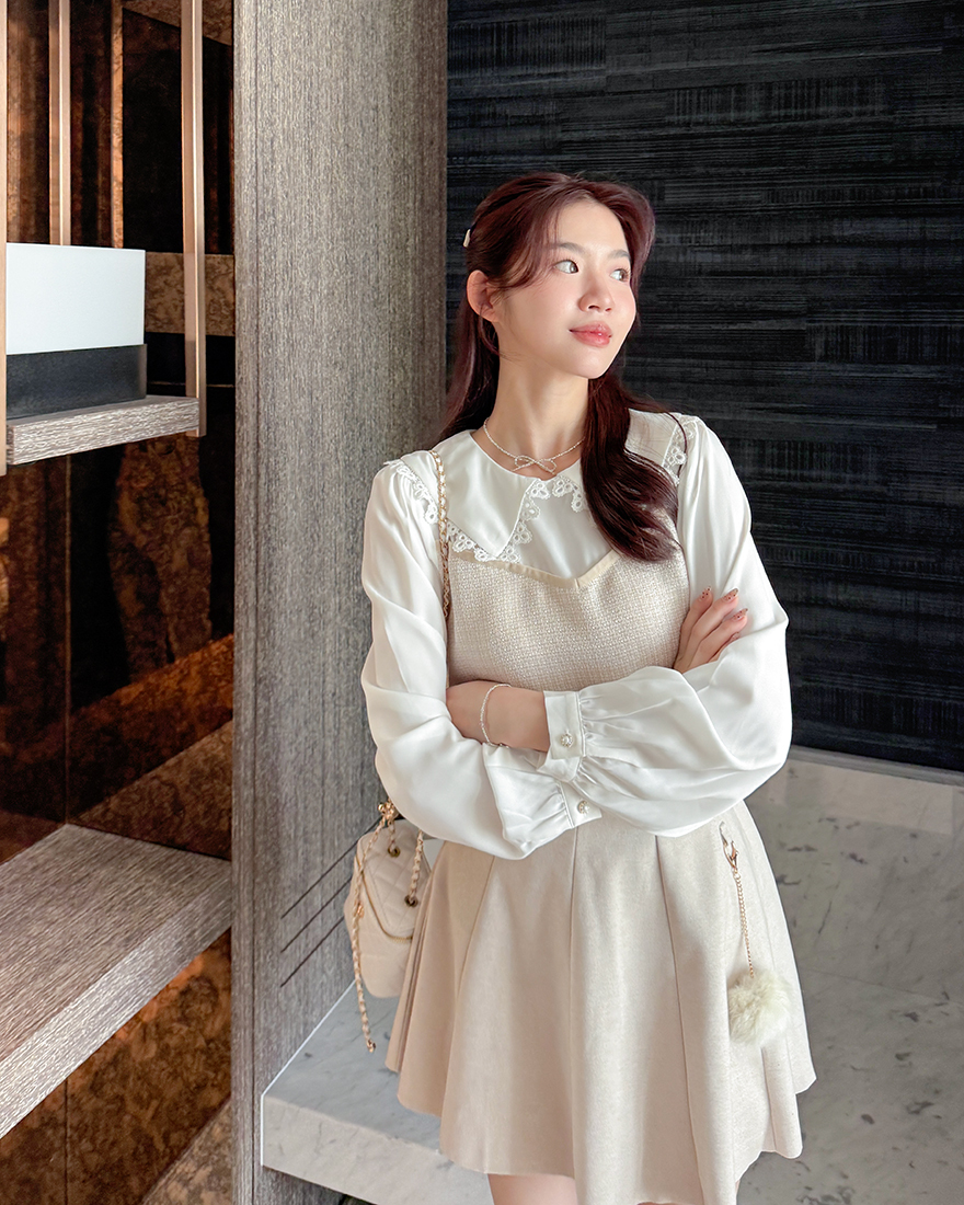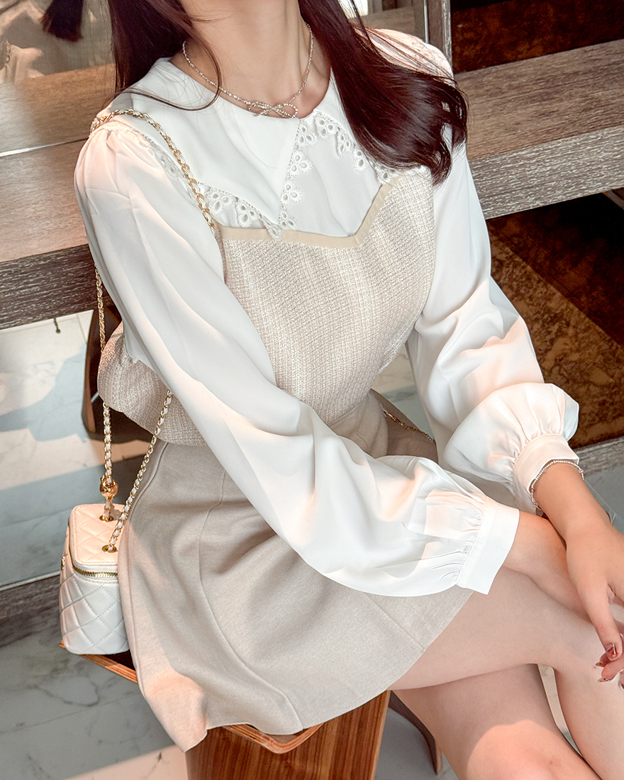 LINA LINA貴氣甜氛緹花翻領織紋假兩件上衣-奶茶杏