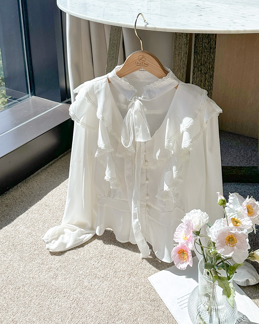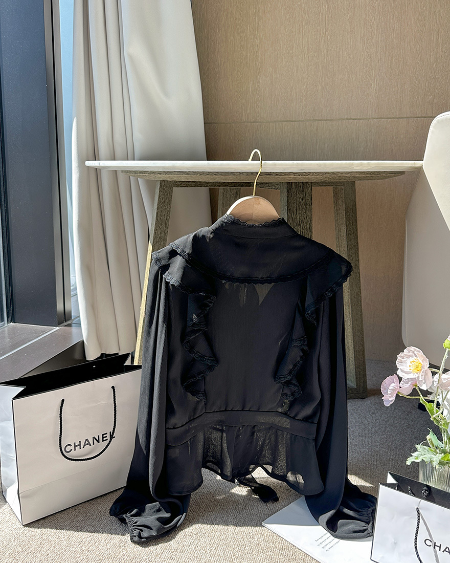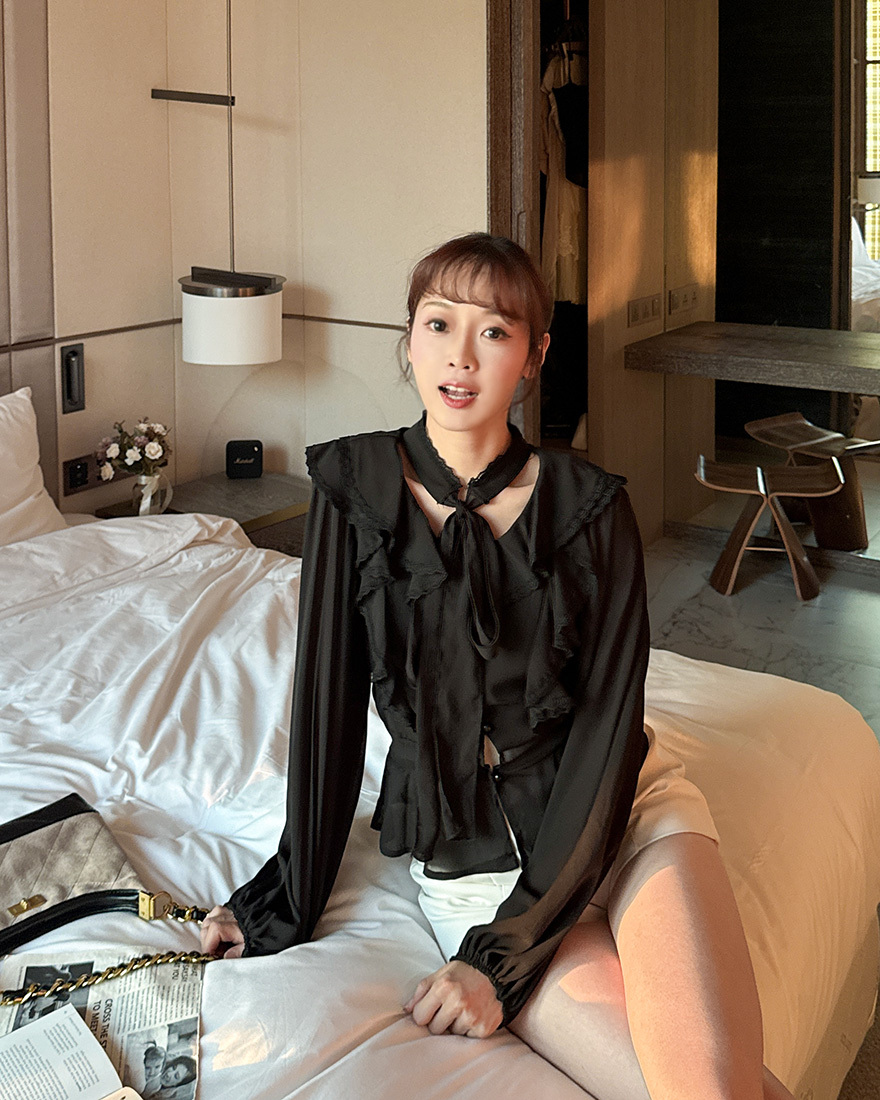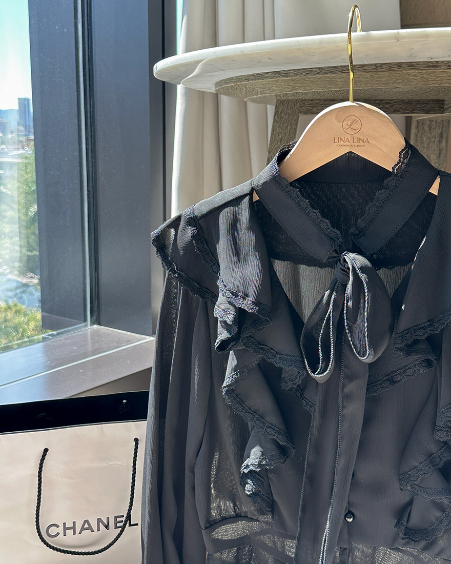 LINA LINA優雅摯愛層次蕾絲荷葉滾邊綁結上衣-貴氣黑