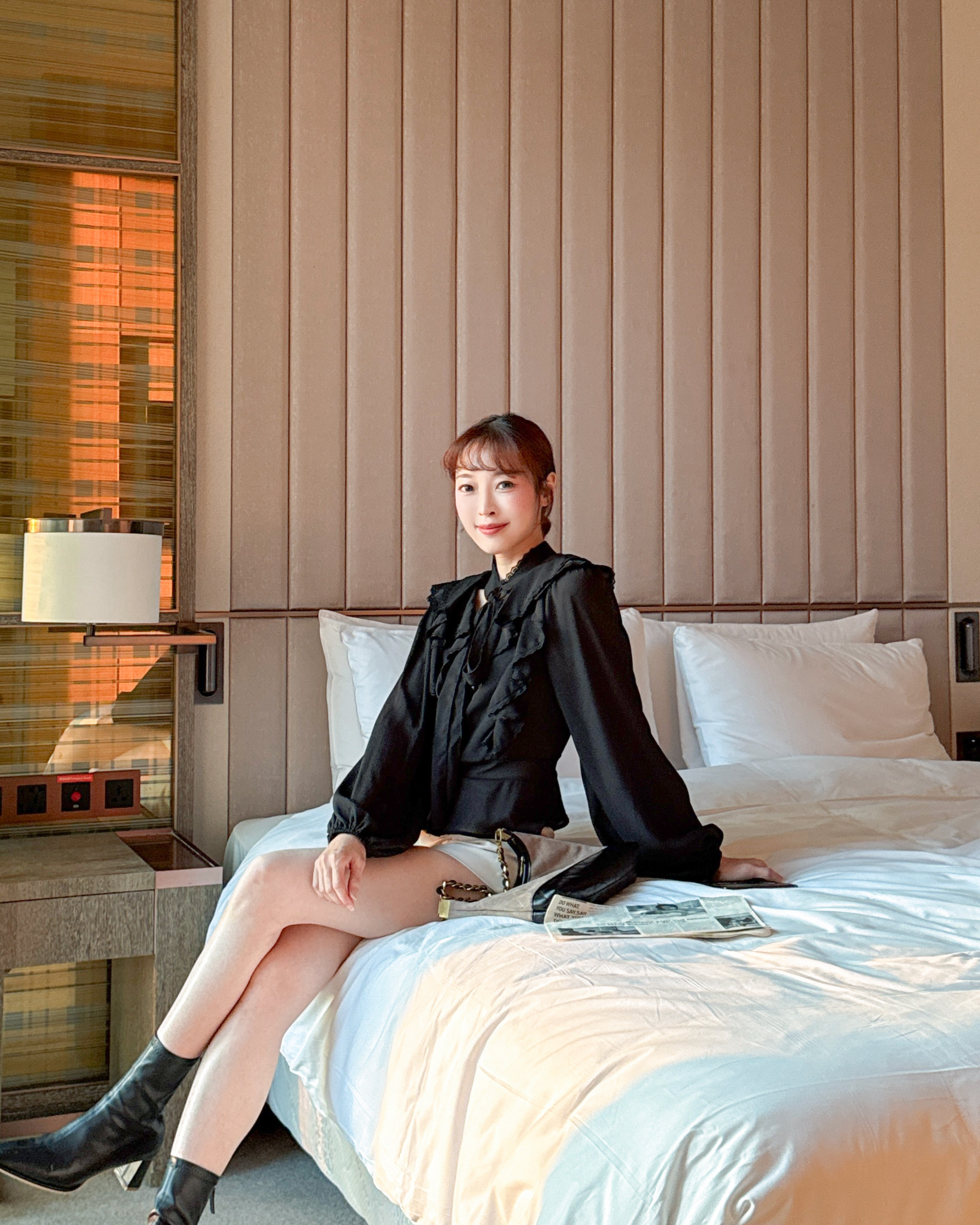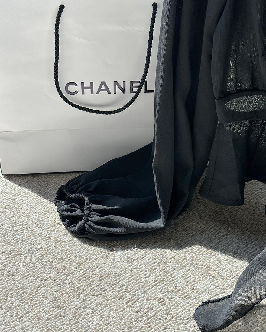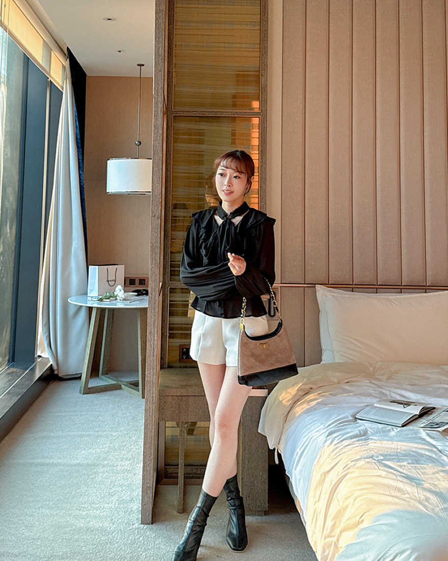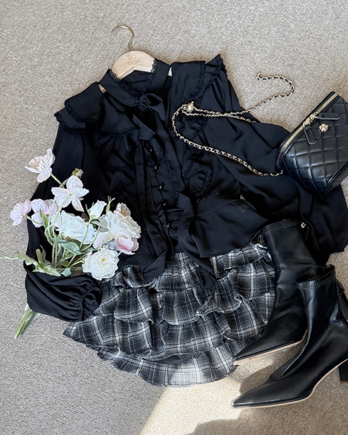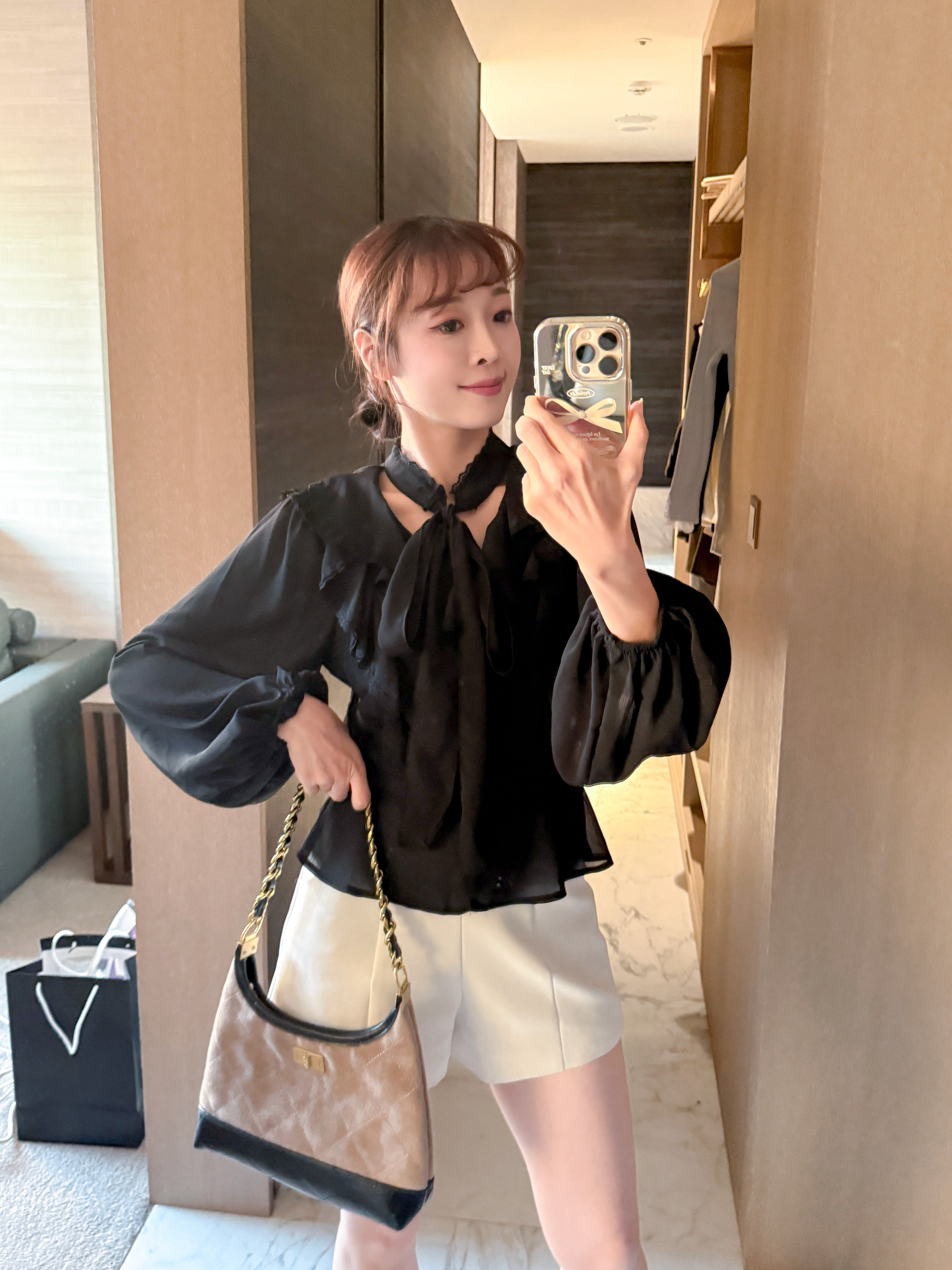 LINA LINA優雅摯愛層次蕾絲荷葉滾邊綁結上衣-貴氣黑