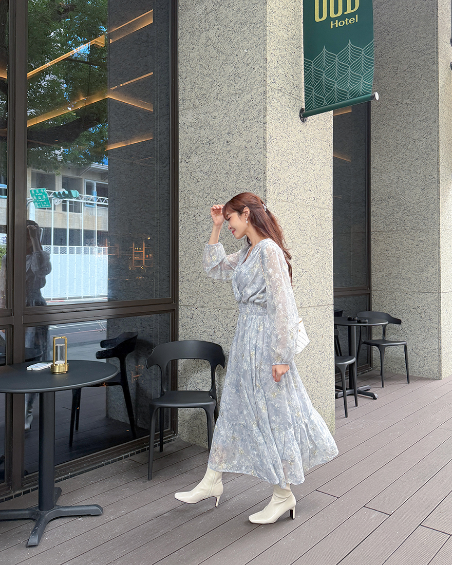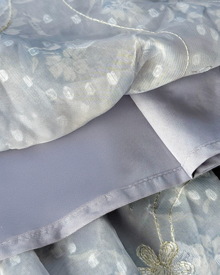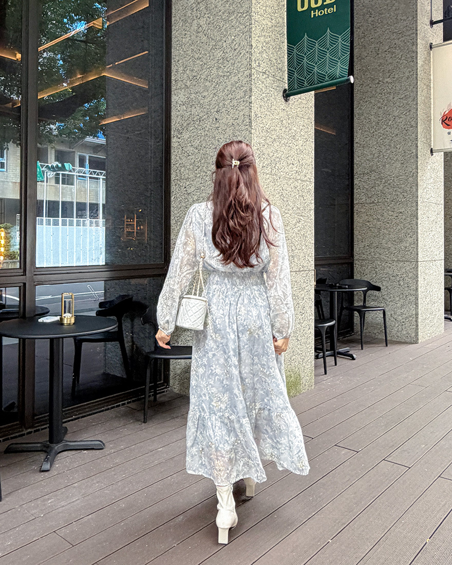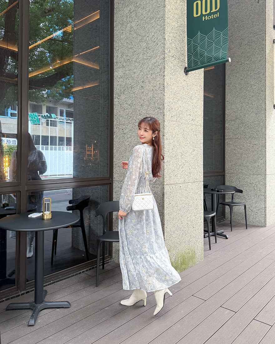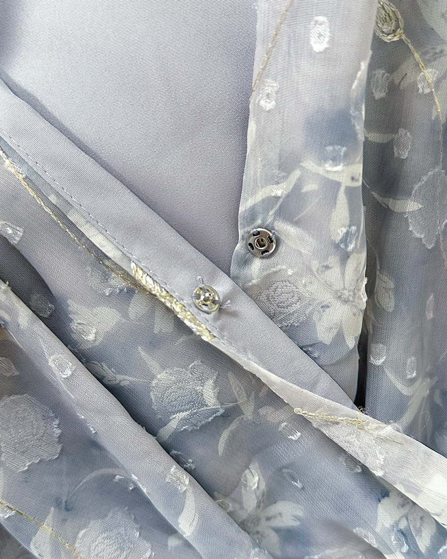 帶點暈染感的雪紡面料佈滿了白色花卉