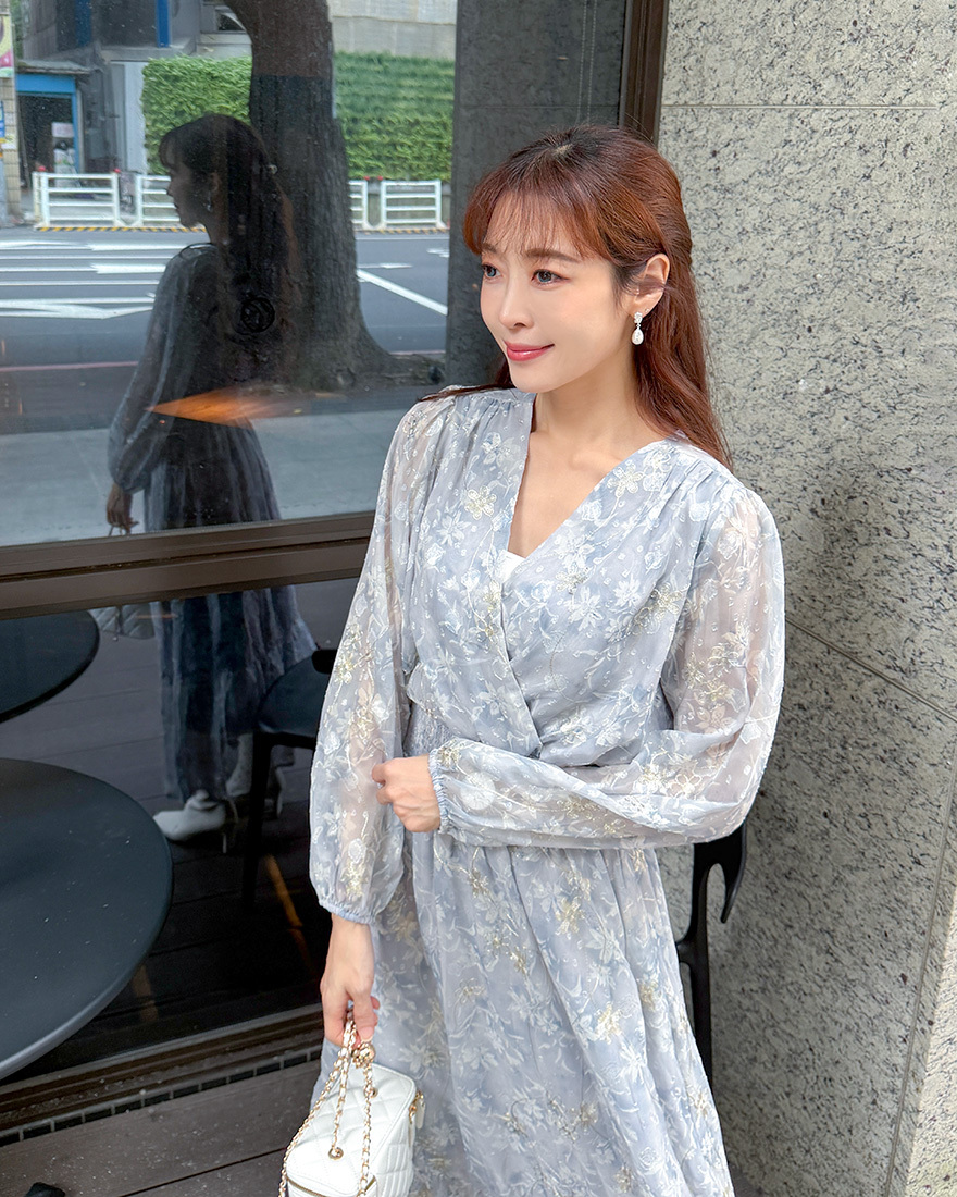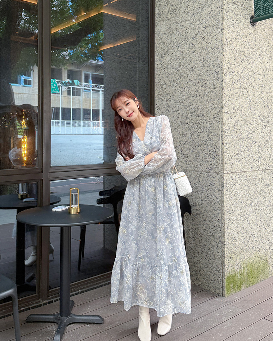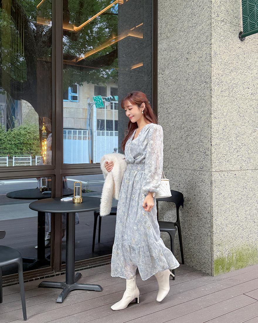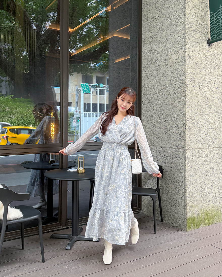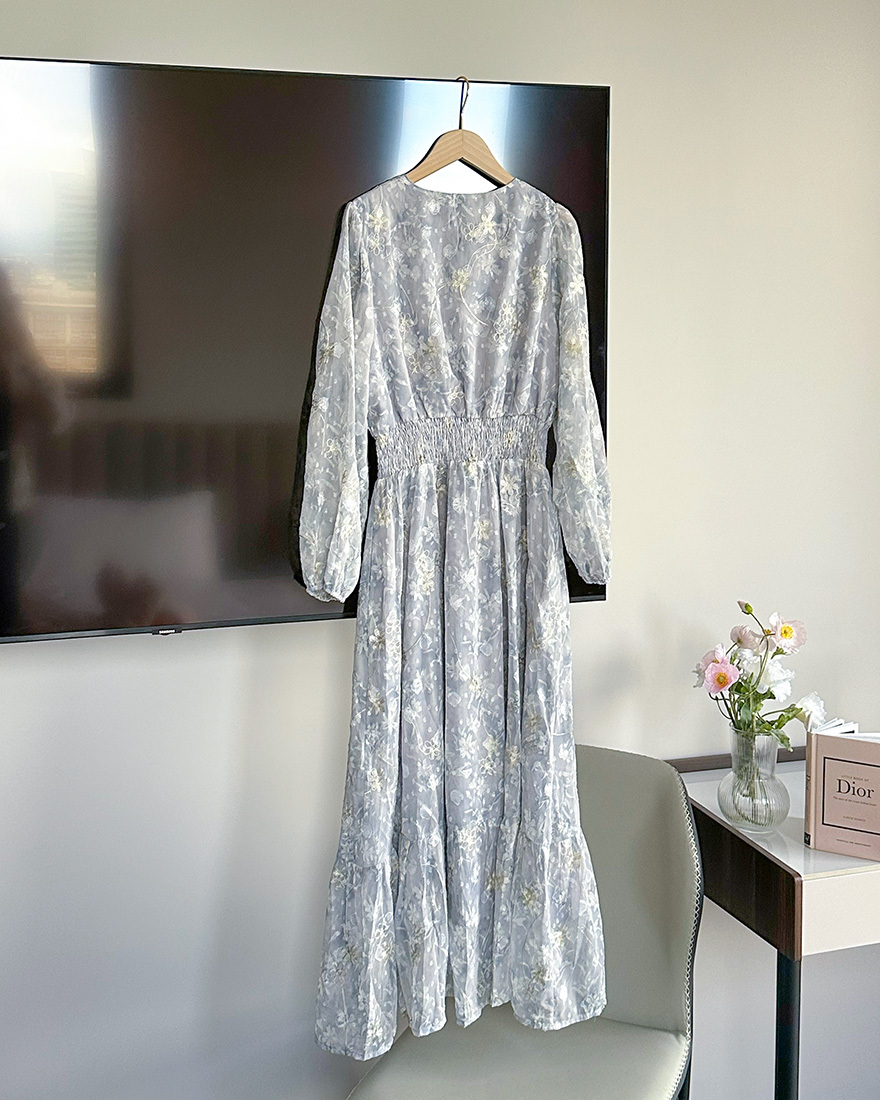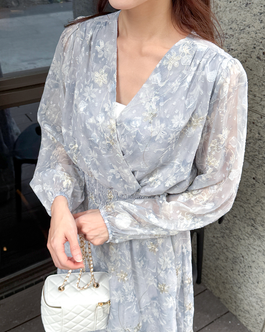 帶點暈染感的雪紡面料佈滿了白色花卉