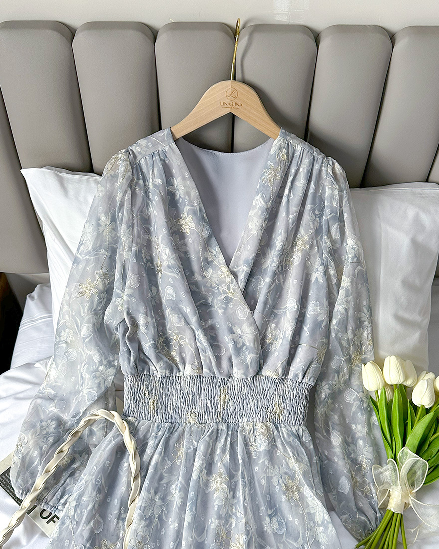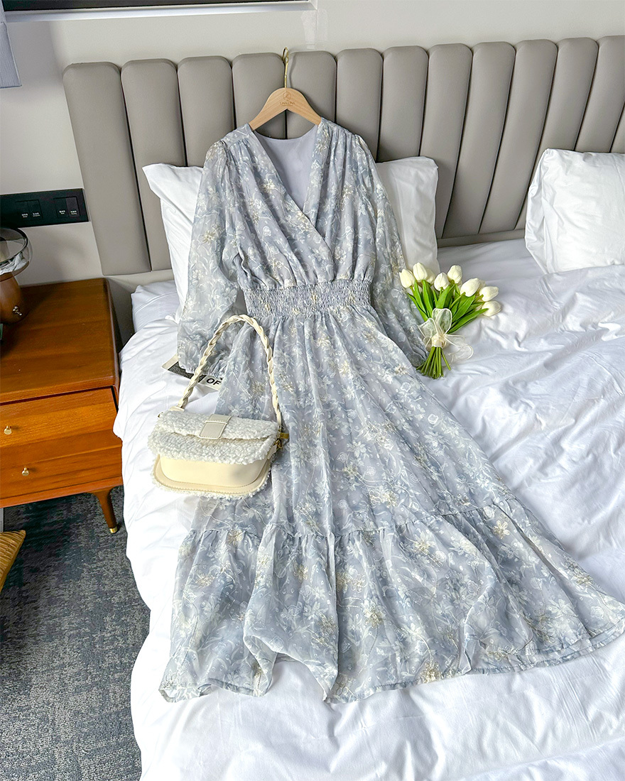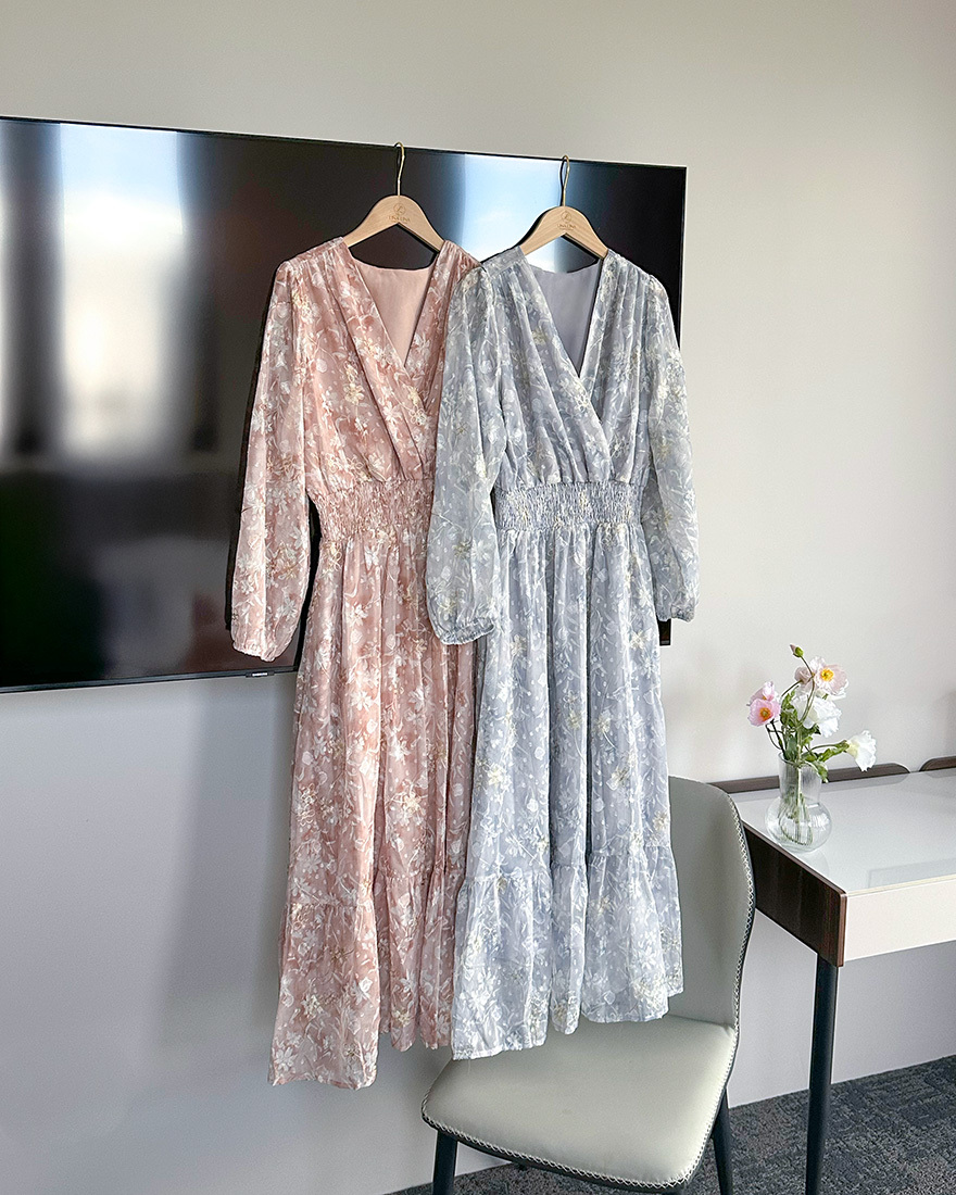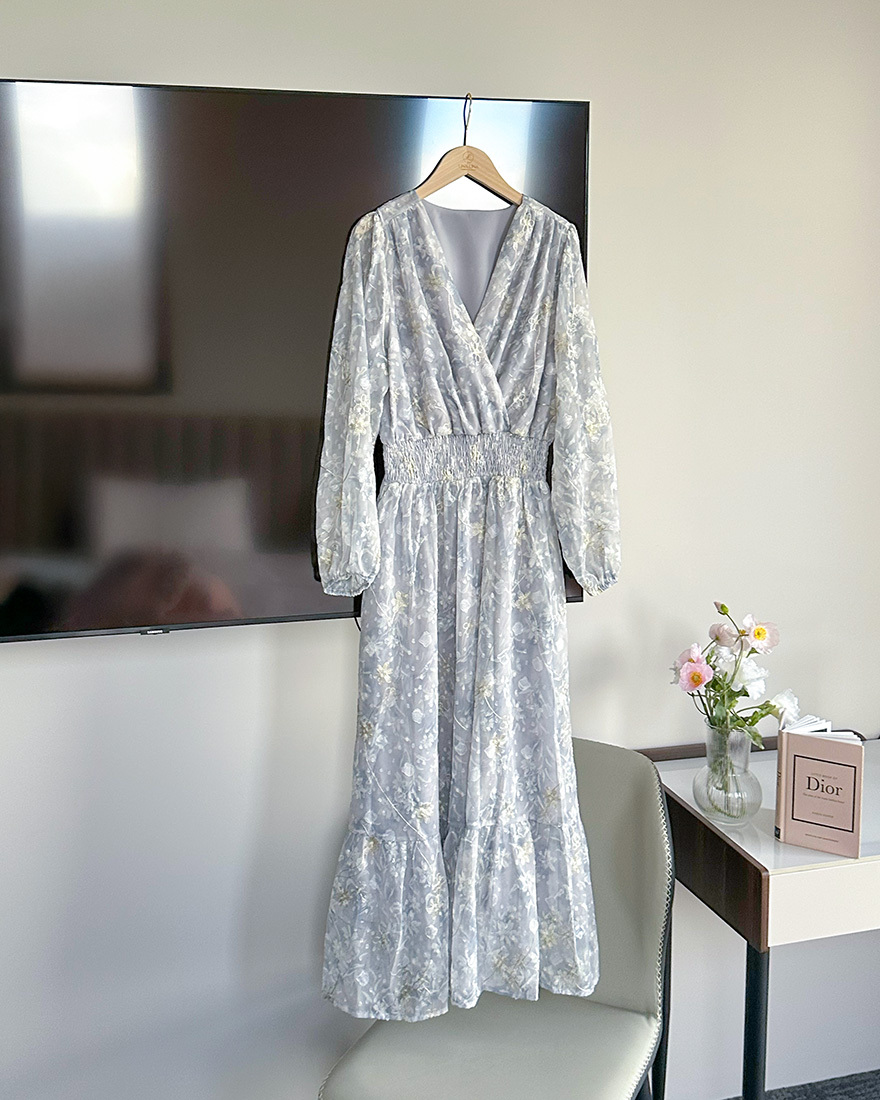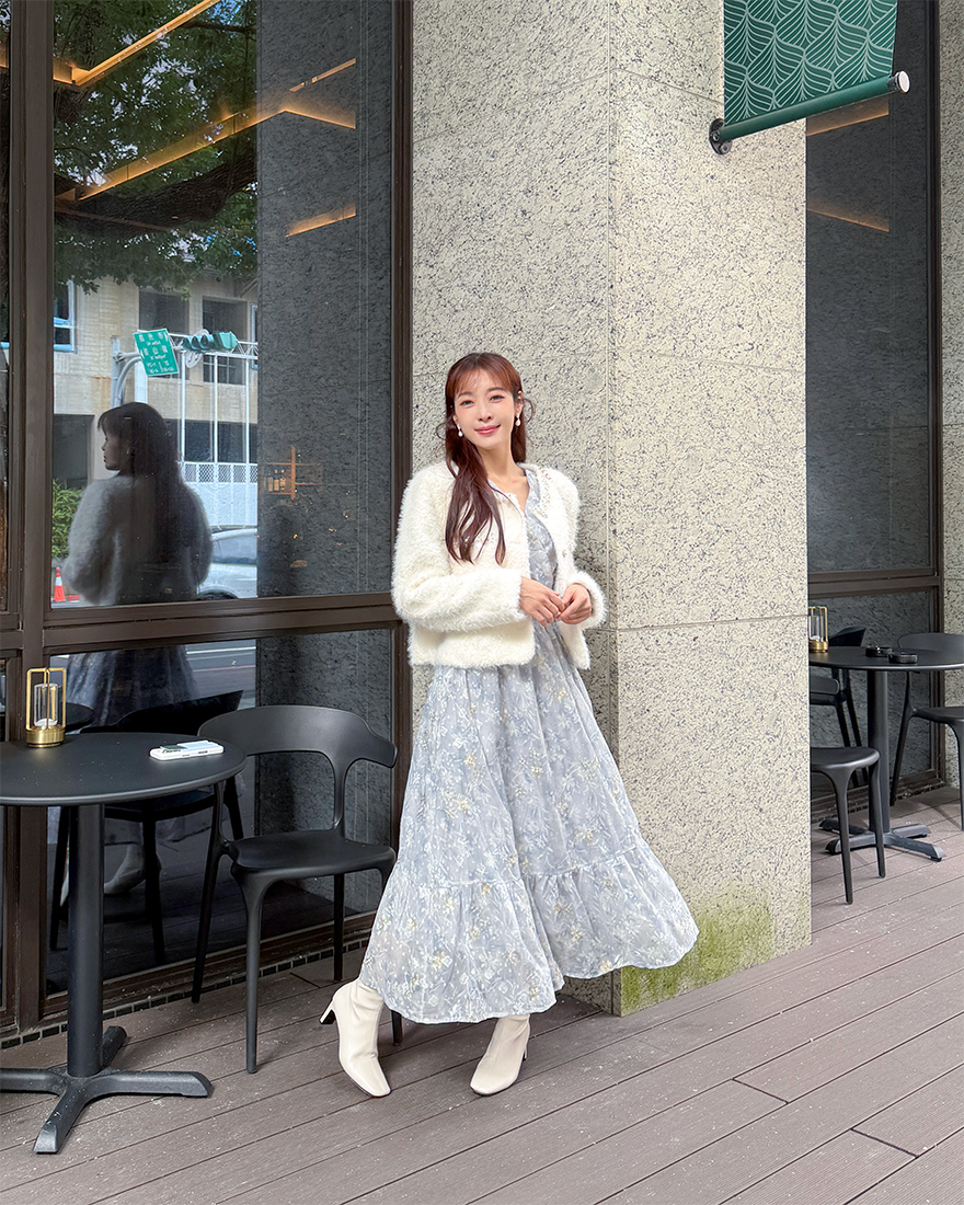 帶點暈染感的雪紡面料佈滿了白色花卉