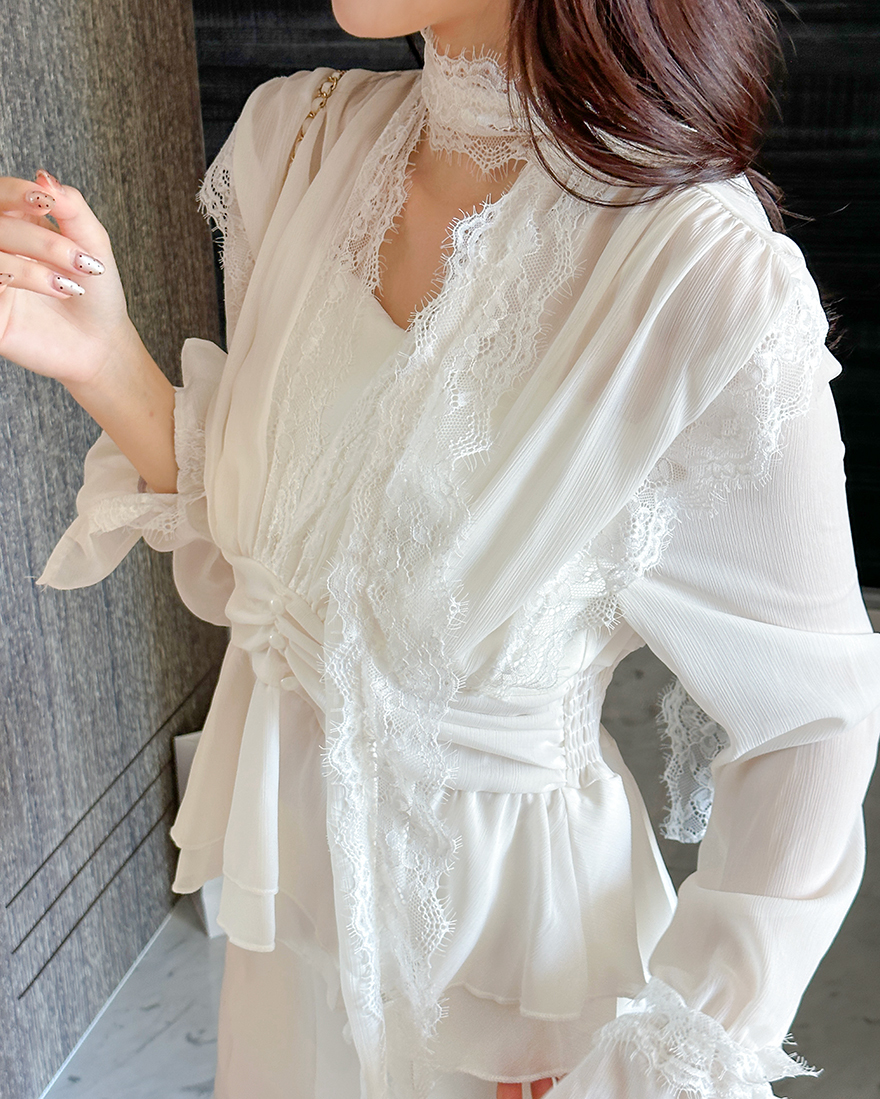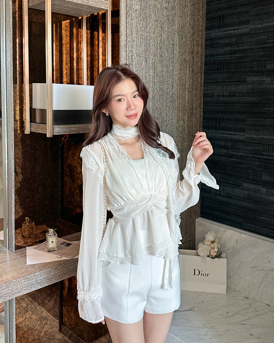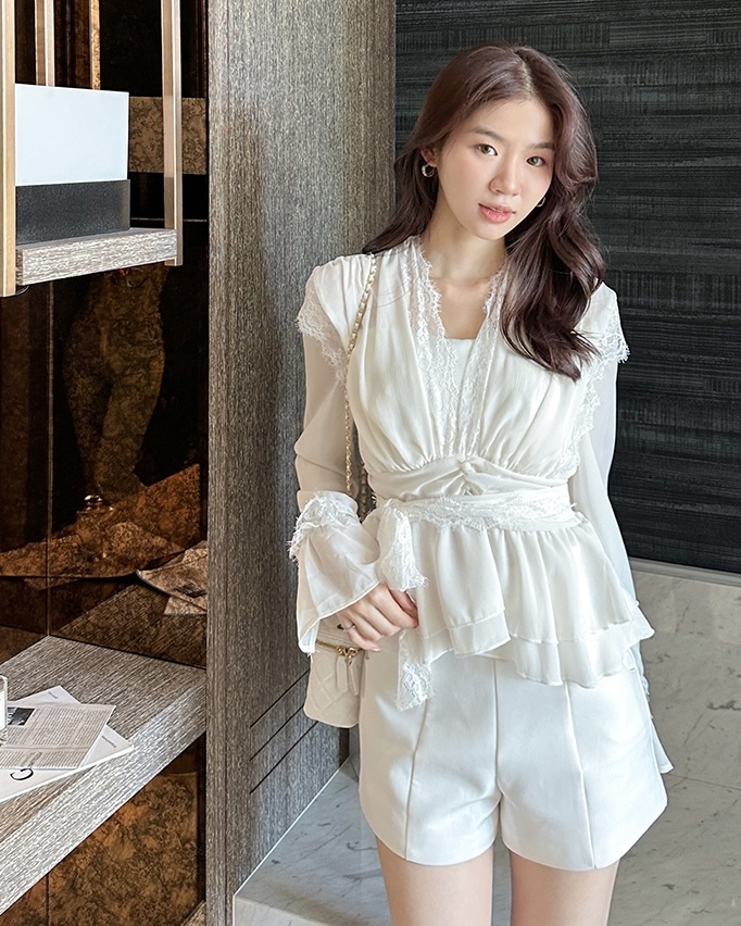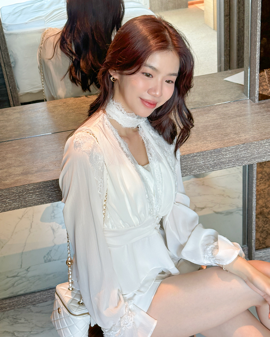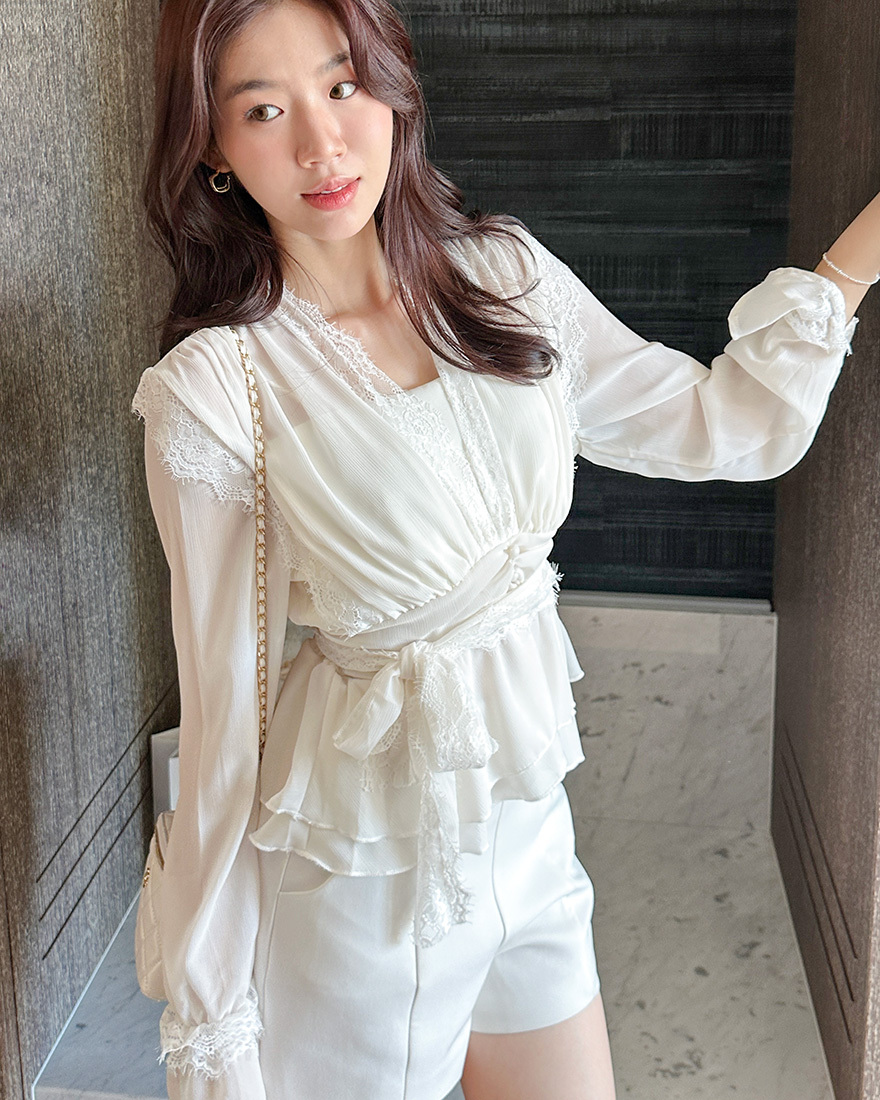 LINA LINA唯美吟詩蕾絲滾邊假兩件胸墊上衣附繞帶-氣質白