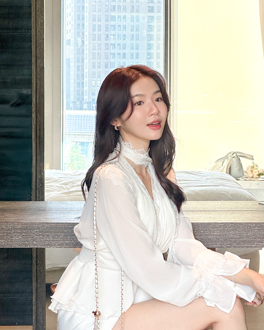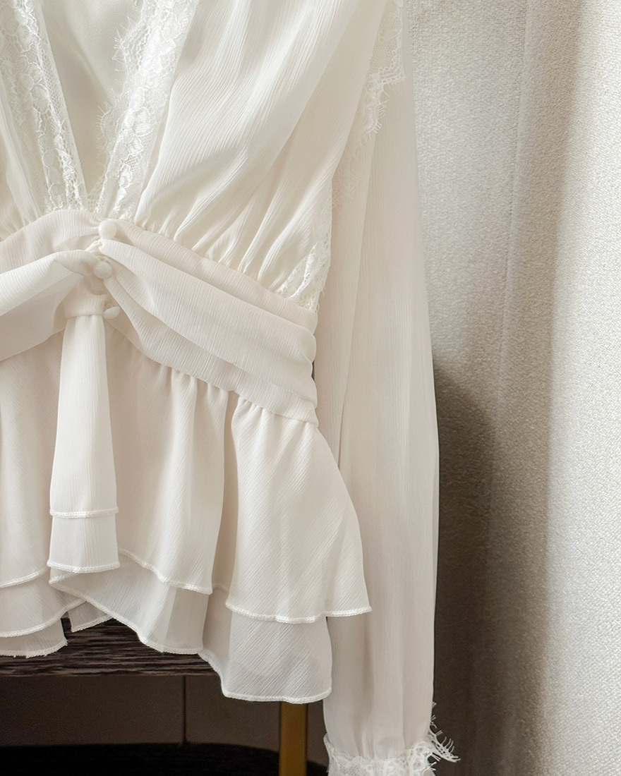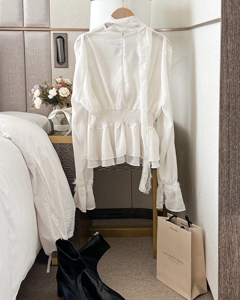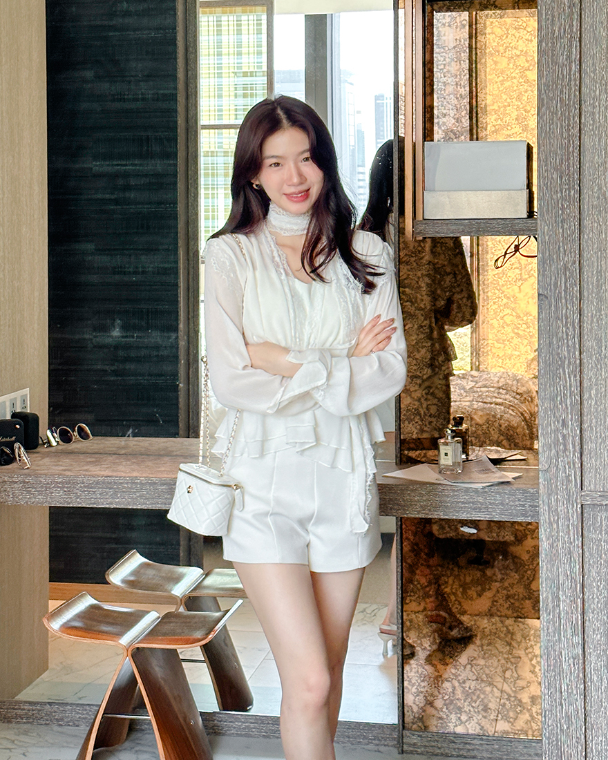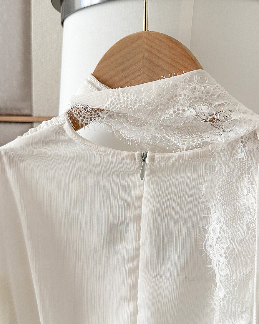 LINA LINA唯美吟詩蕾絲滾邊假兩件胸墊上衣附繞帶-氣質白