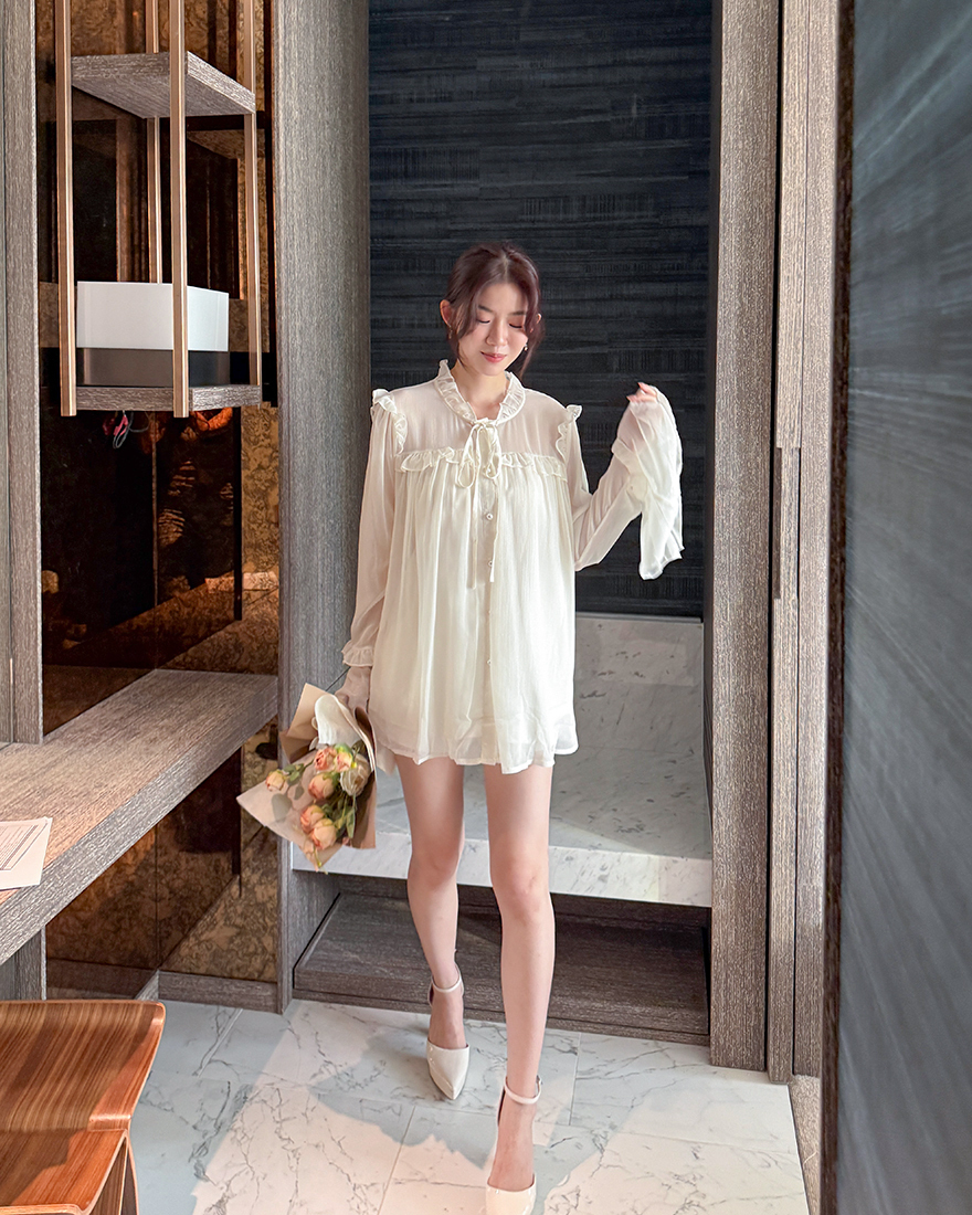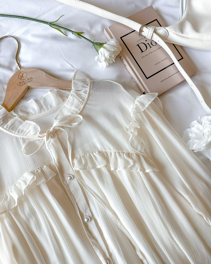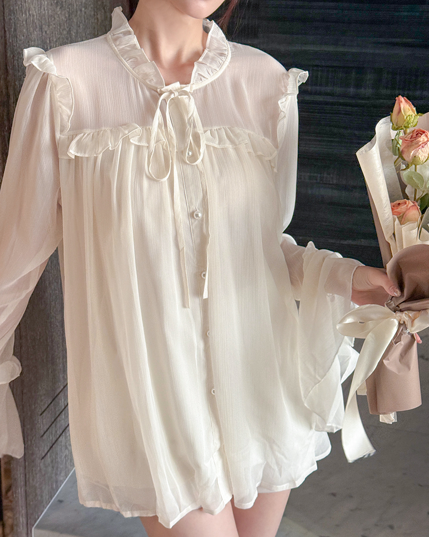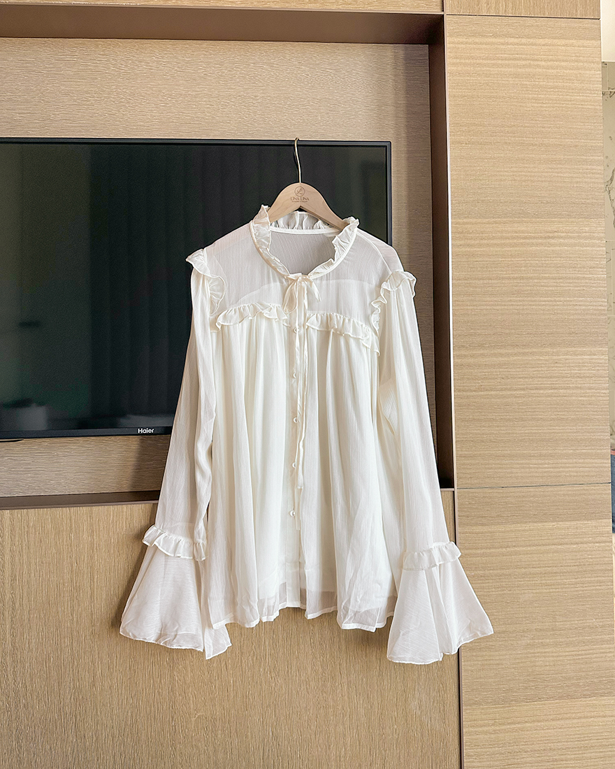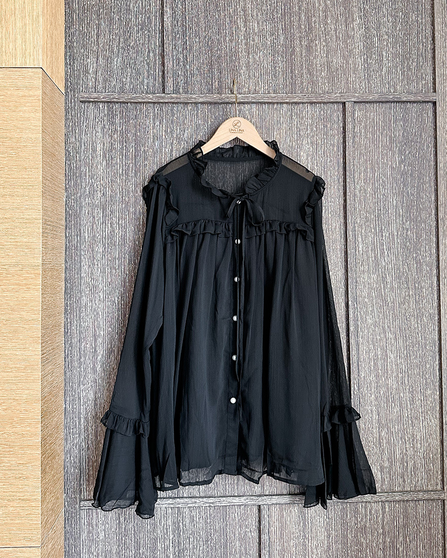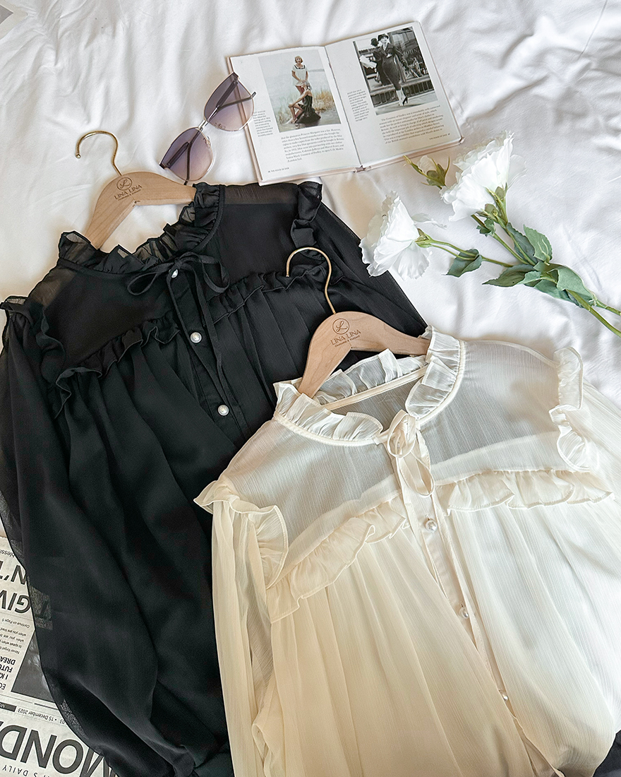 LINA LINA浪漫悸動壓褶荷葉滾邊珍珠釦上衣洋-奶油杏