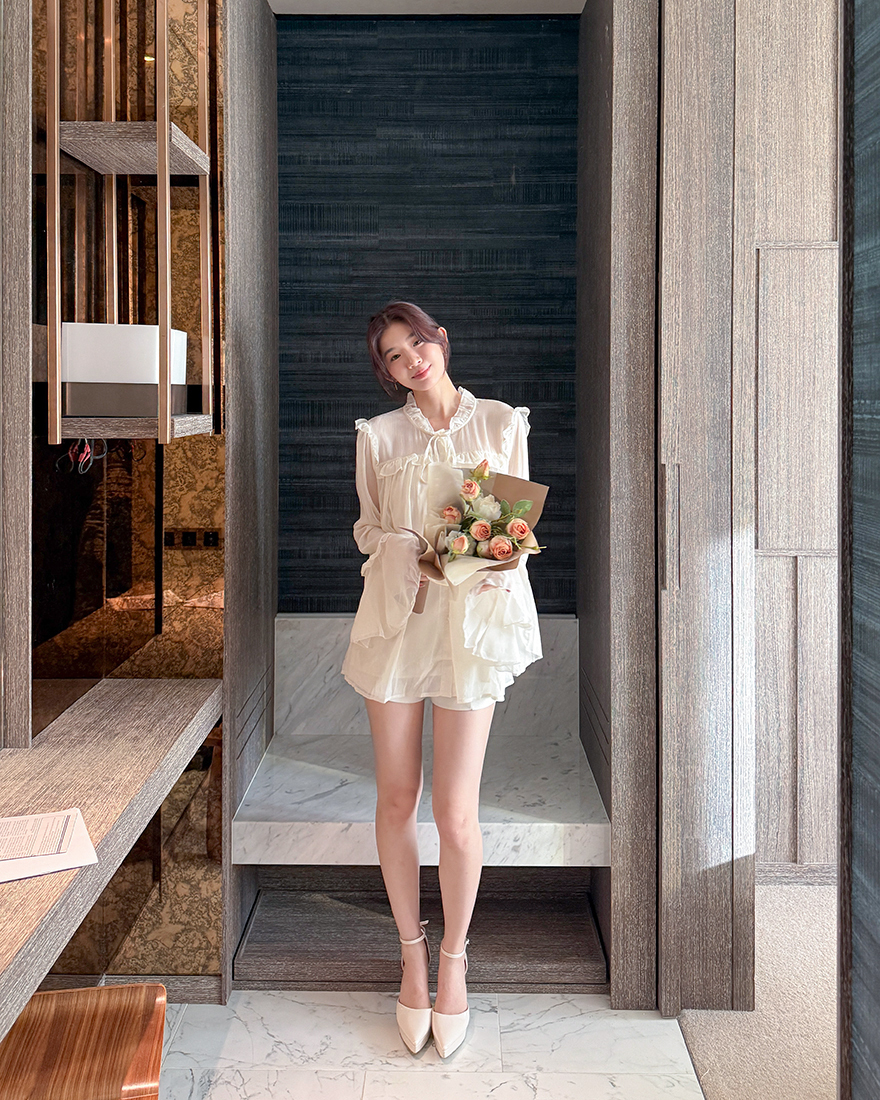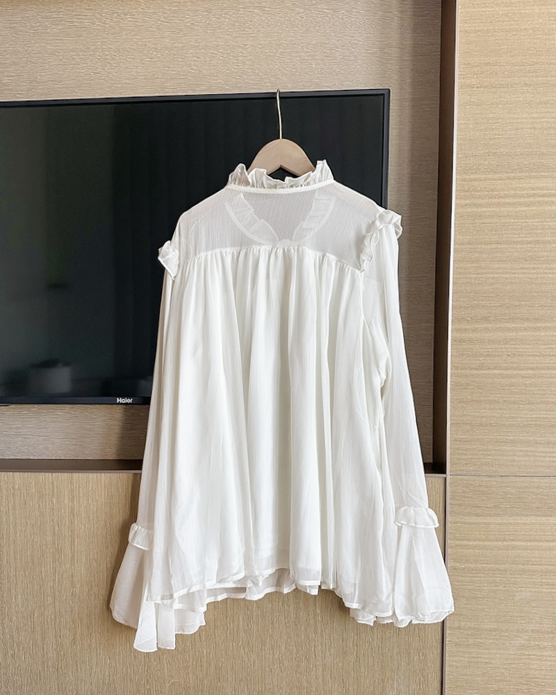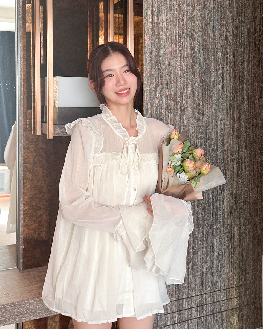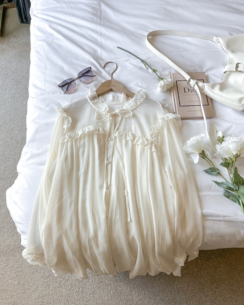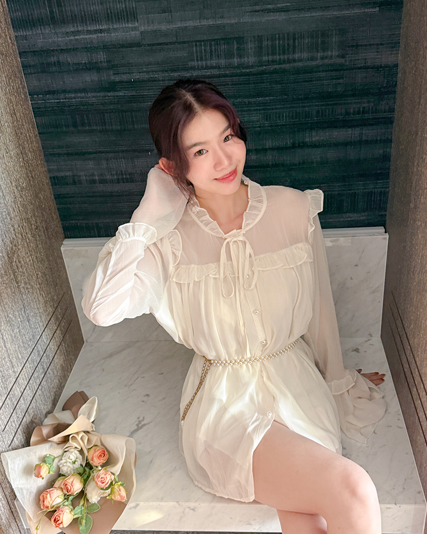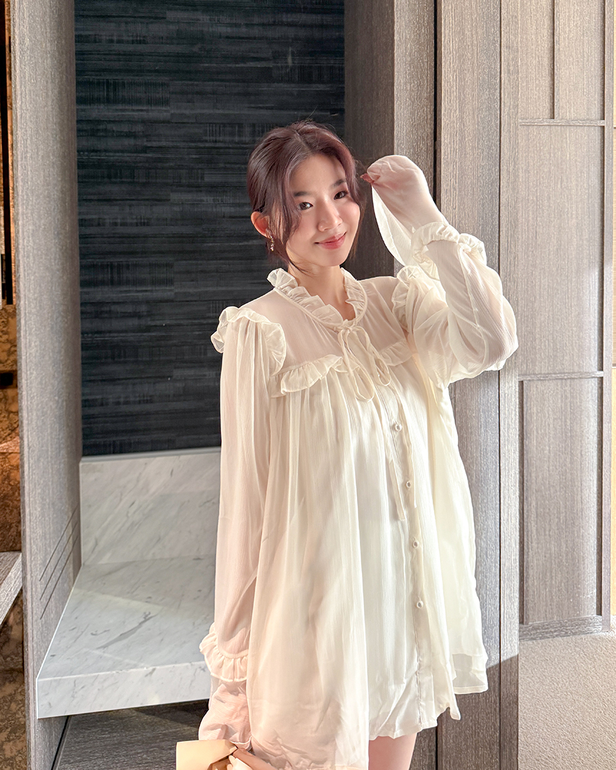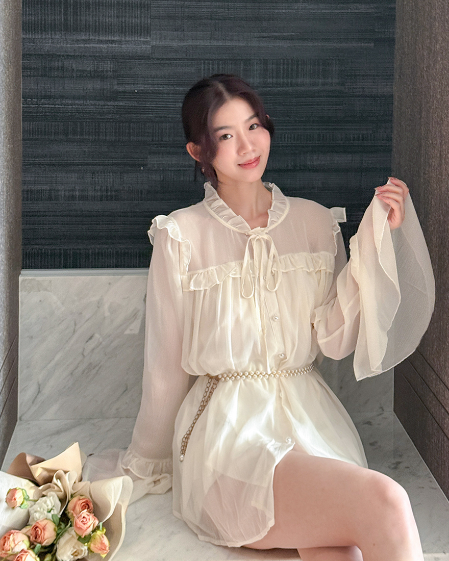 LINA LINA浪漫悸動壓褶荷葉滾邊珍珠釦上衣洋-奶油杏