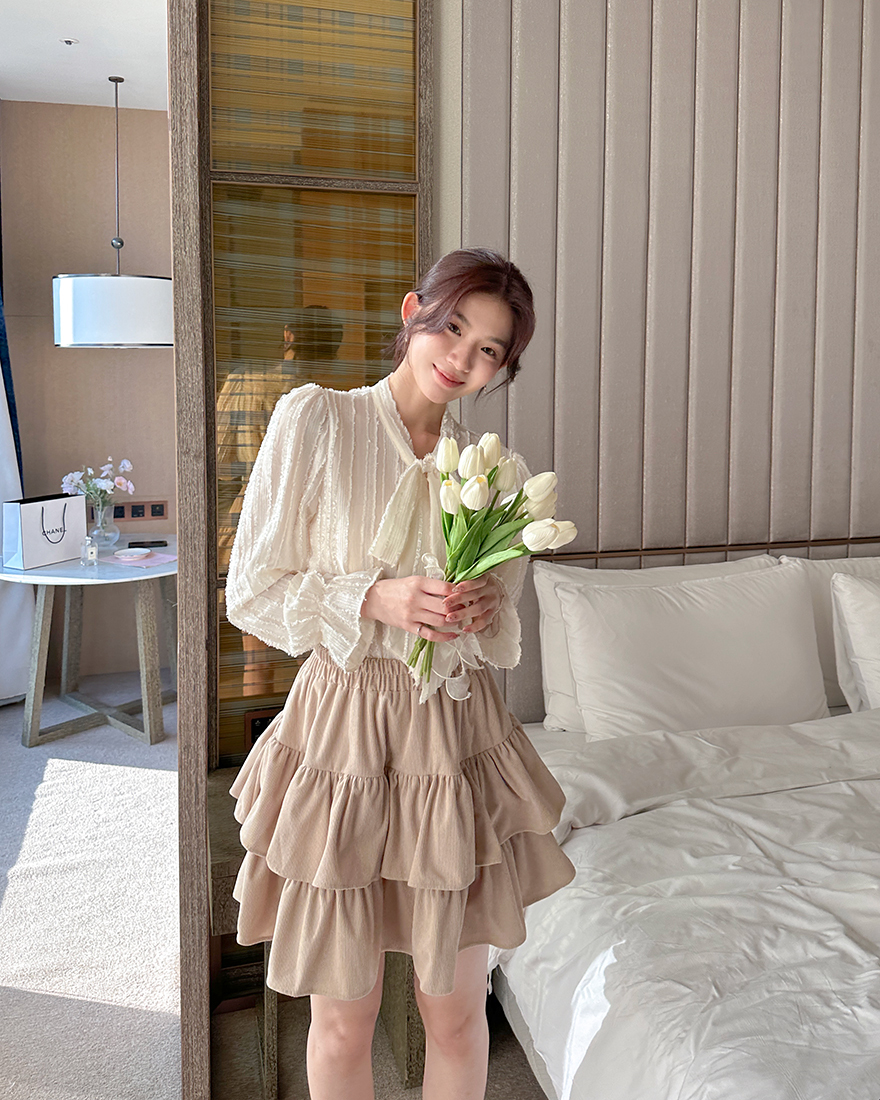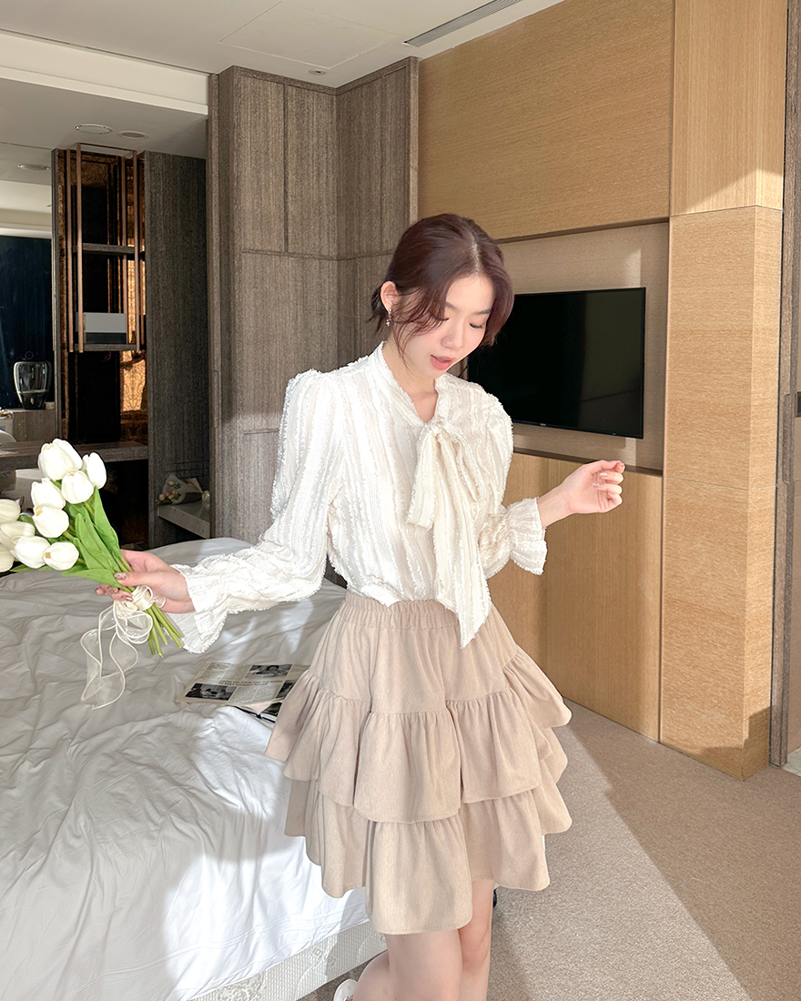 LINA LINA氣質女伶立體抽鬚織紋蝴蝶綁結上衣-優雅杏