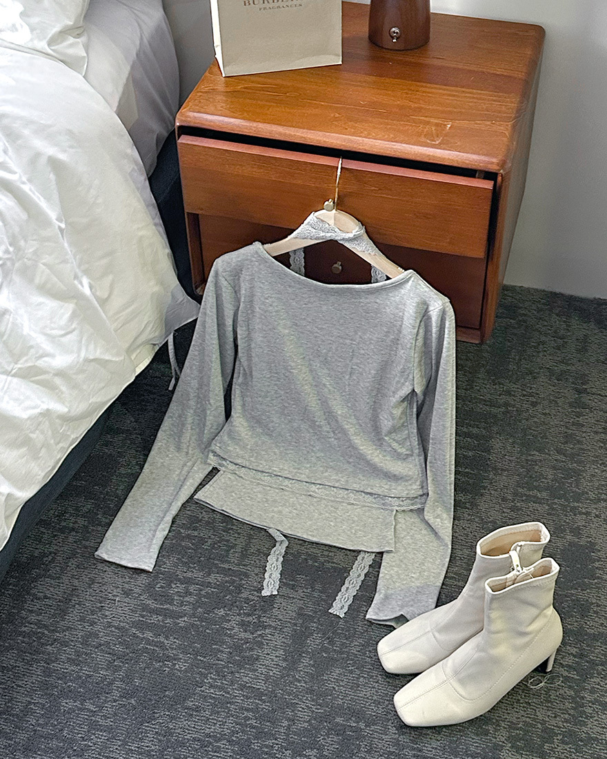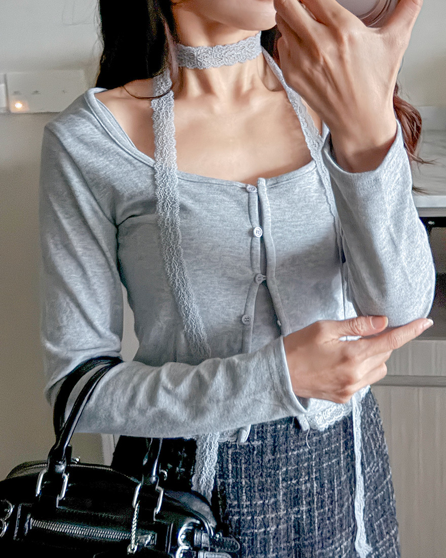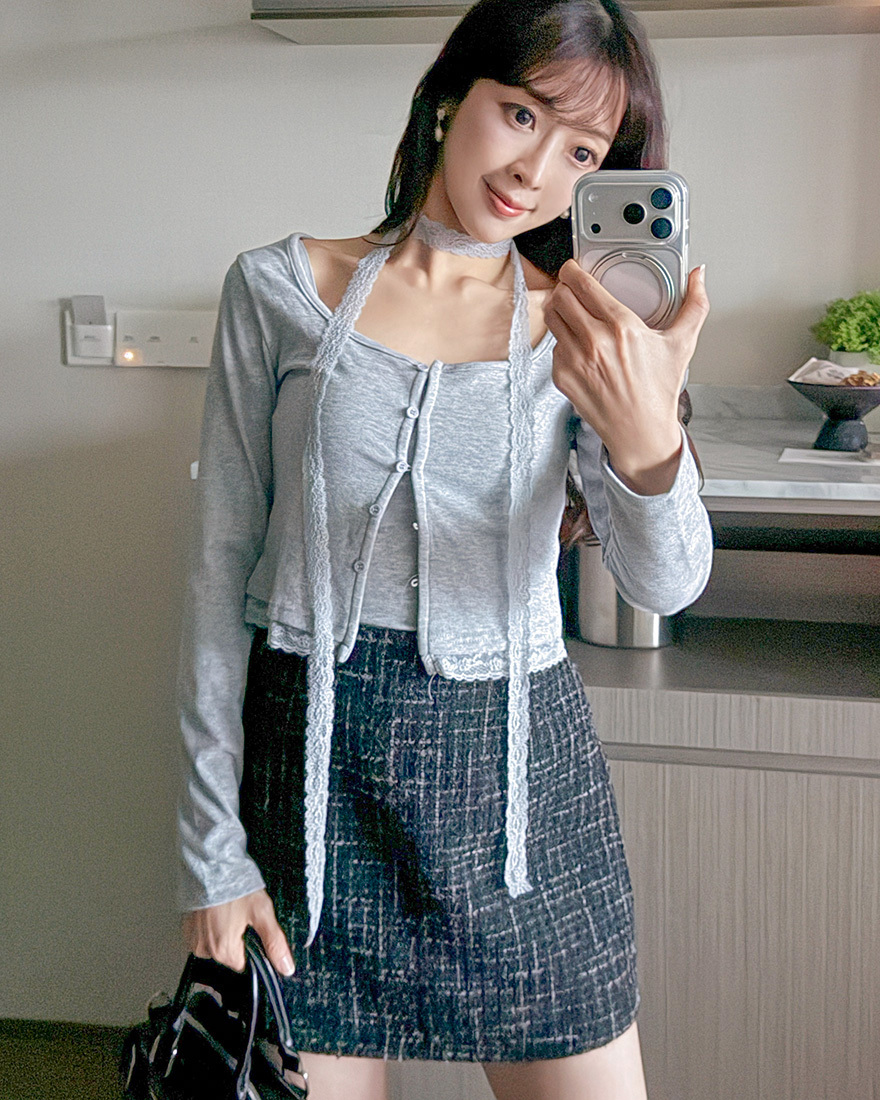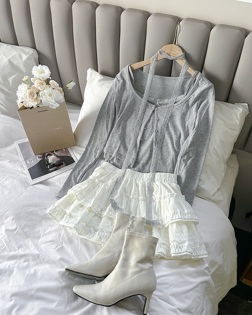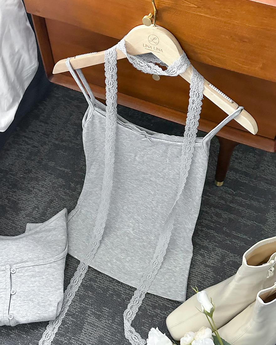 LINA LINA換乘戀愛蕾絲外套背心繞帶三件組-高雅灰