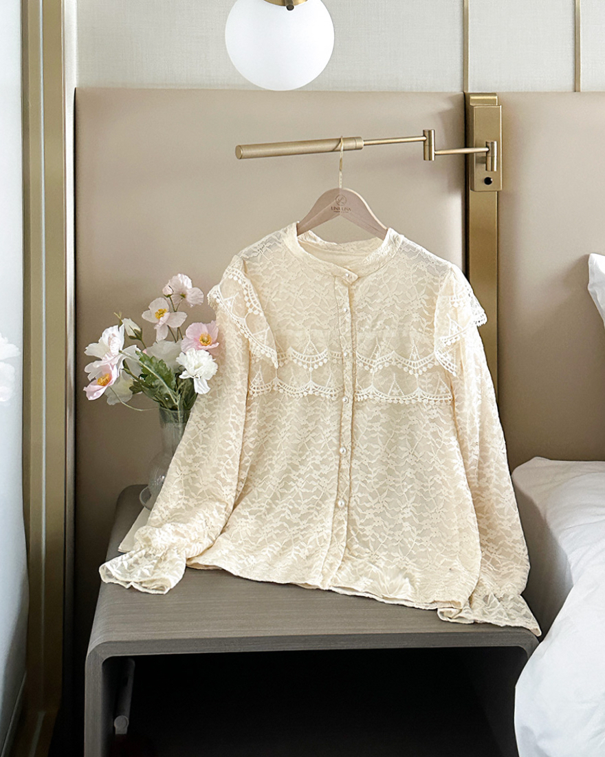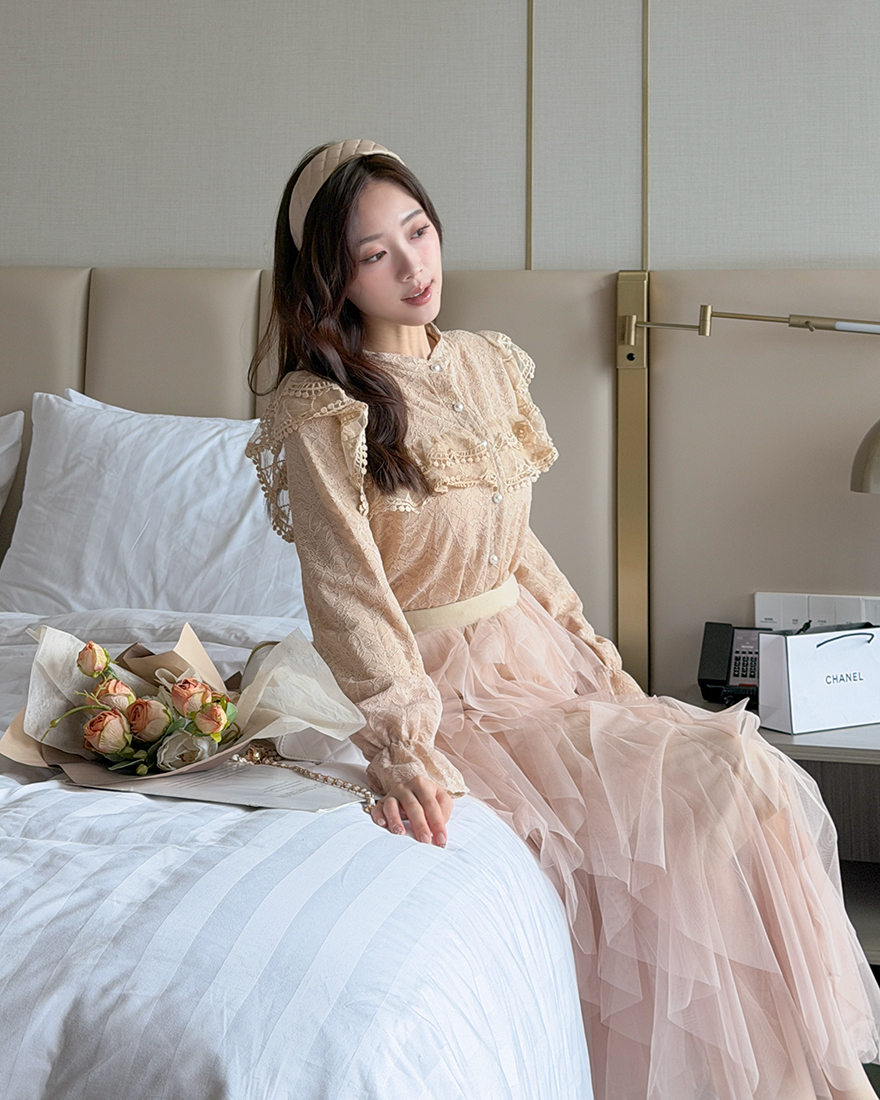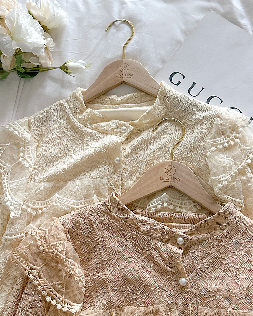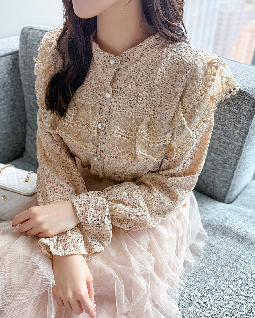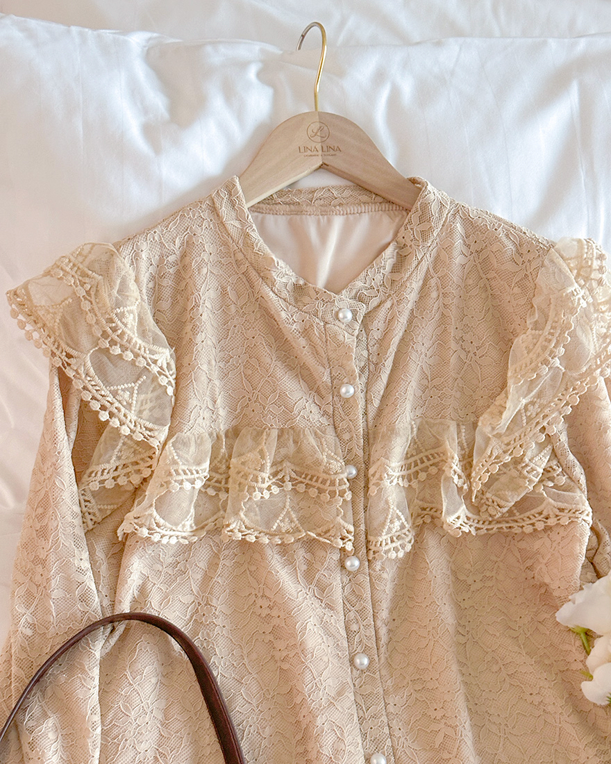 LINA LINA優雅拾光滿版蕾絲網紗滾邊排釦上衣-奶茶卡