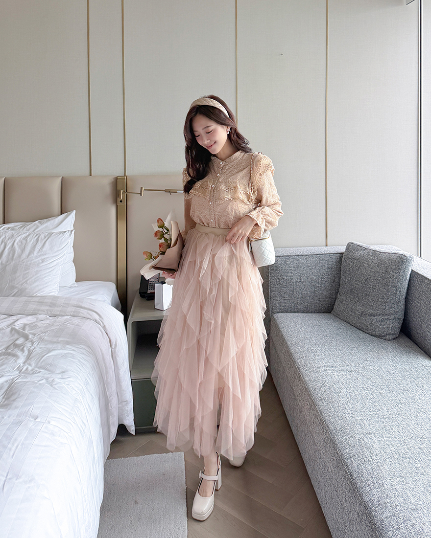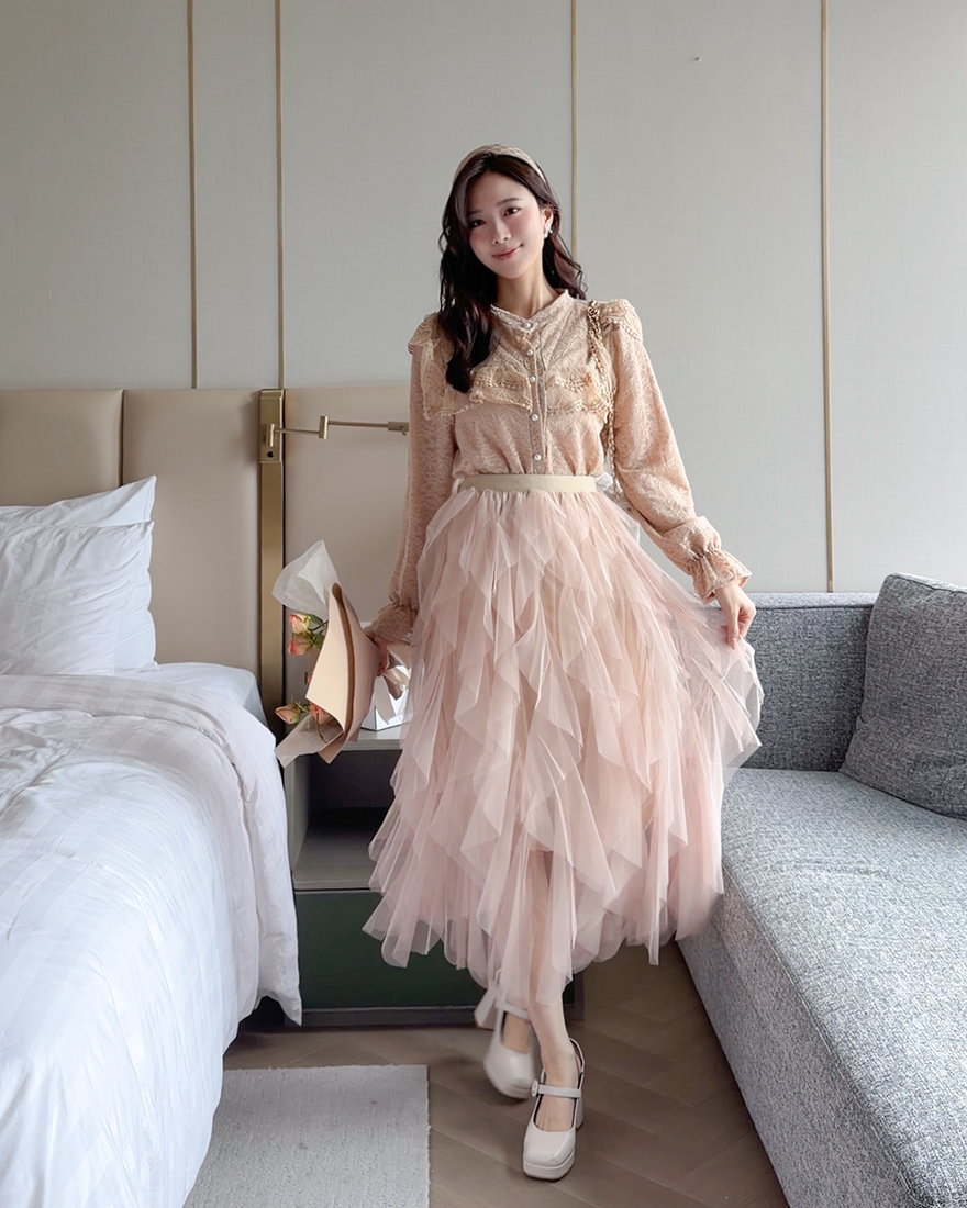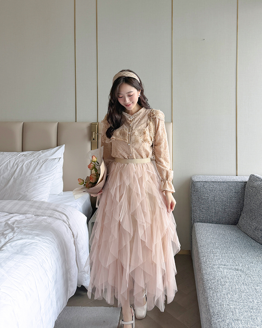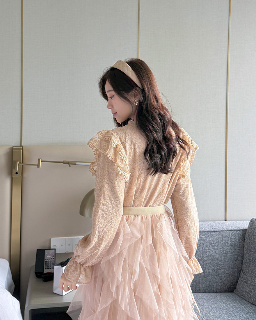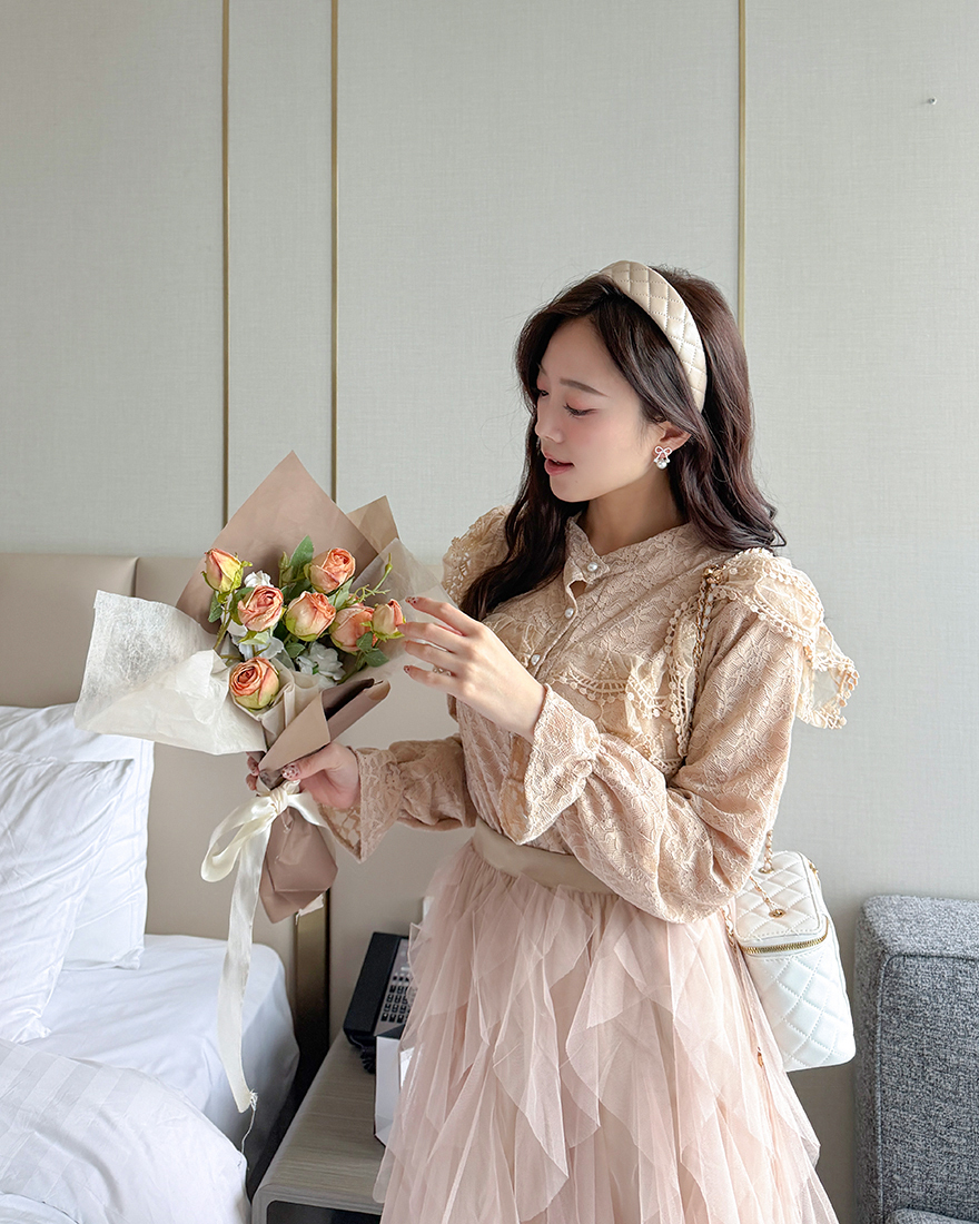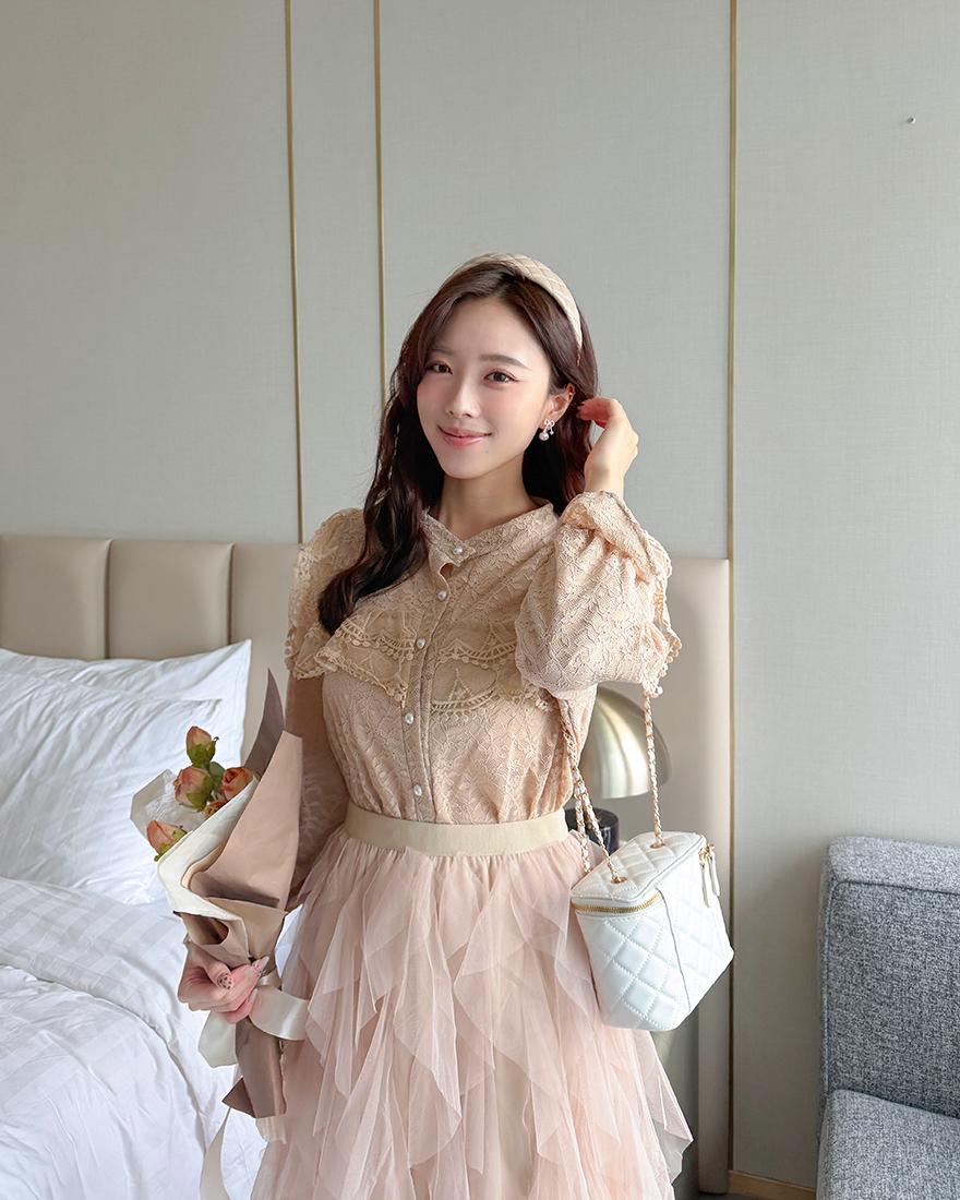 LINA LINA優雅拾光滿版蕾絲網紗滾邊排釦上衣-奶茶卡
