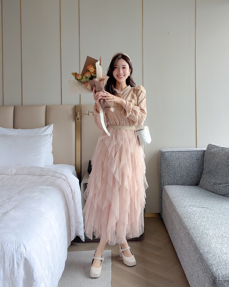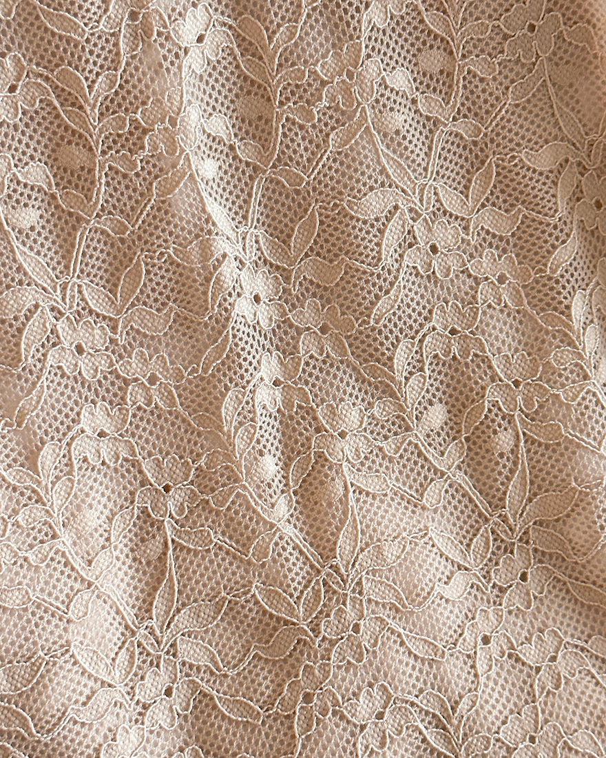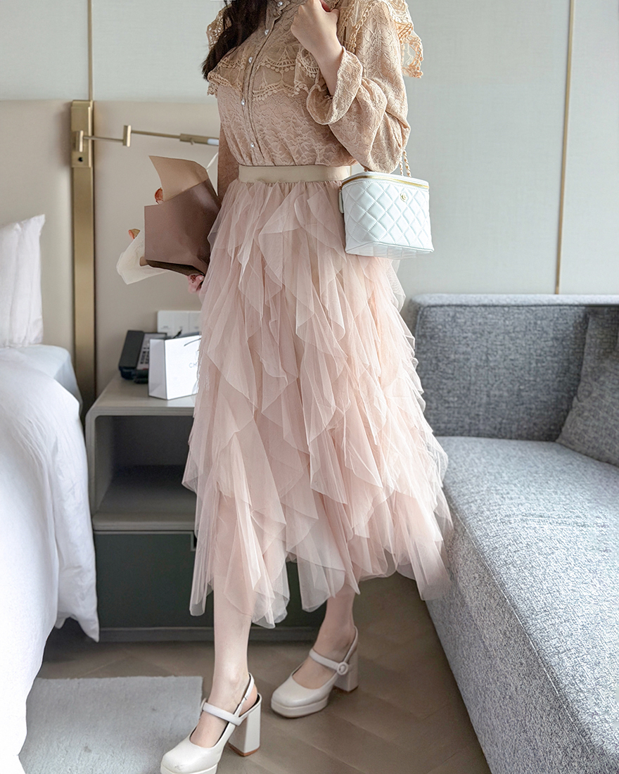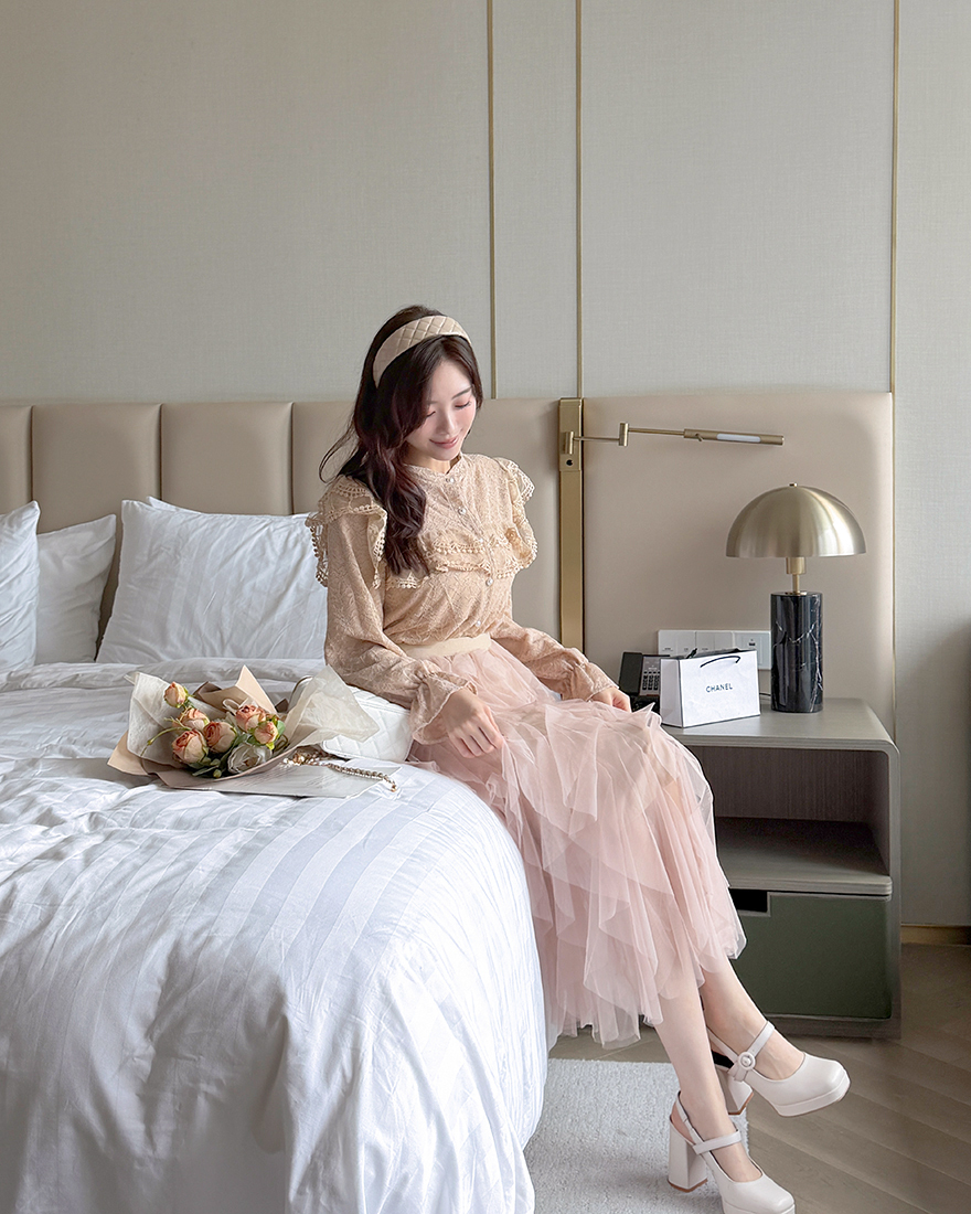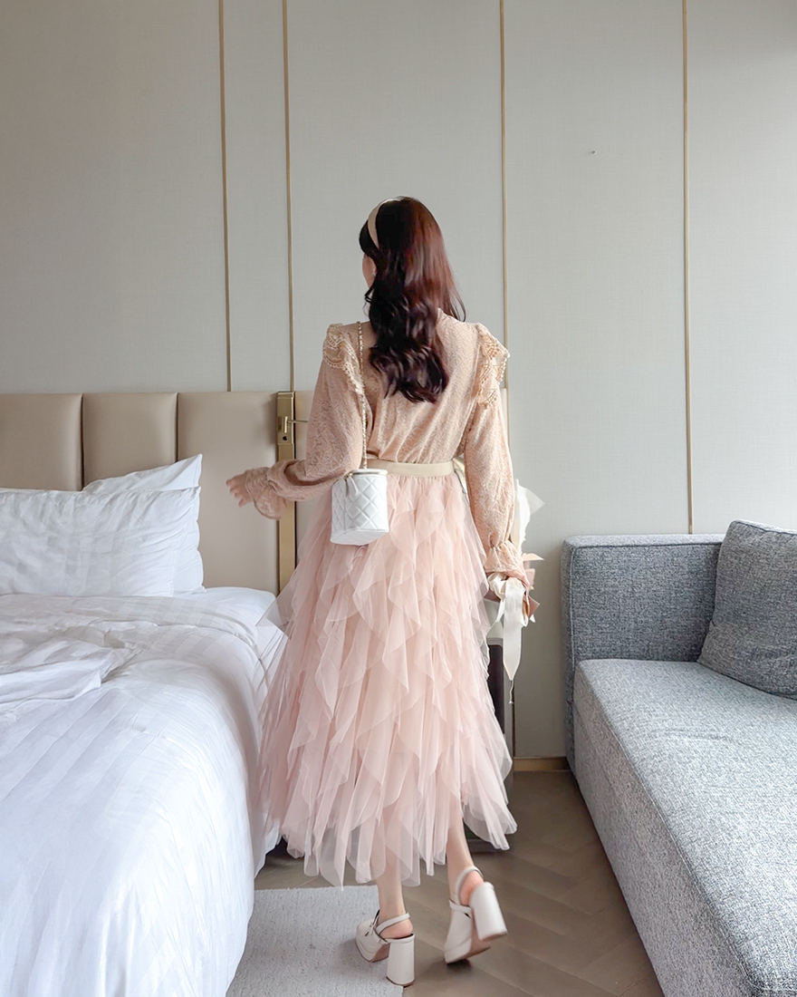 LINA LINA優雅拾光滿版蕾絲網紗滾邊排釦上衣-奶茶卡