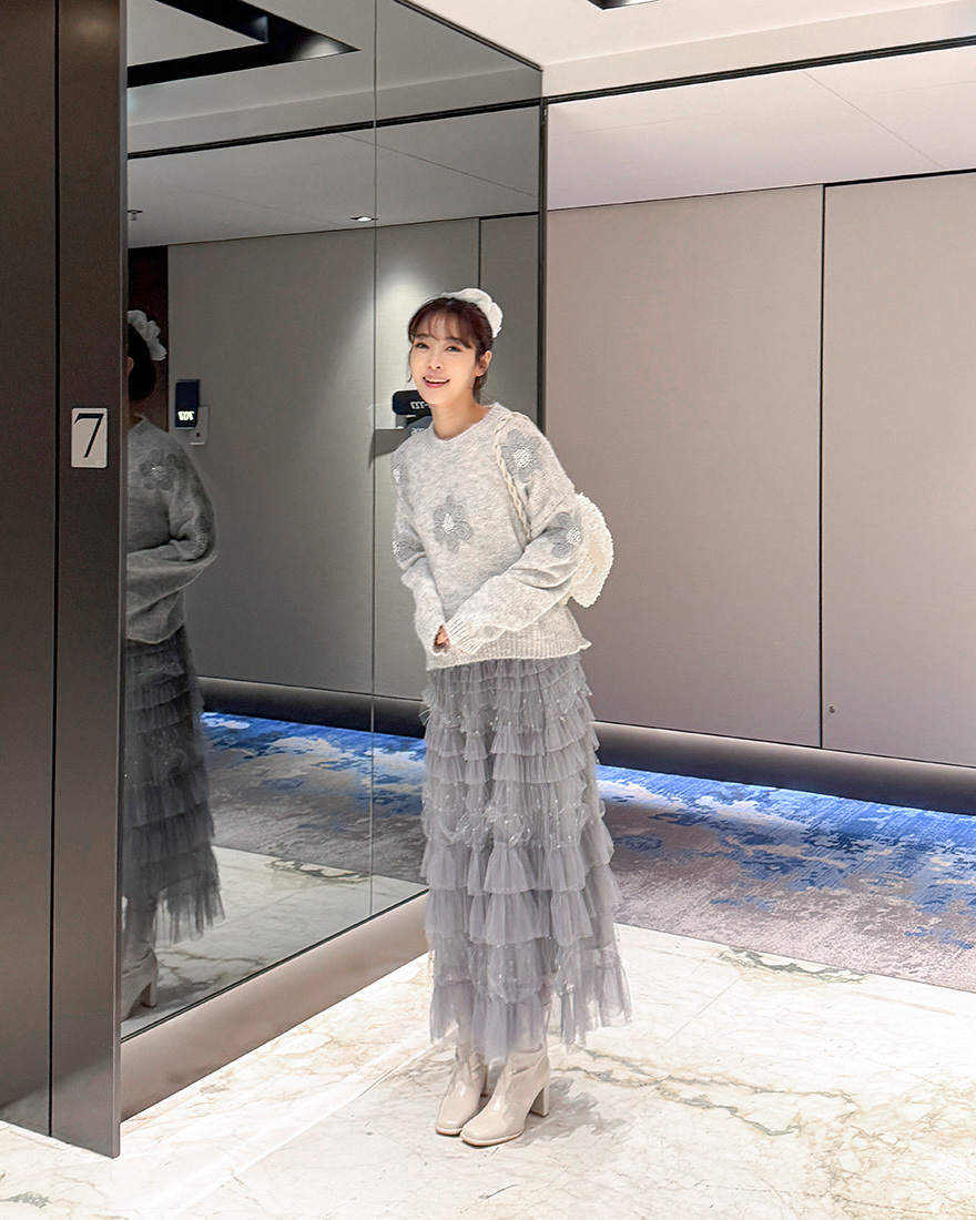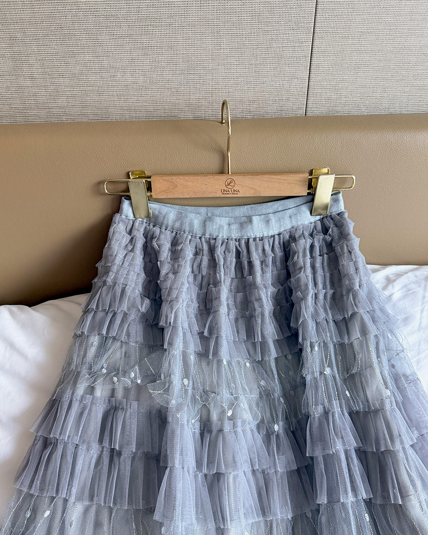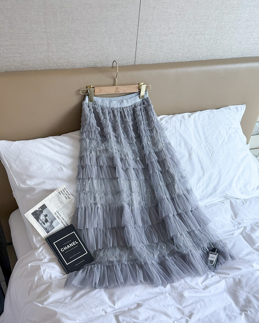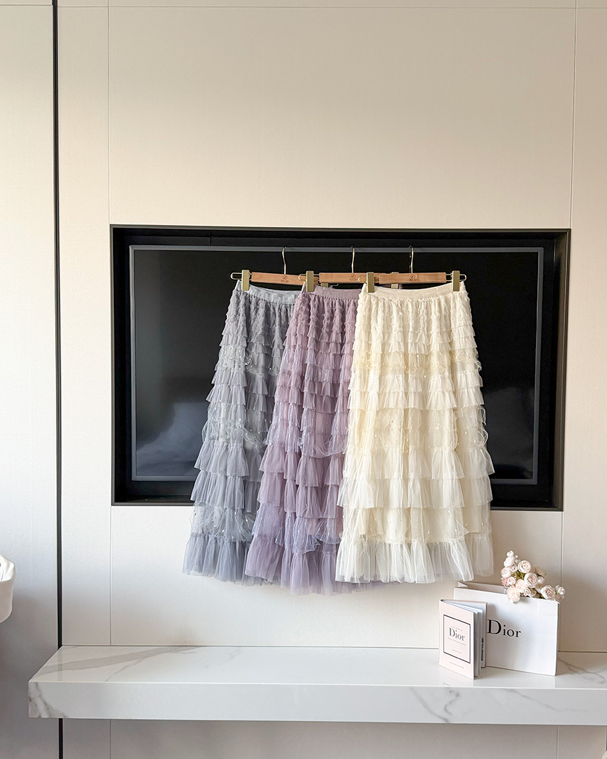 層層堆疊的荷葉壓褶輕柔網紗x串燈感的織紋