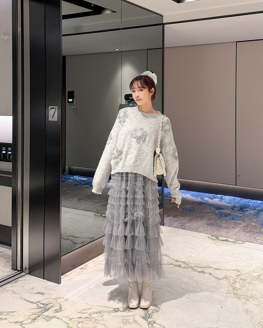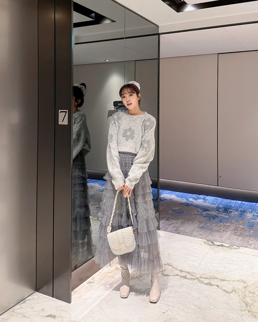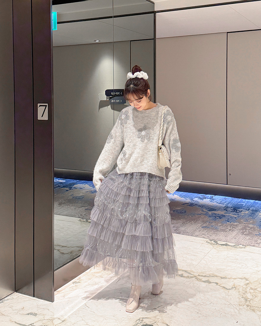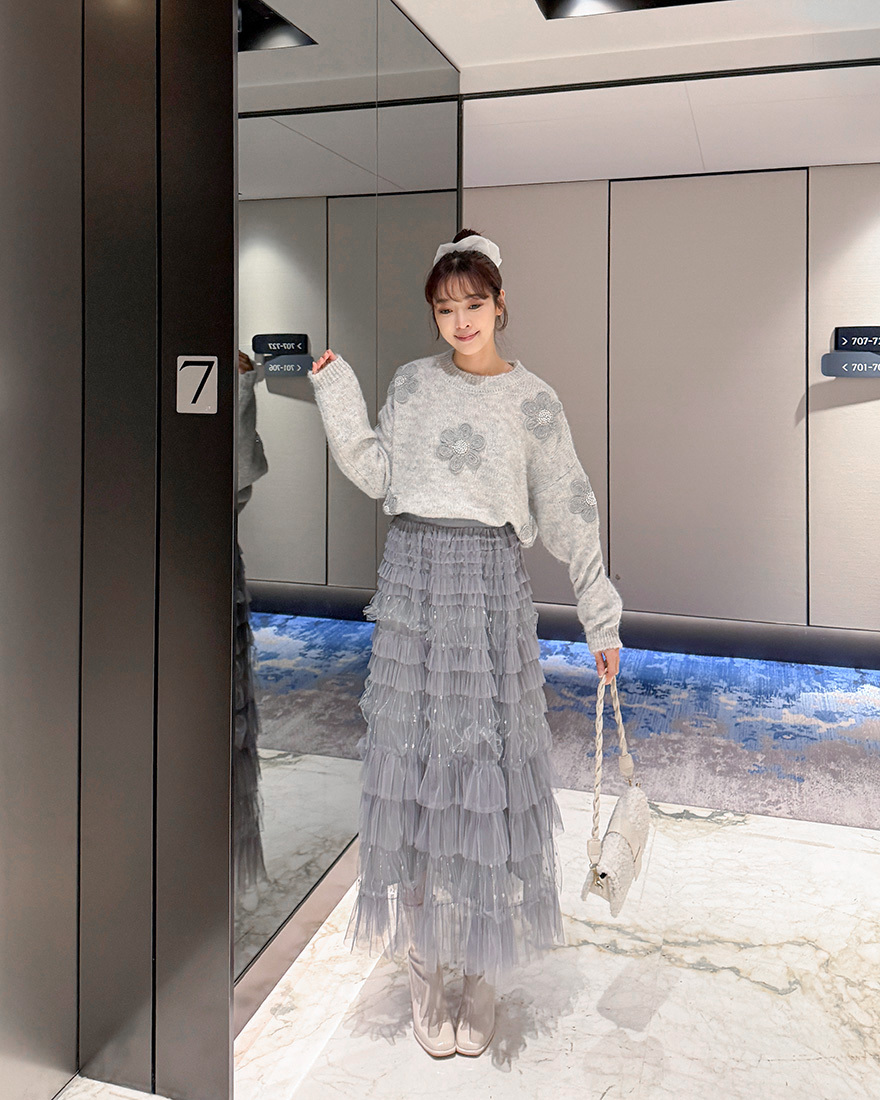 層層堆疊的荷葉壓褶輕柔網紗x串燈感的織紋