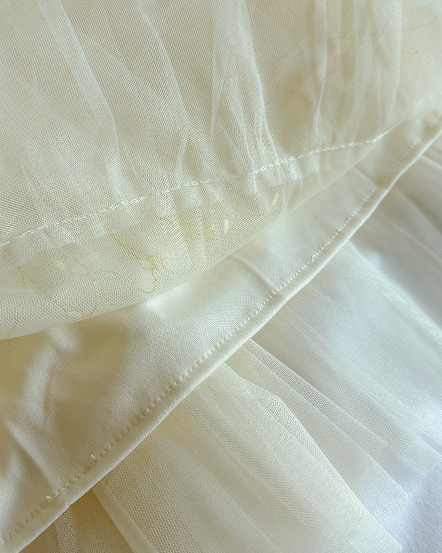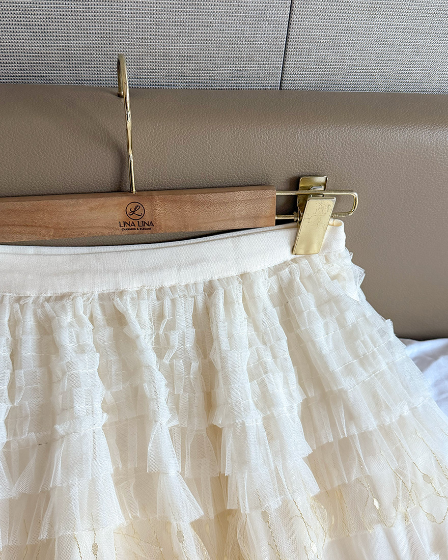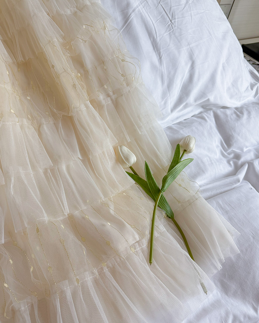 層層堆疊的荷葉壓褶輕柔網紗x串燈感的織紋