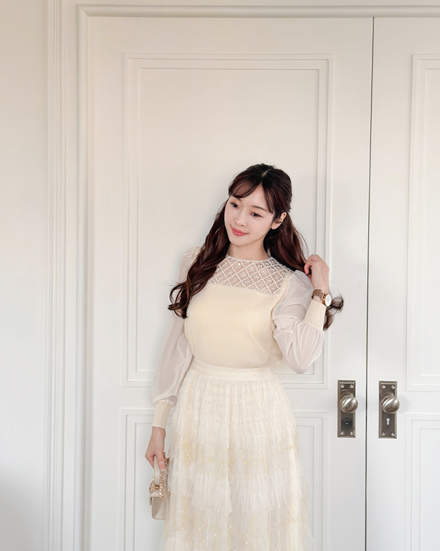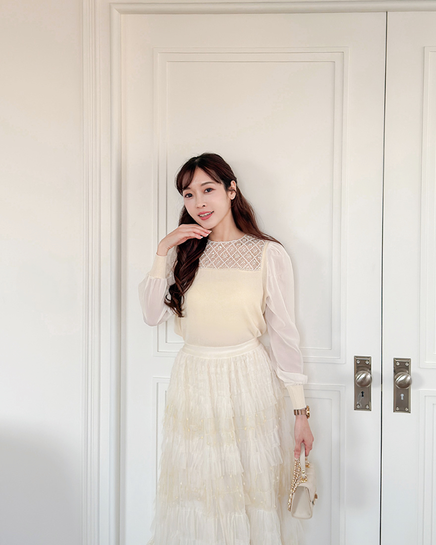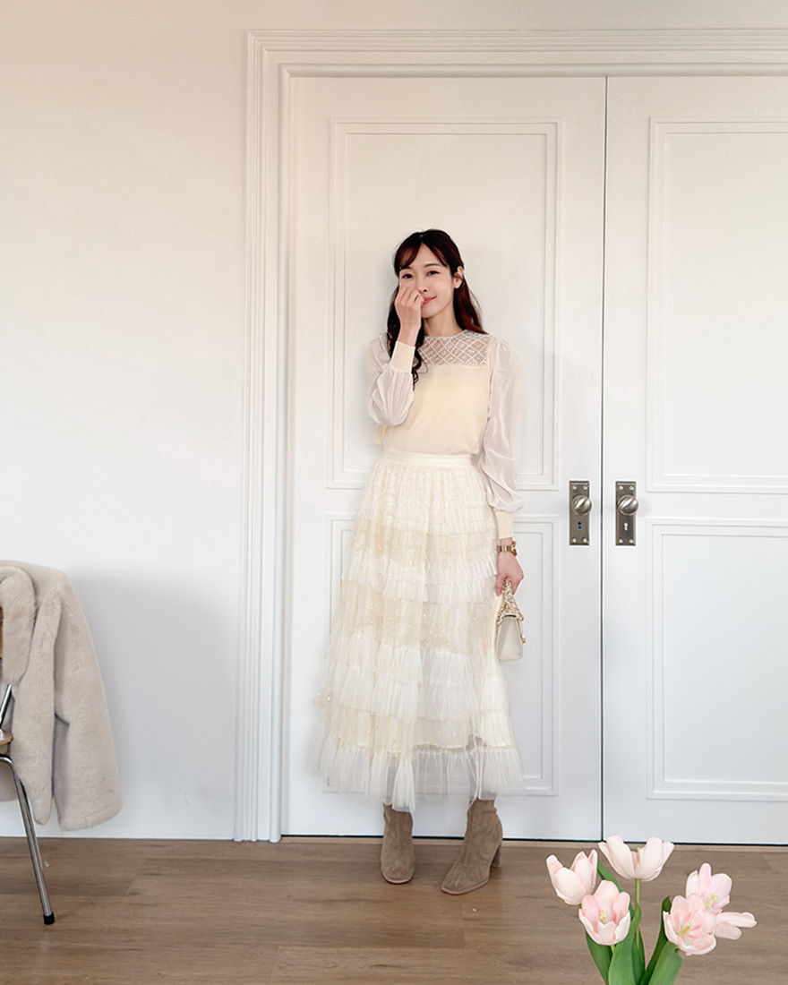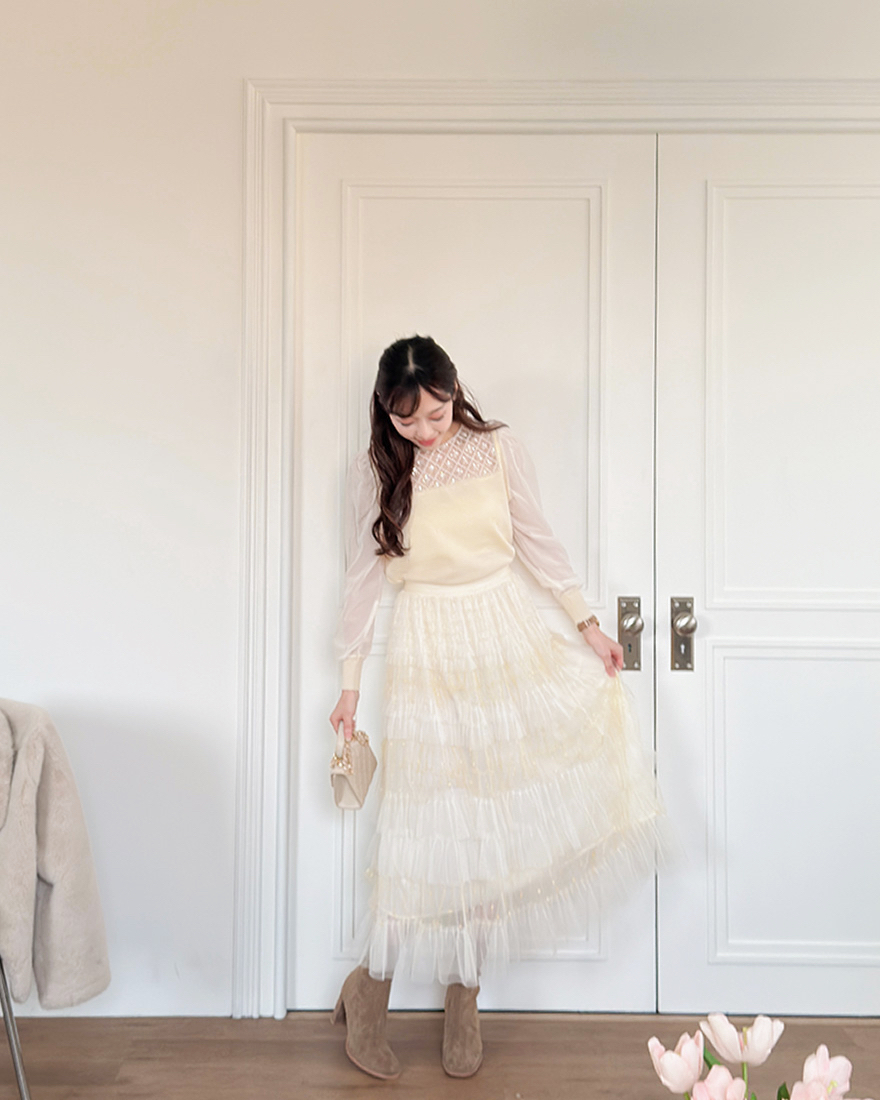 層層堆疊的荷葉壓褶輕柔網紗x串燈感的織紋