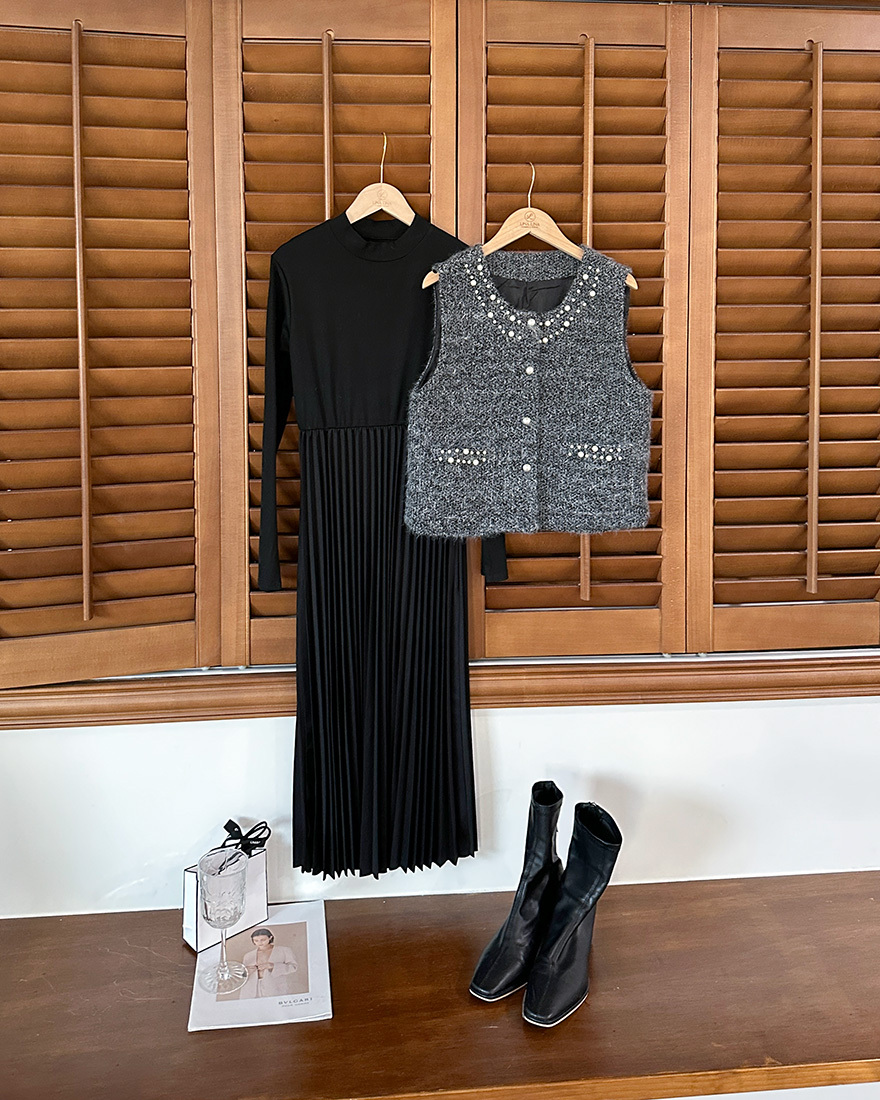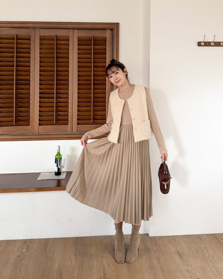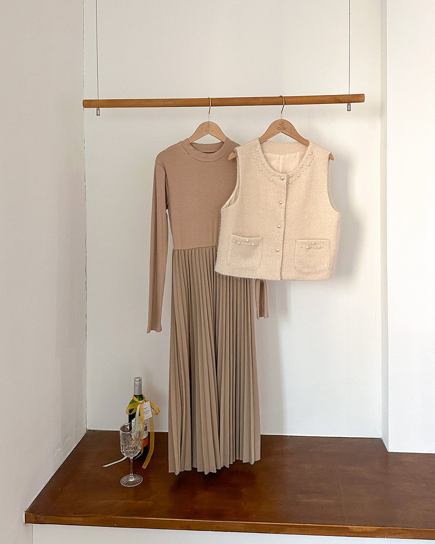 薄料螺紋針織拼接了細百褶的裙擺
