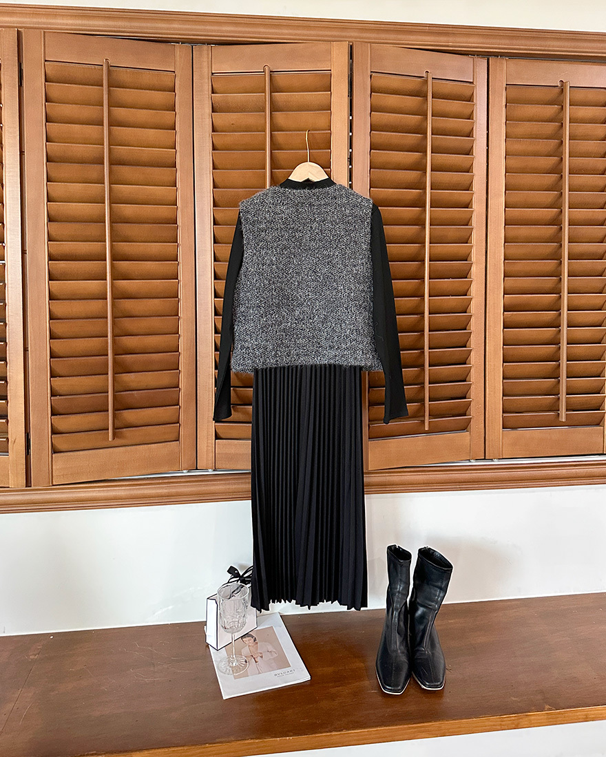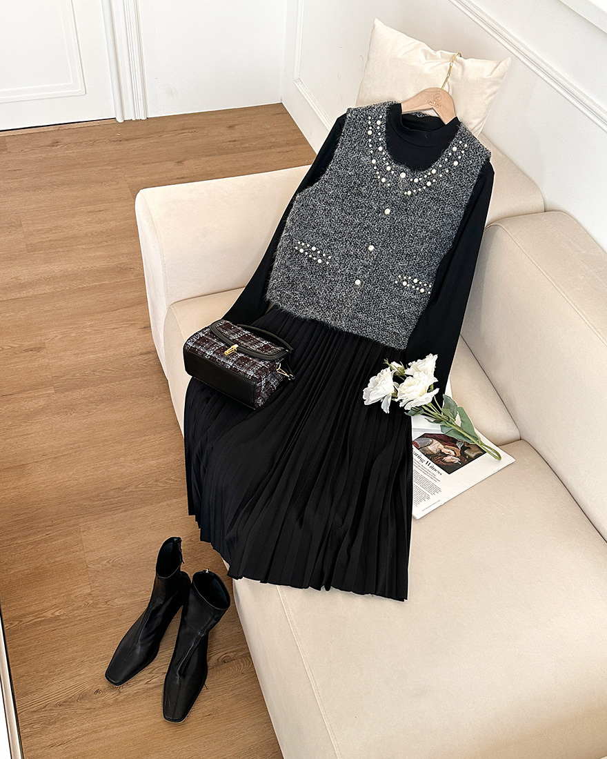 薄料螺紋針織拼接了細百褶的裙擺