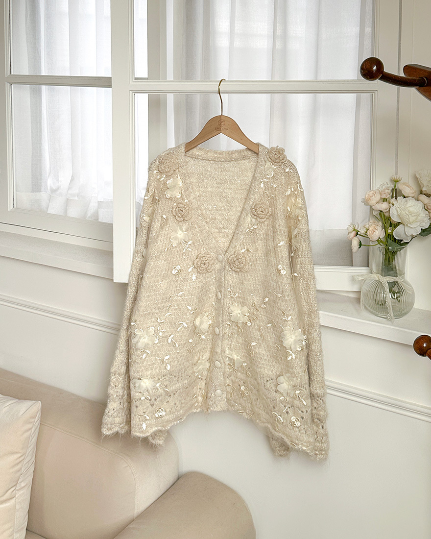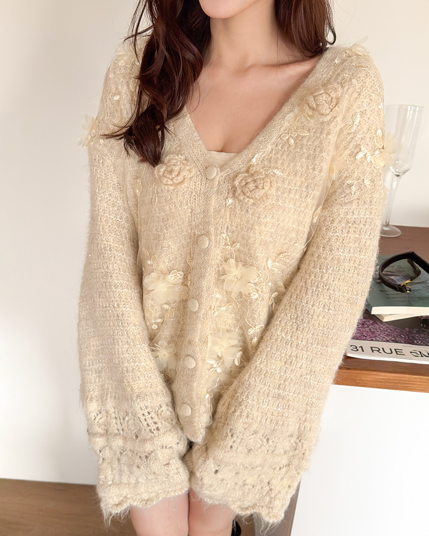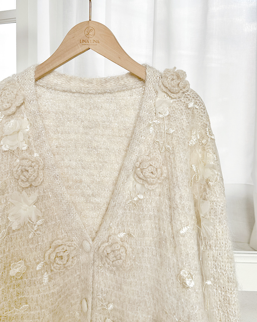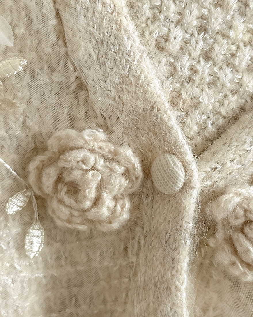 上面有著一朵朵重工的立體毛線玫瑰花跟網紗花朵