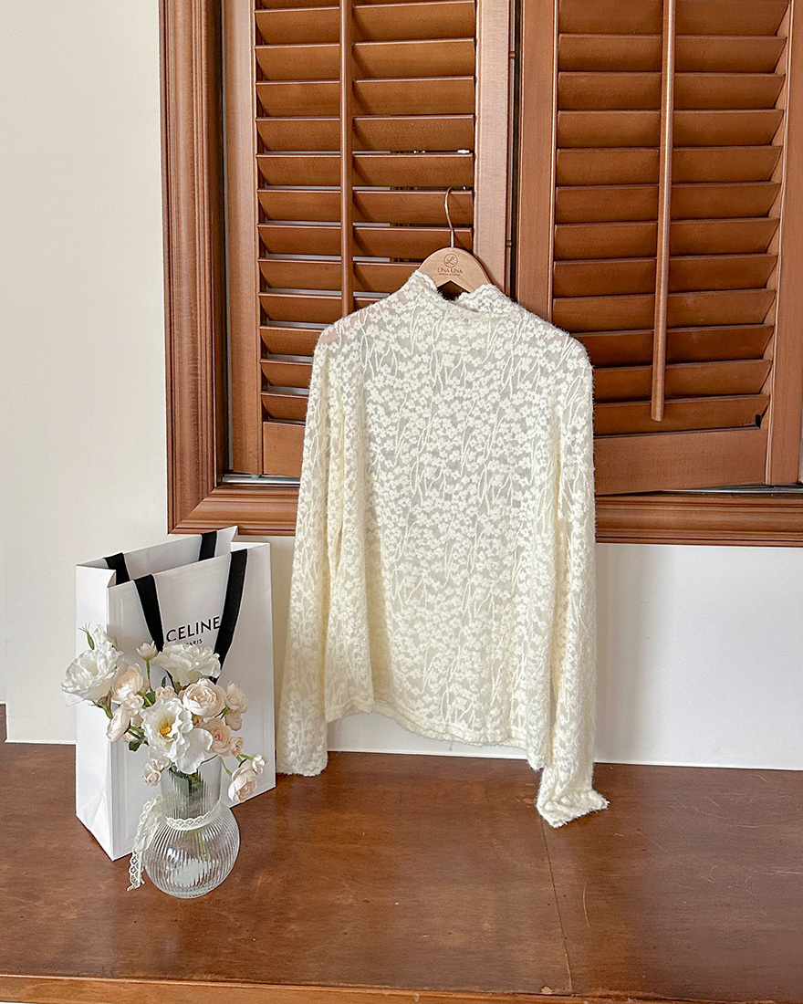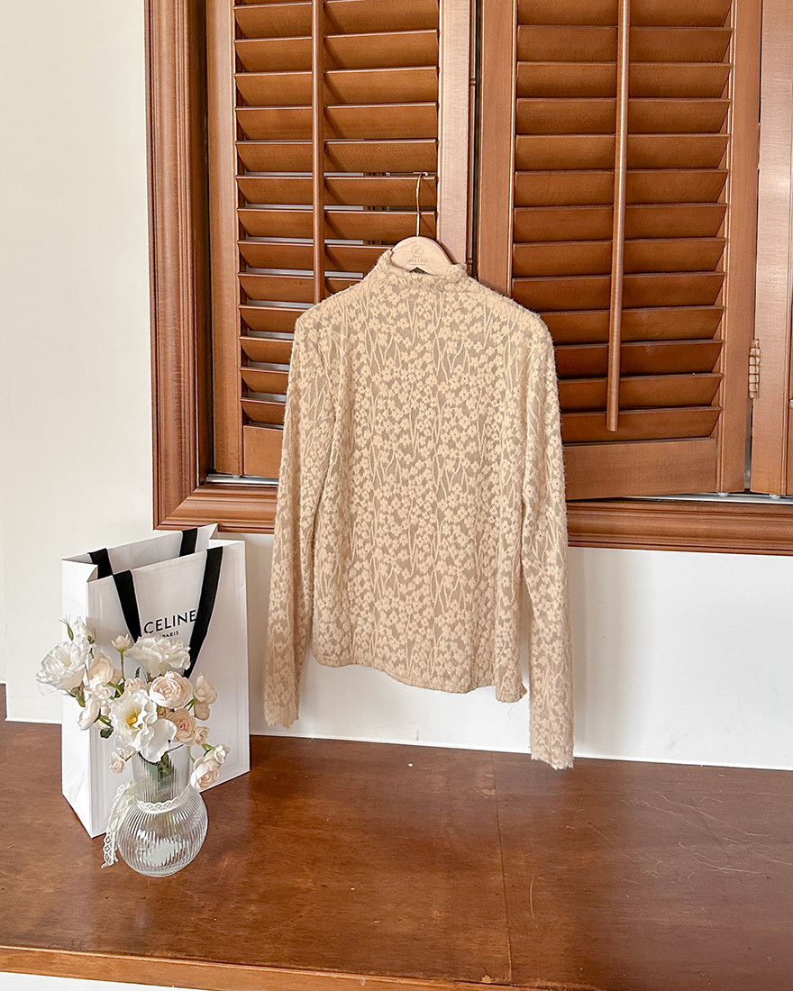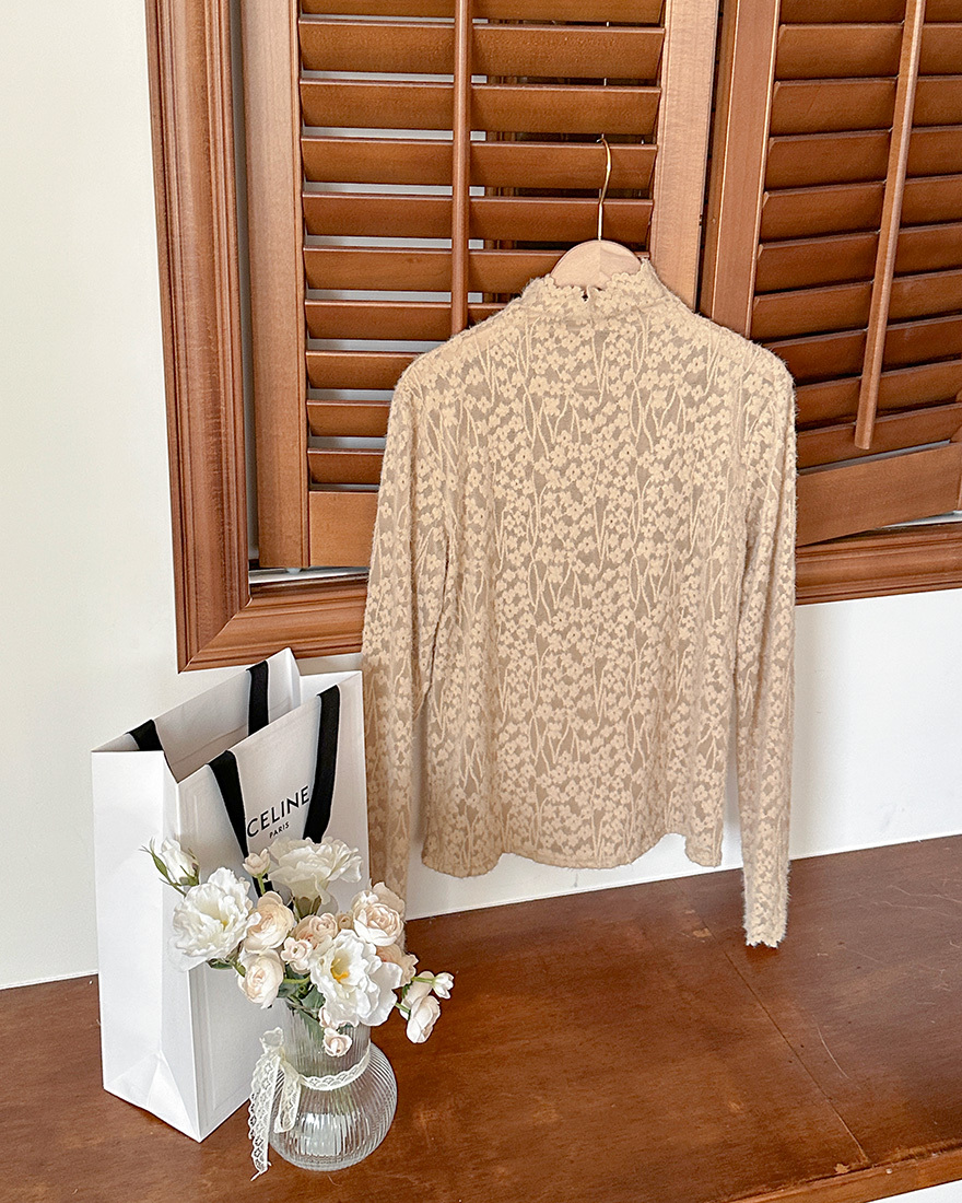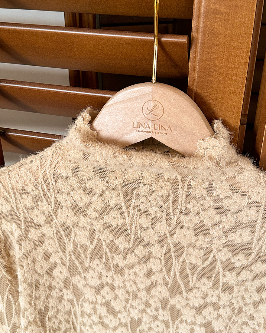 LINA LINA細膩柔情滿版磨毛花朵花邊高領上衣-榛果咖