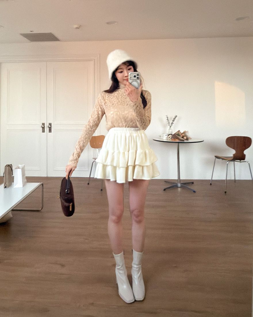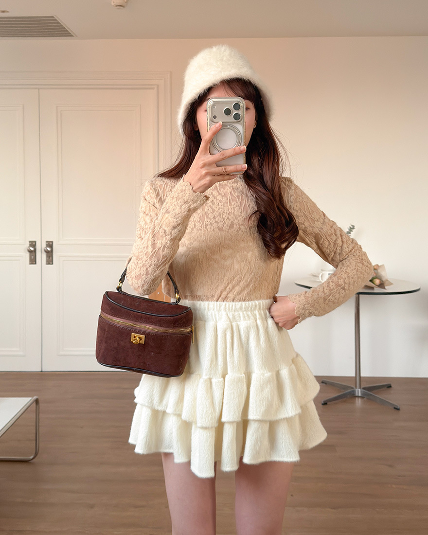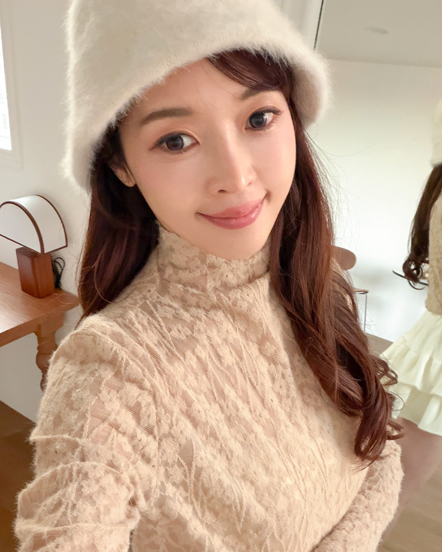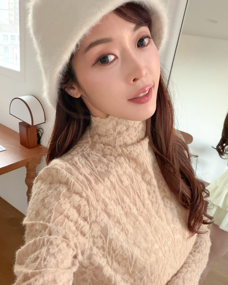LINA LINA細膩柔情滿版磨毛花朵花邊高領上衣-榛果咖