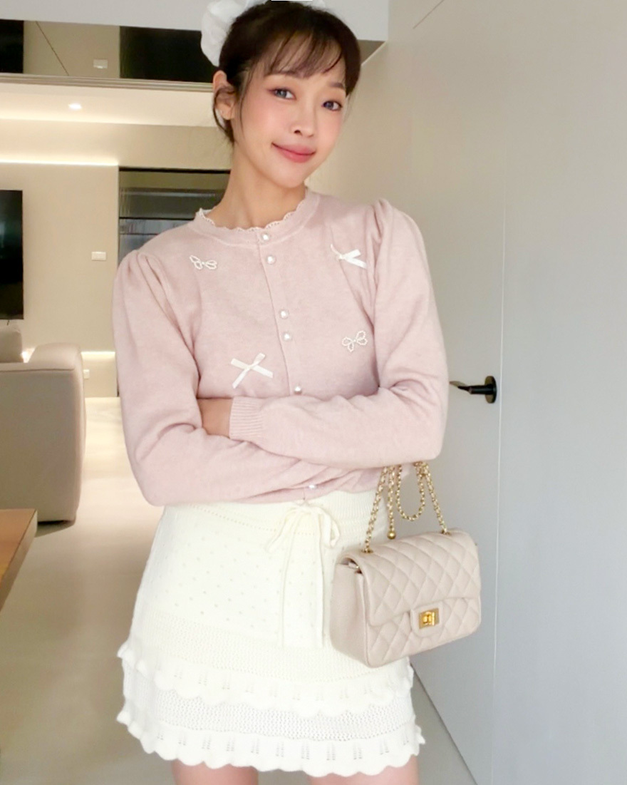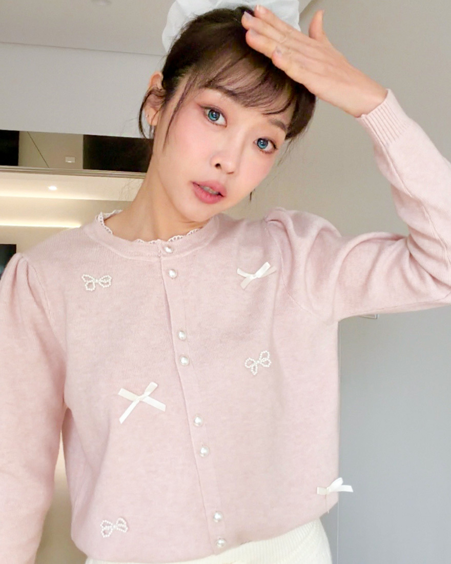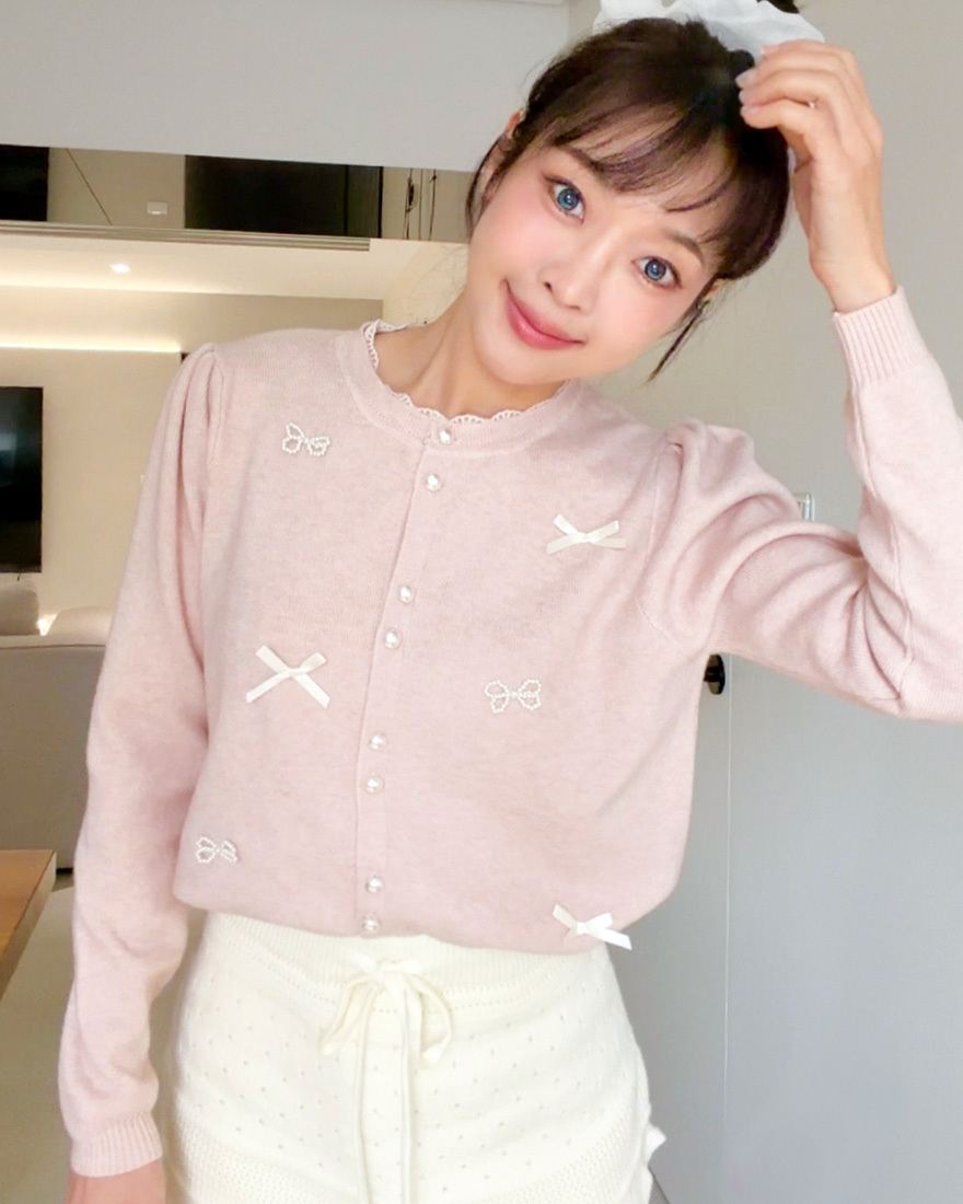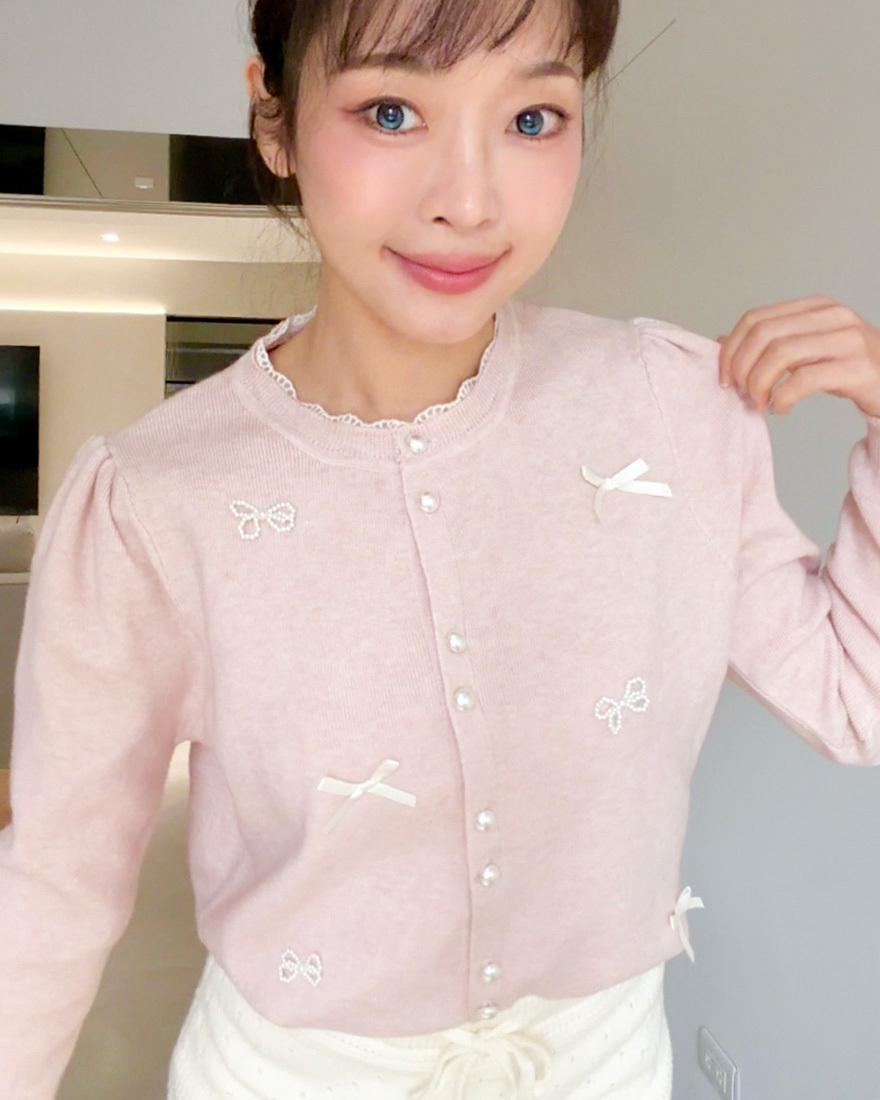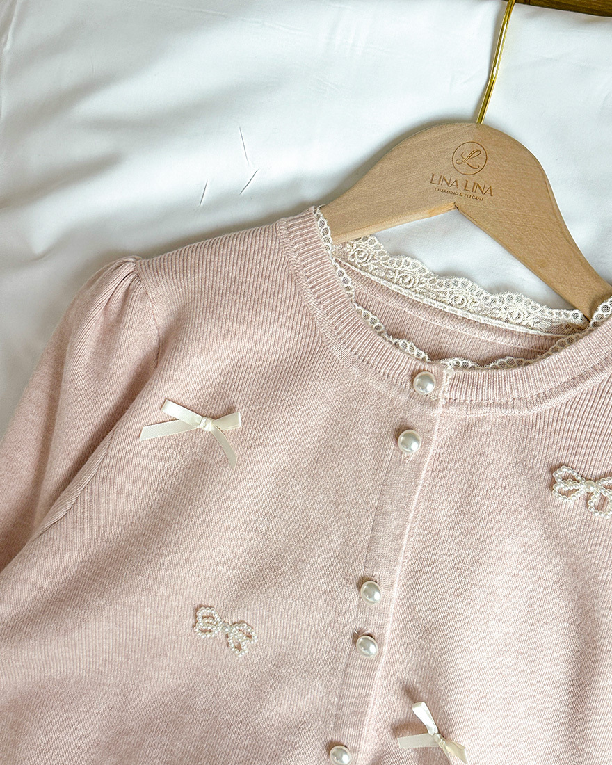 LINA LINA心動甜度珍珠緞帶蝴蝶結上衣外套-甜美粉