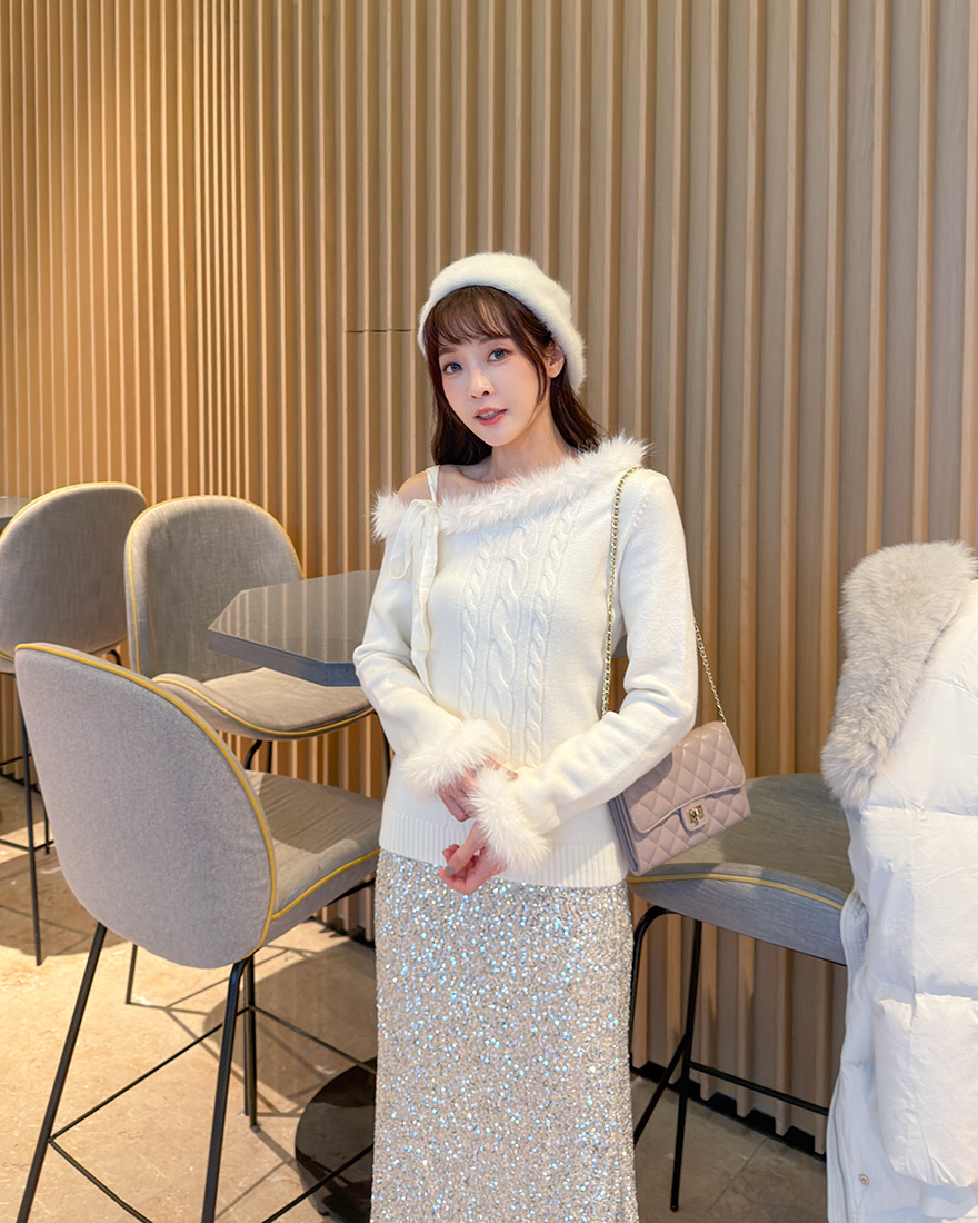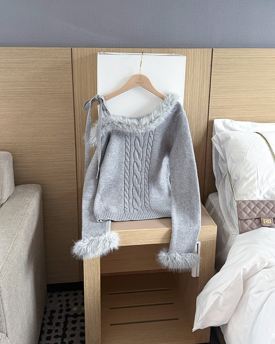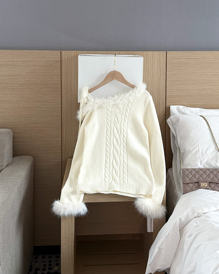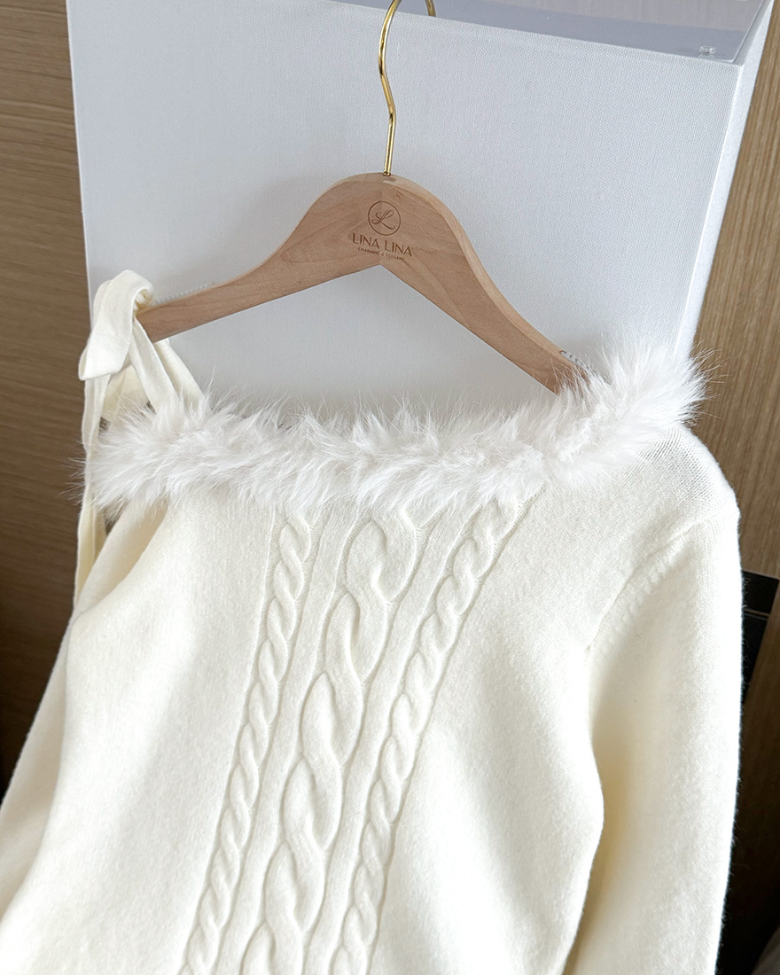 LINA LINA華美冬季絨毛滾邊綁結麻花上衣-雪花白