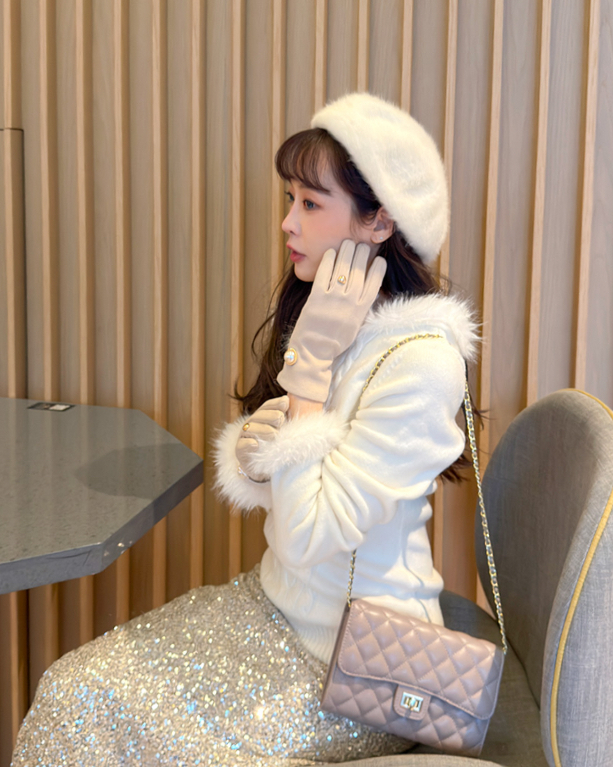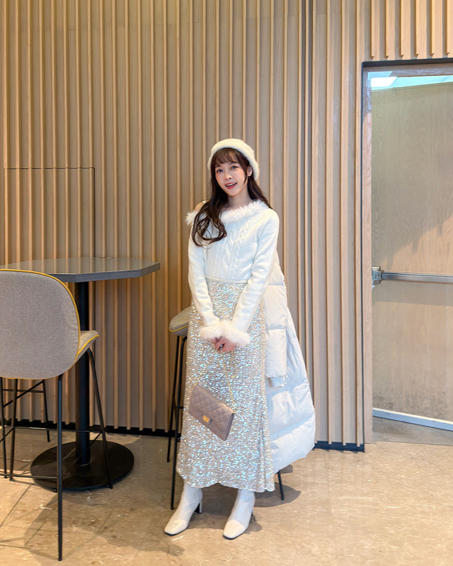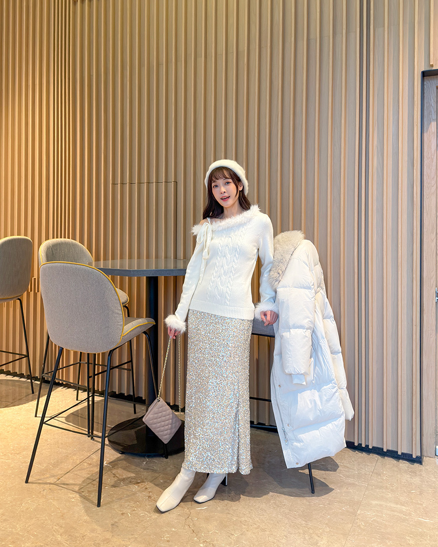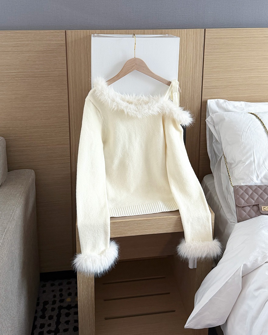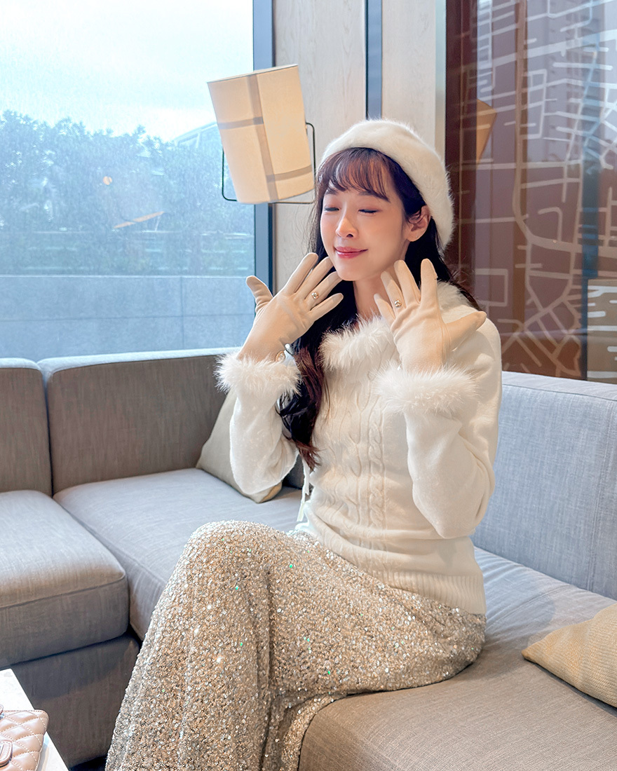 LINA LINA華美冬季絨毛滾邊綁結麻花上衣-雪花白
