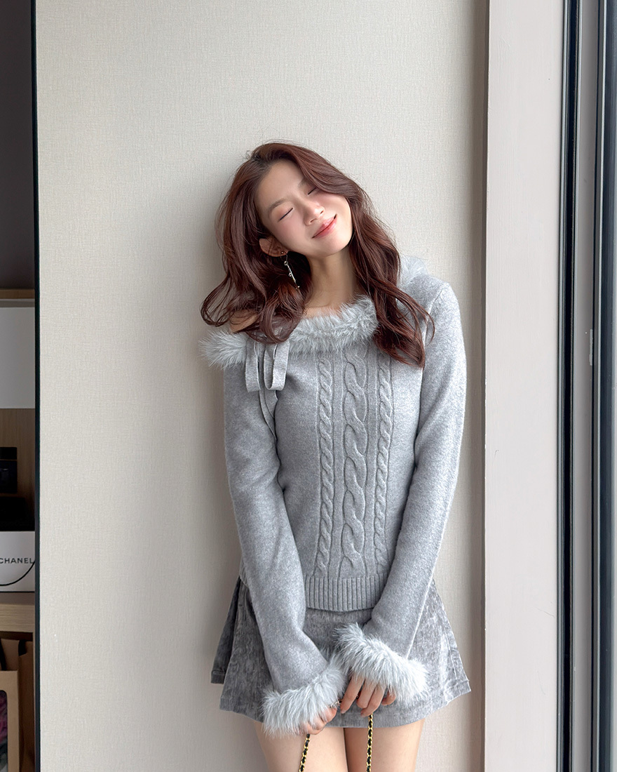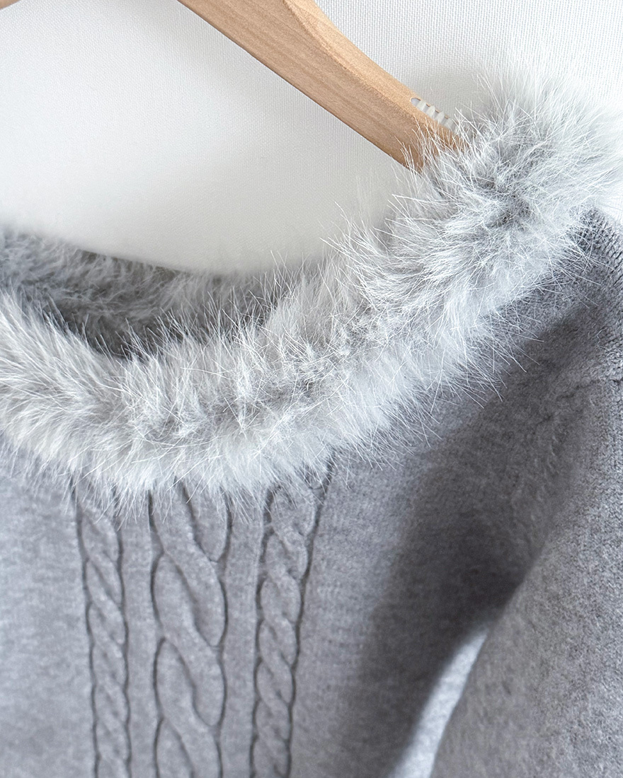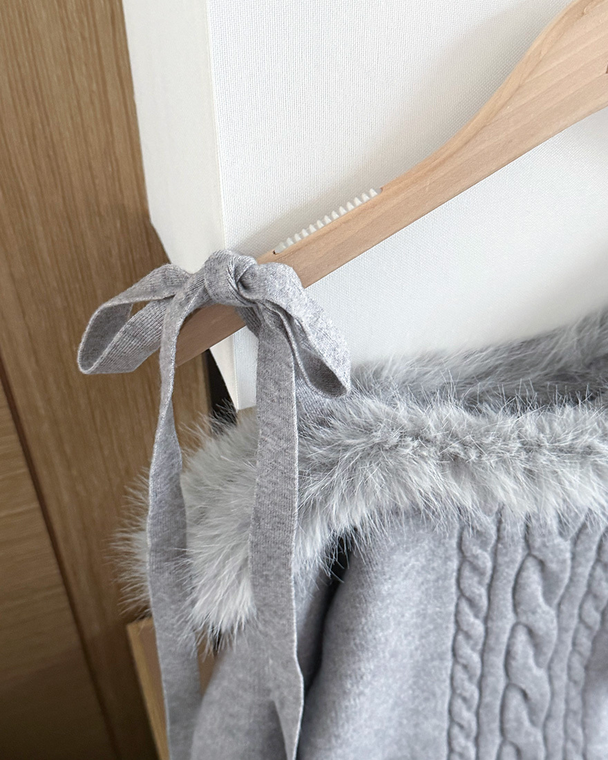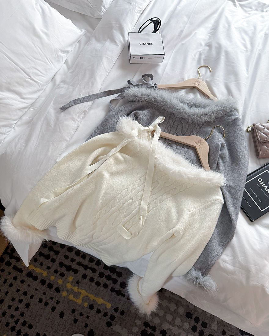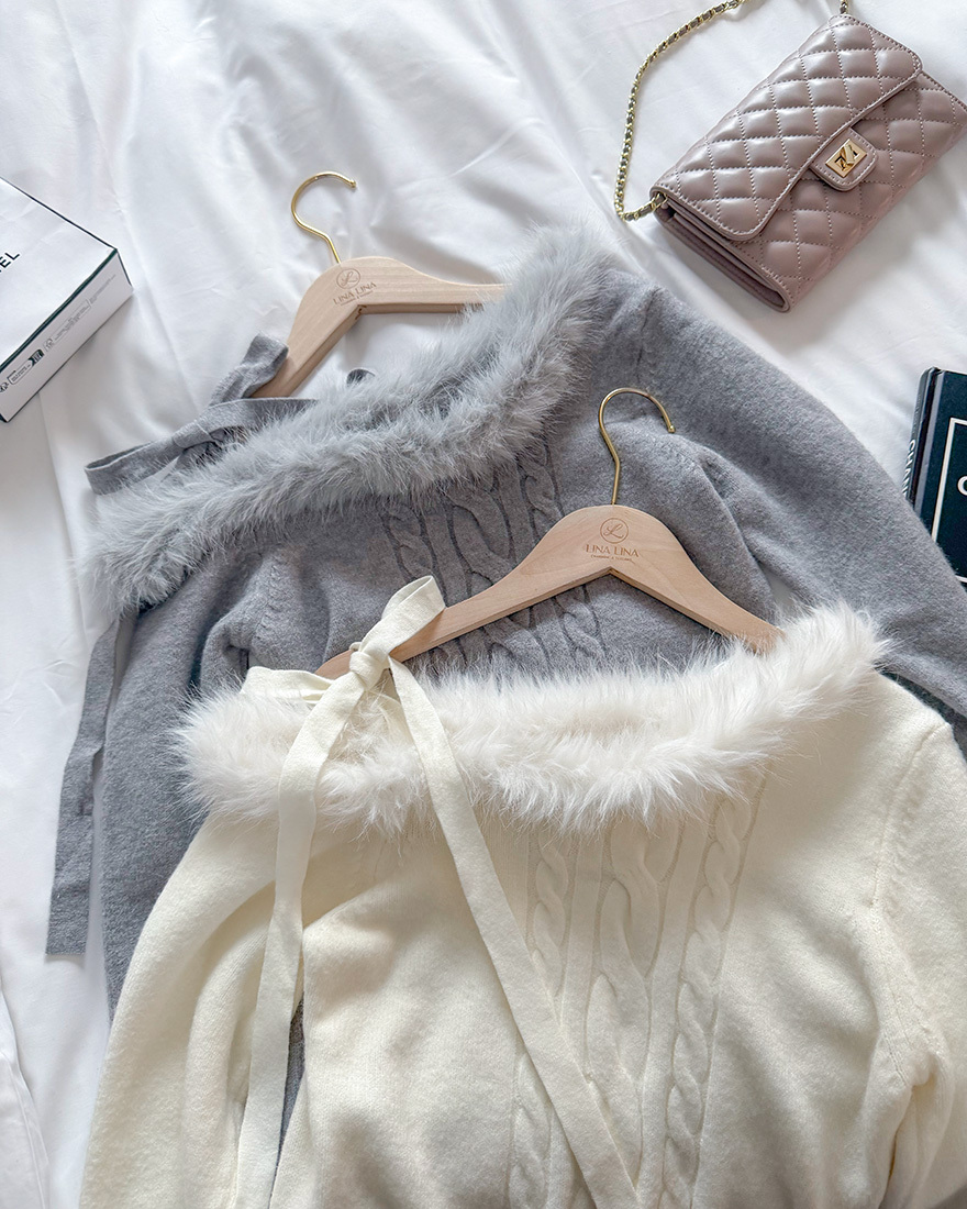 LINA LINA華美冬季絨毛滾邊綁結麻花上衣-高雅灰