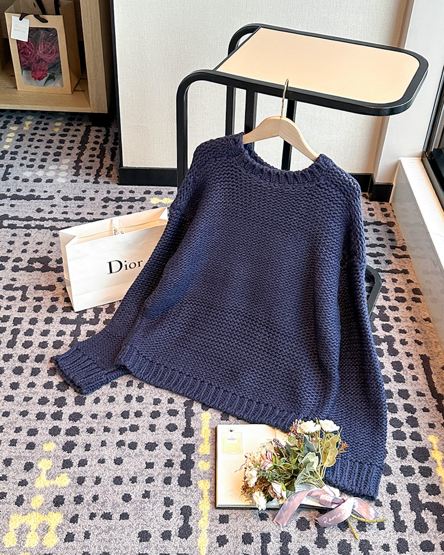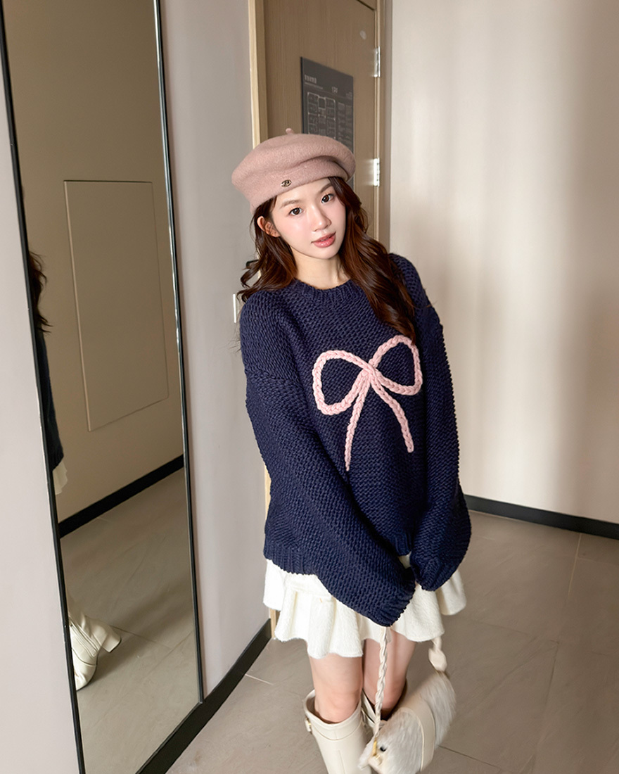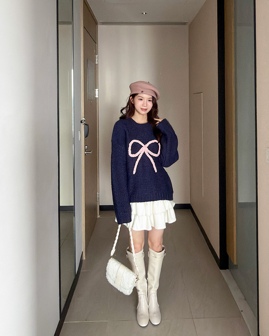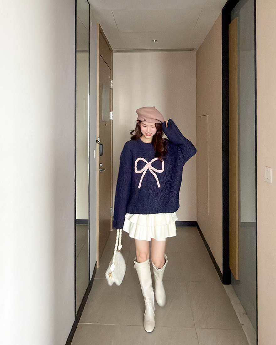 LINA LINA半糖女孩立體毛線蝴蝶結鈎針毛衣-質感深藍