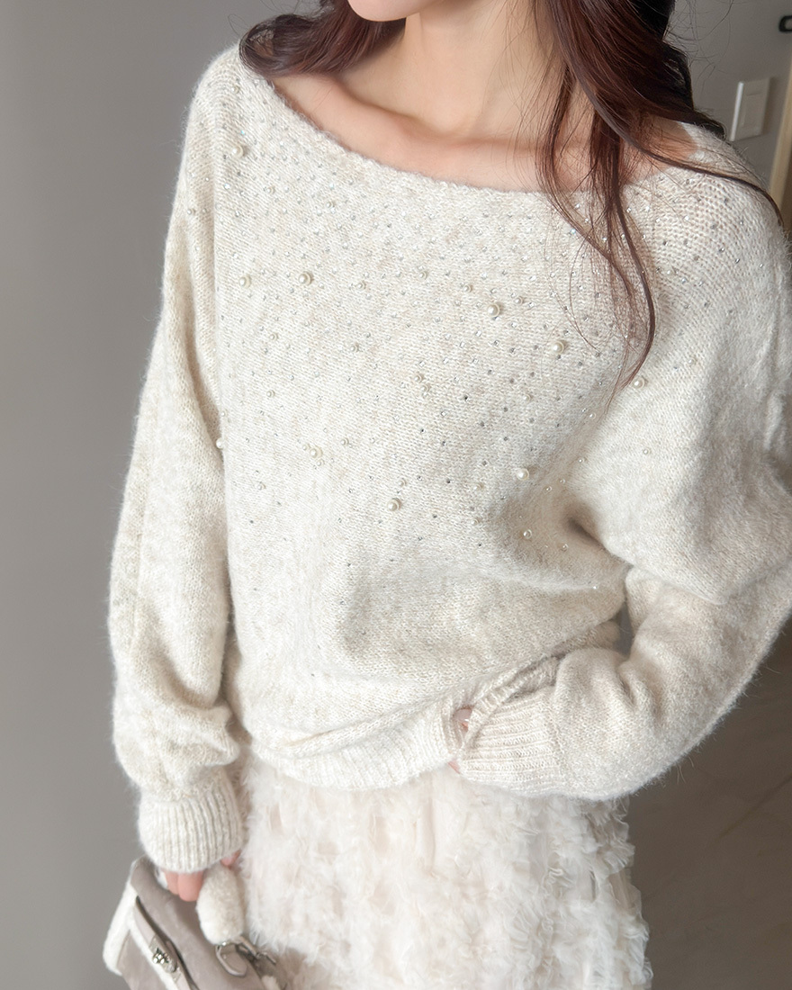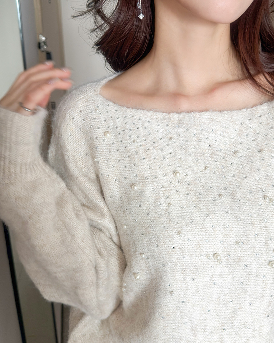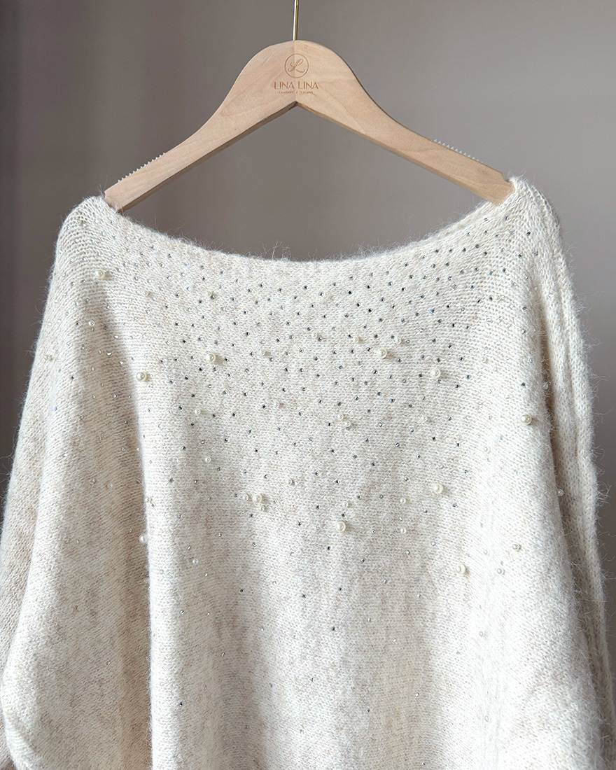 LINA LINA高貴情調水鑽珍珠螺紋滾邊毛衣-柔咖杏