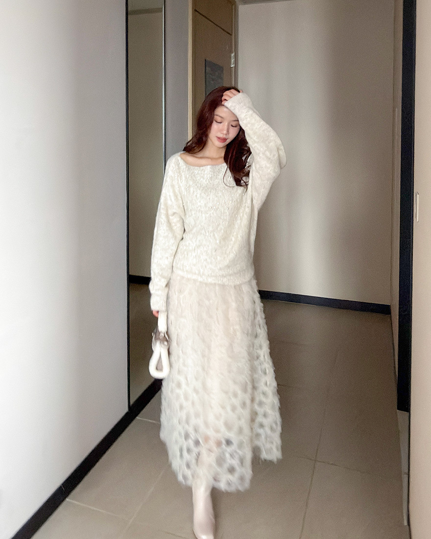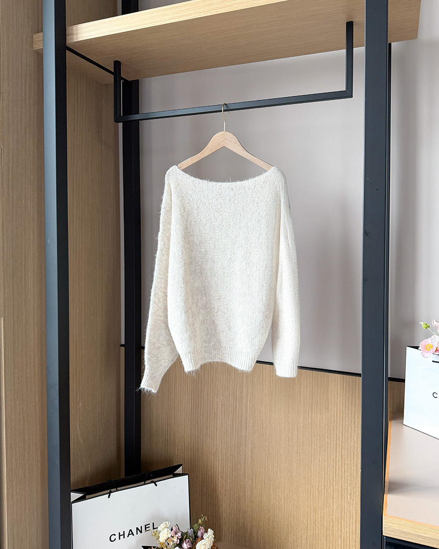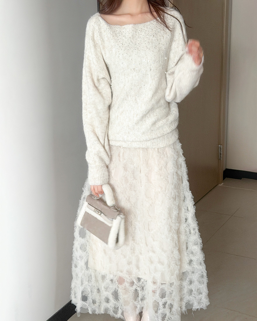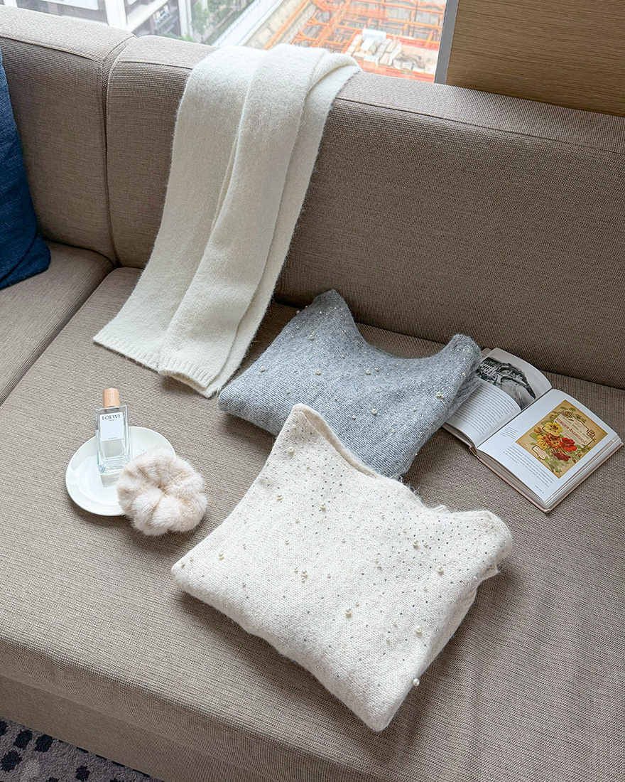 LINA LINA高貴情調水鑽珍珠螺紋滾邊毛衣-柔咖杏