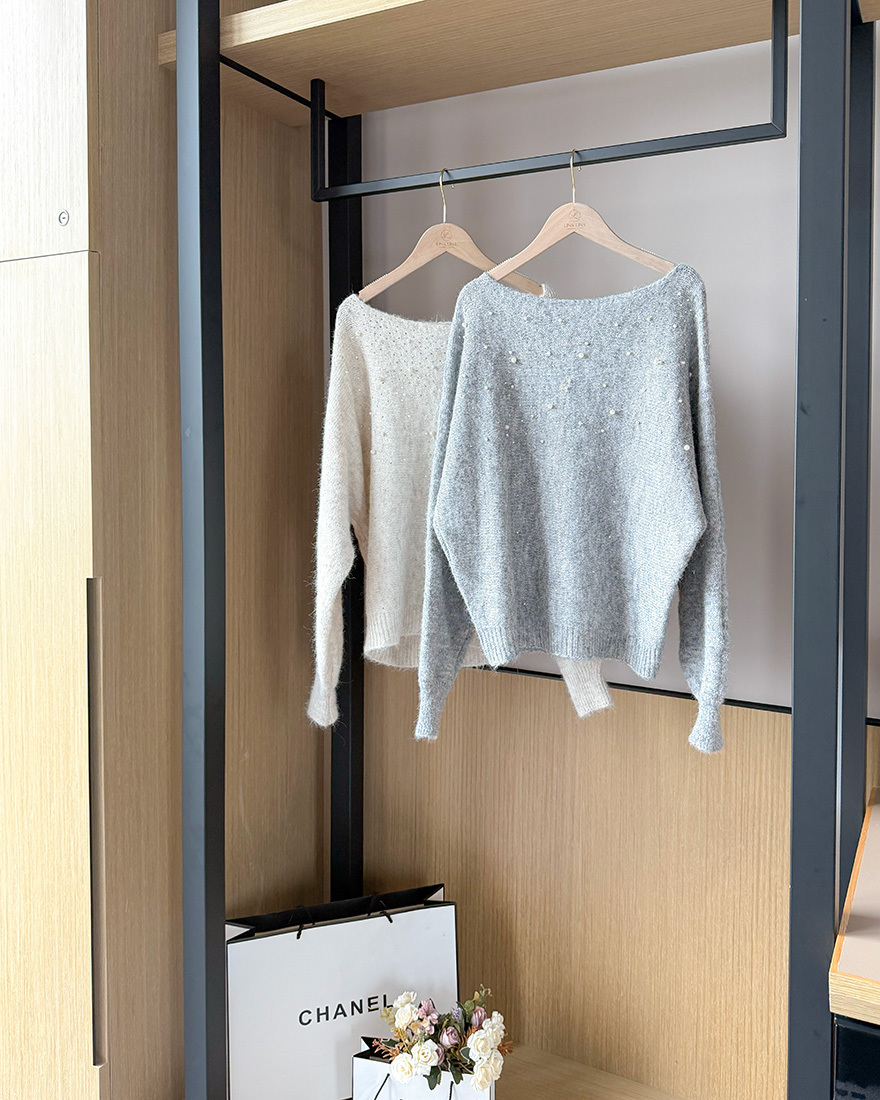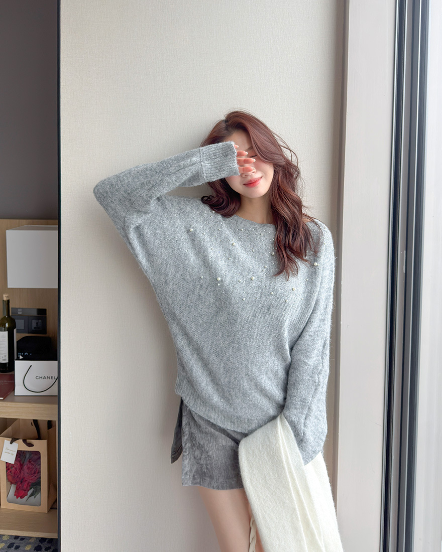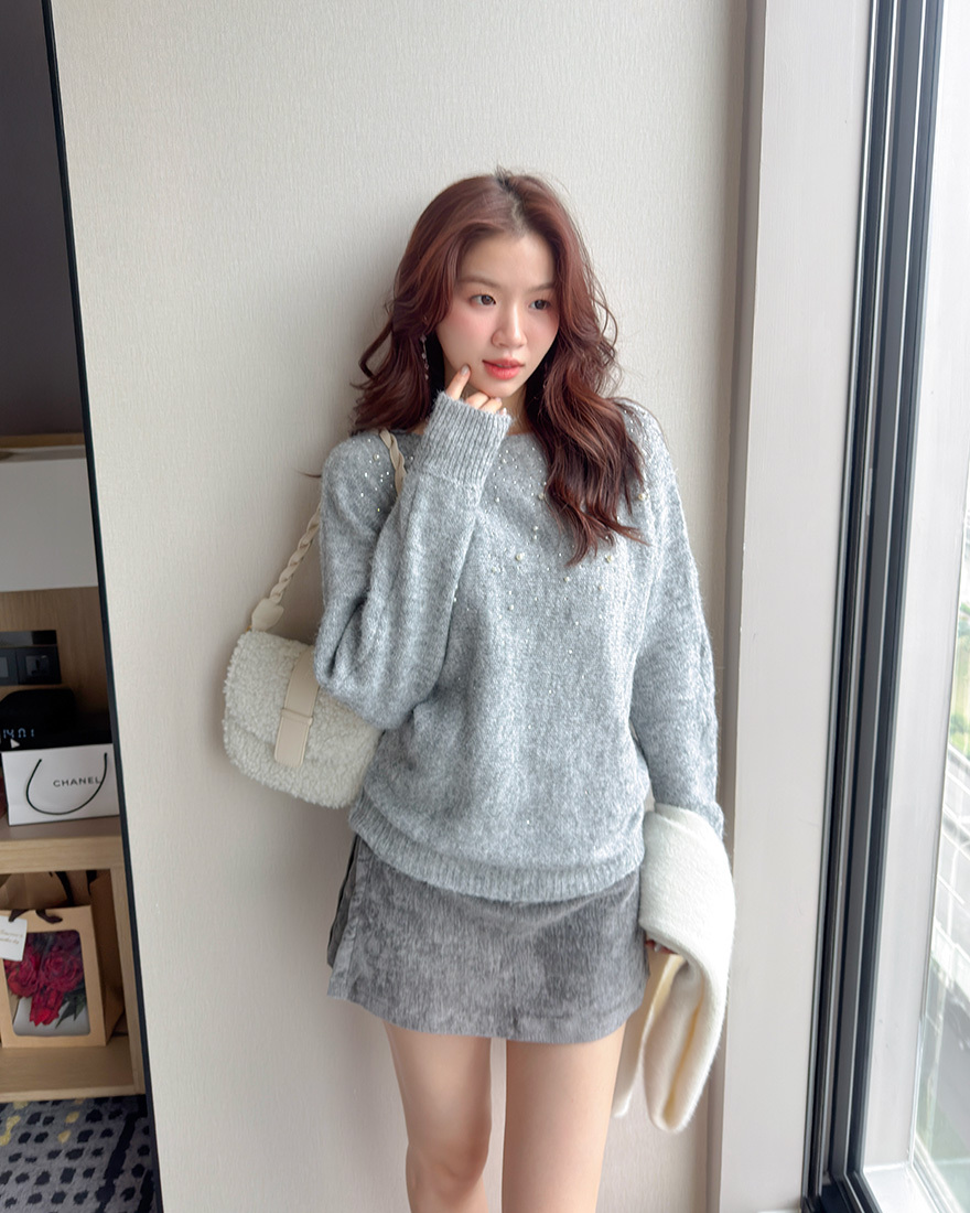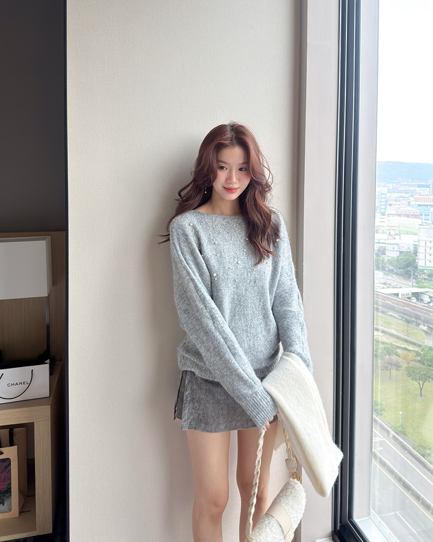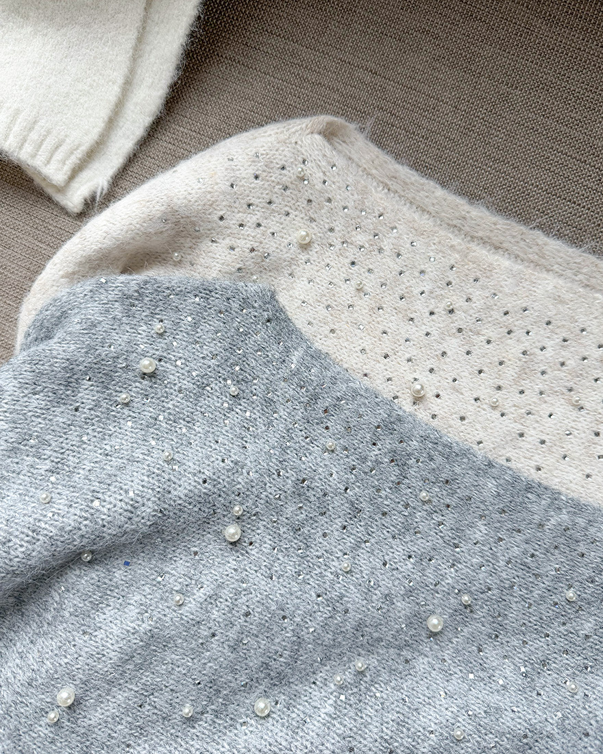 LINA LINA高貴情調水鑽珍珠螺紋滾邊毛衣-典雅灰