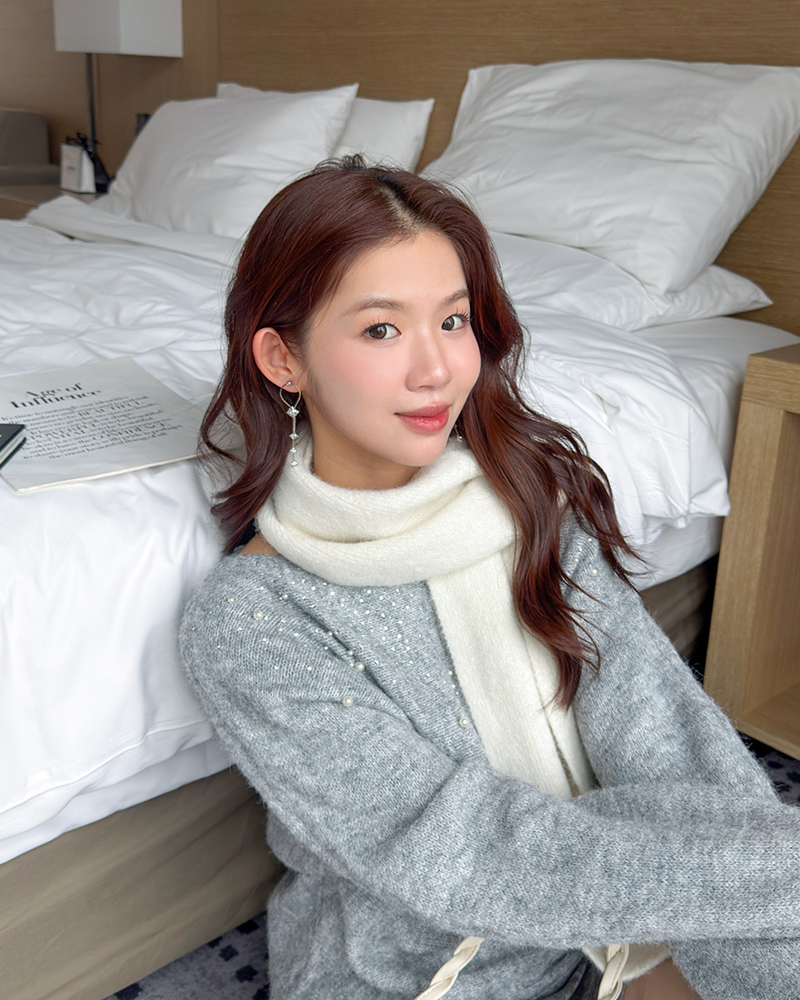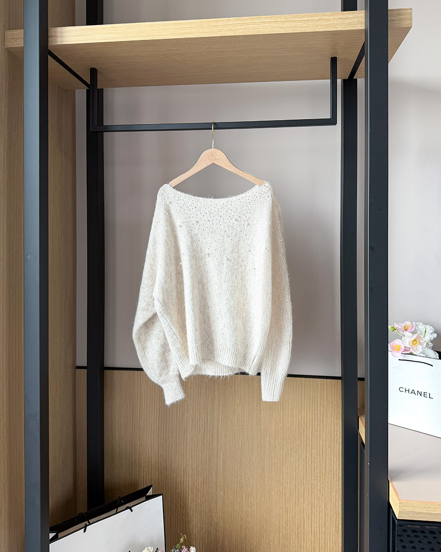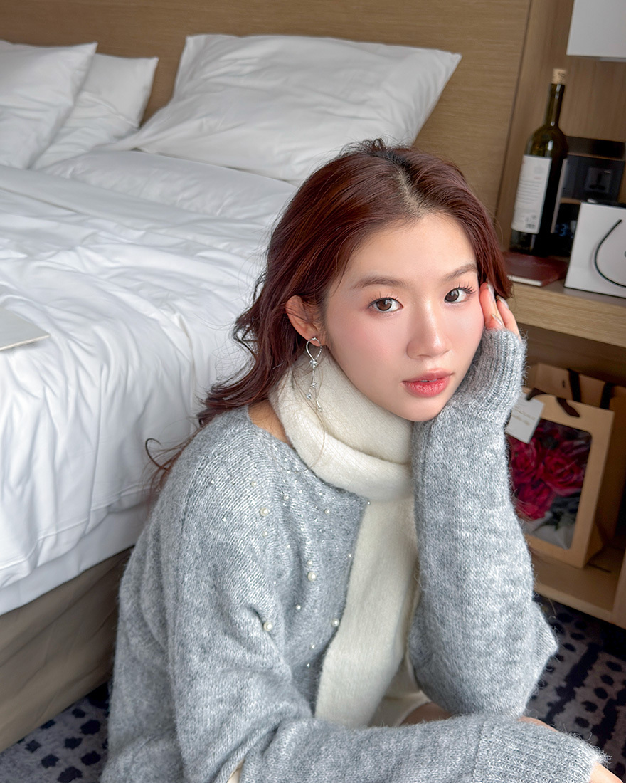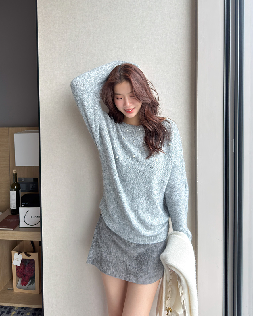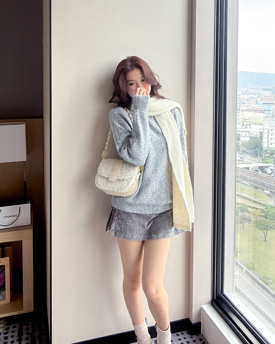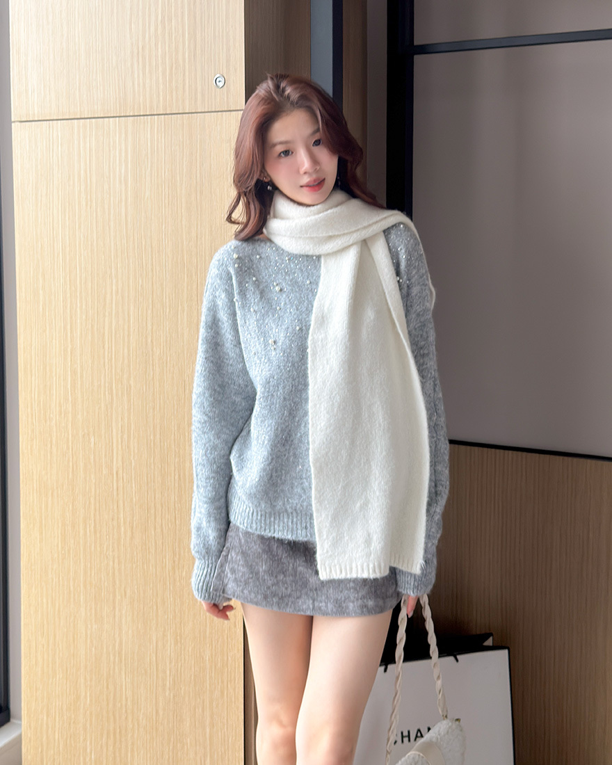 LINA LINA高貴情調水鑽珍珠螺紋滾邊毛衣-典雅灰