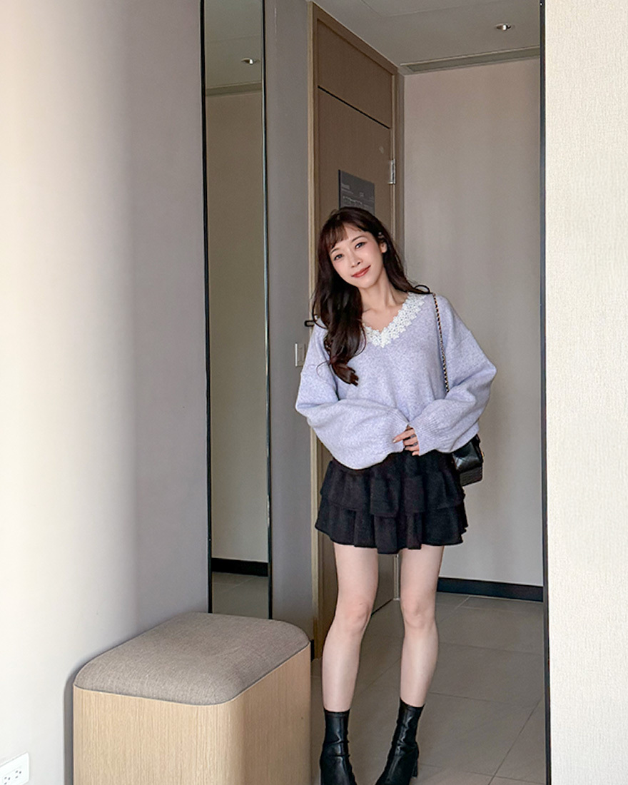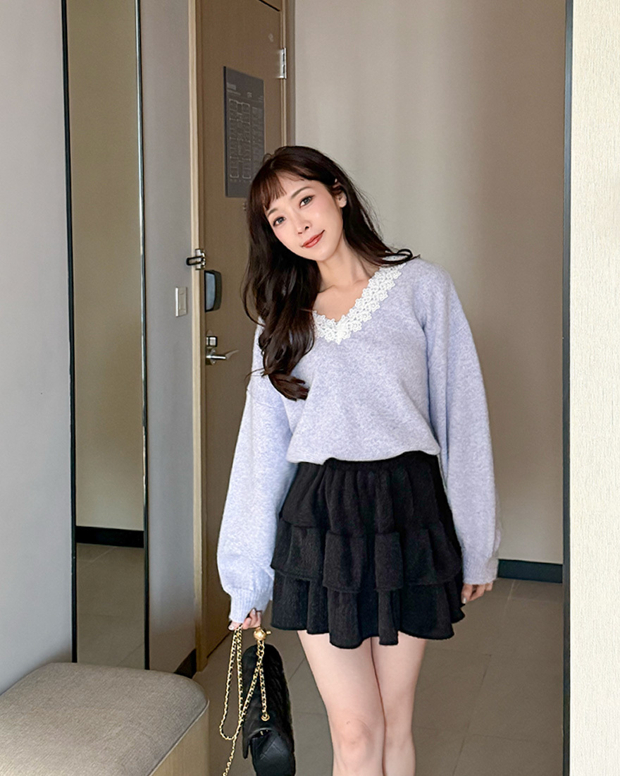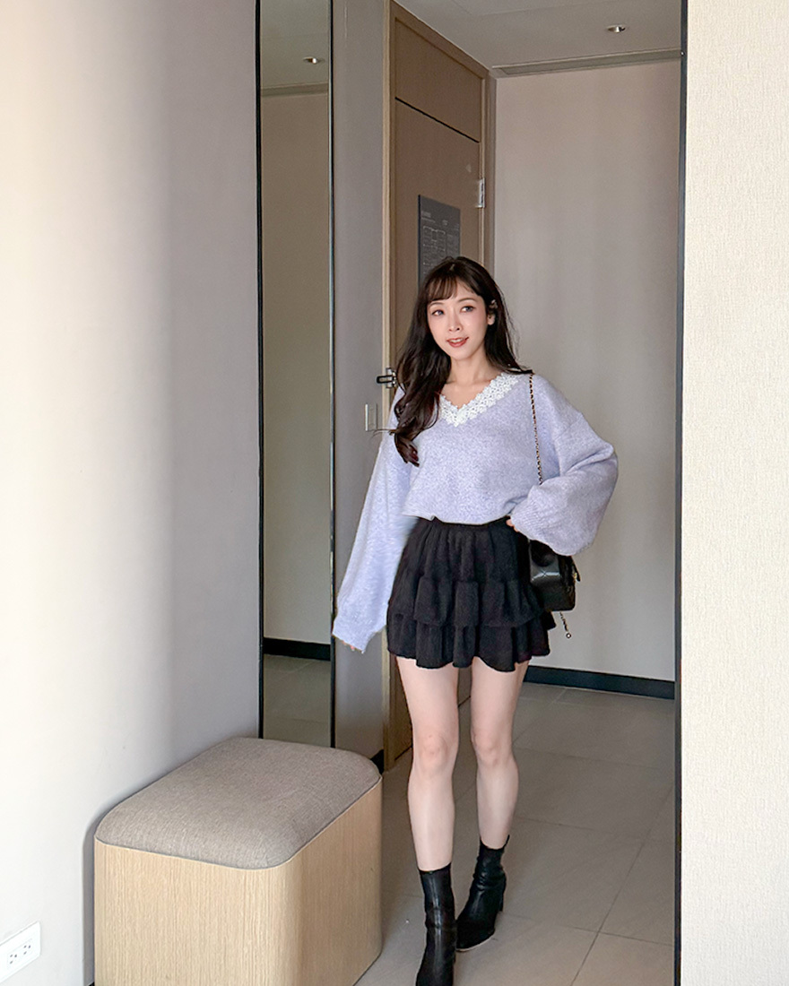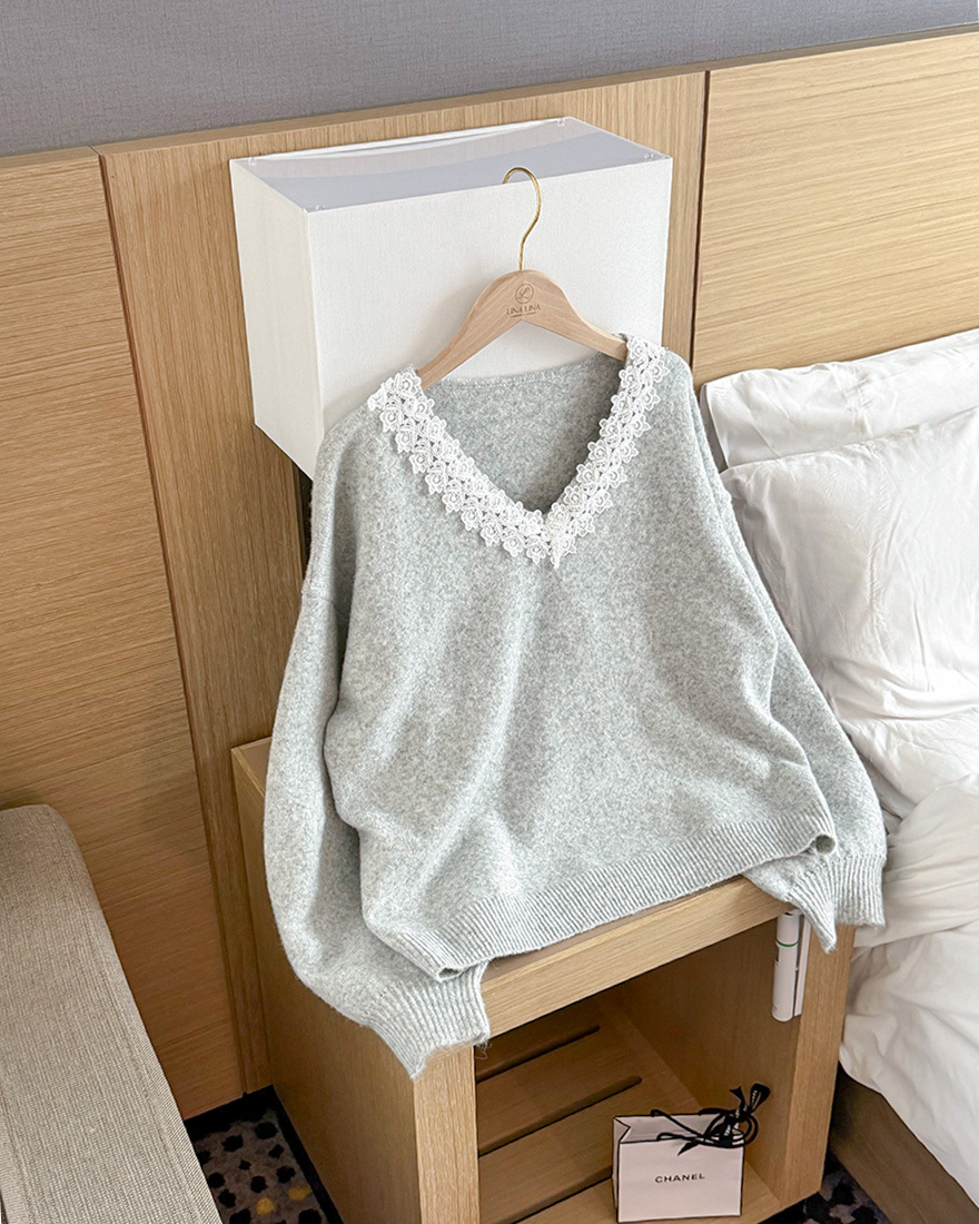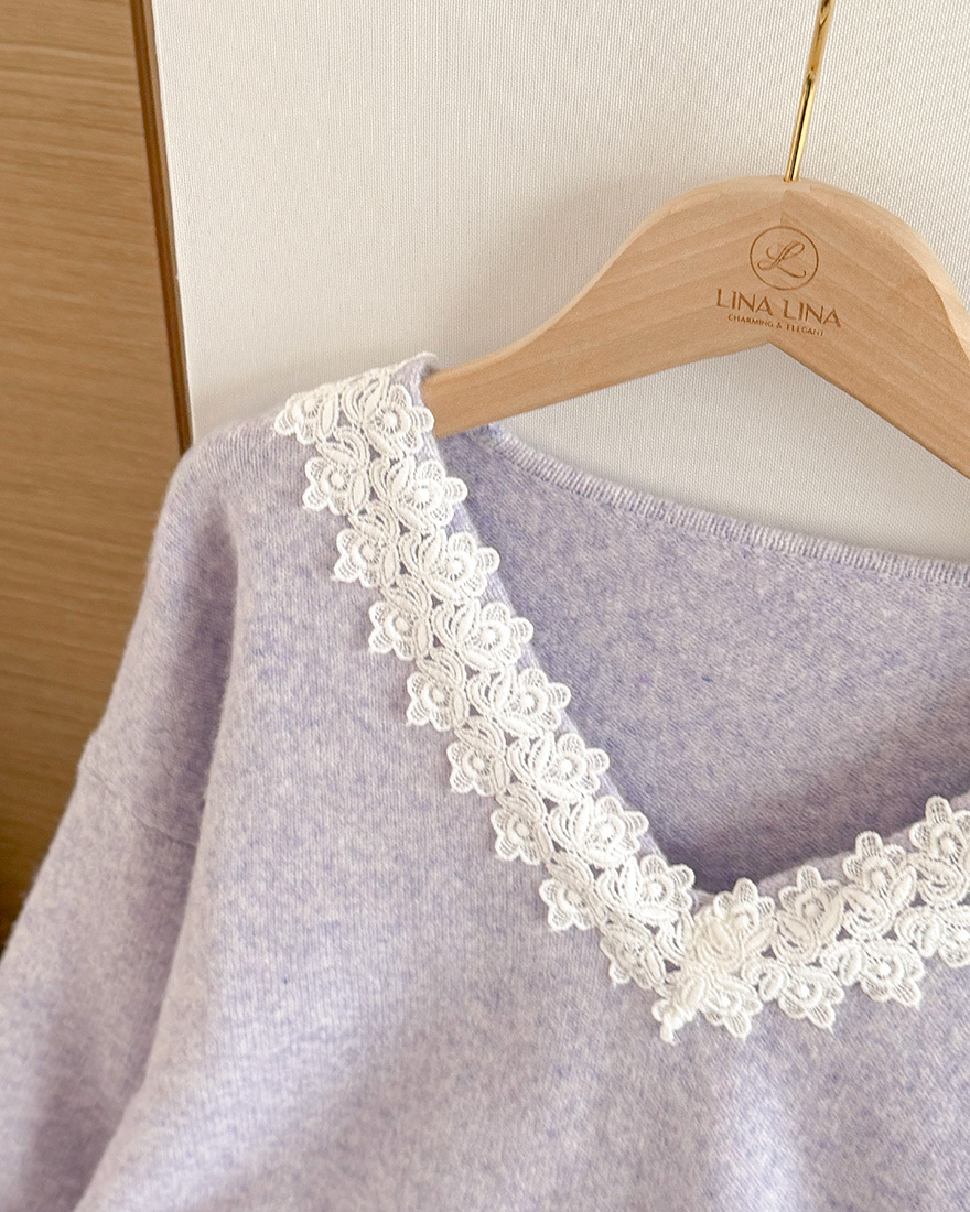LINA LINA漫漫柔情緹花蕾絲滾邊V領毛衣-優美紫