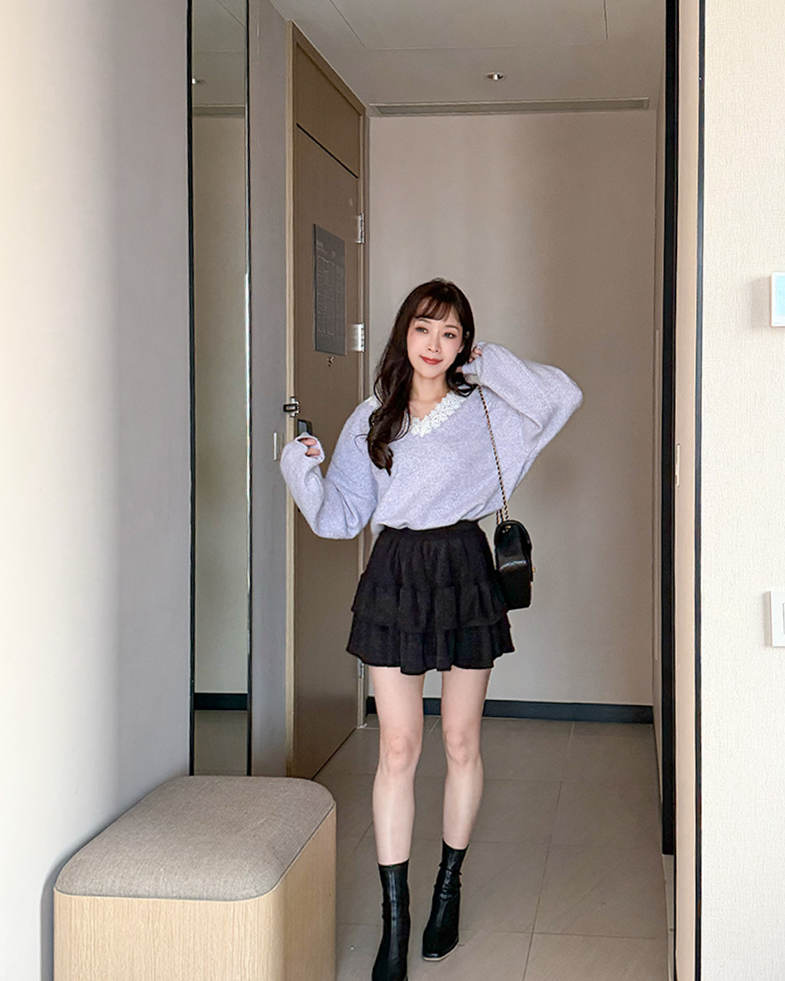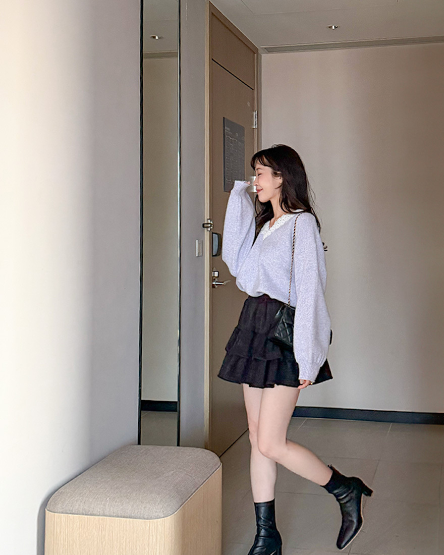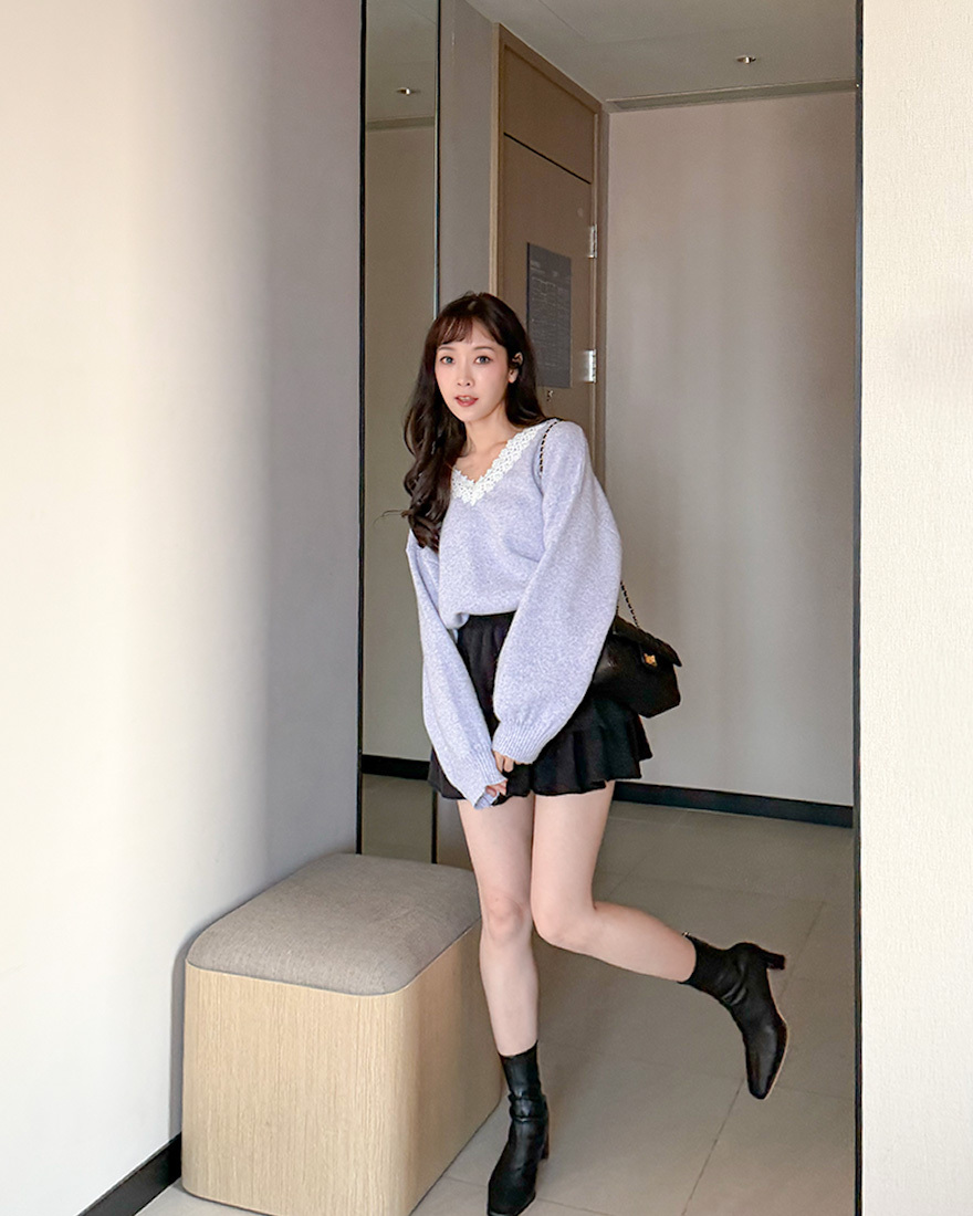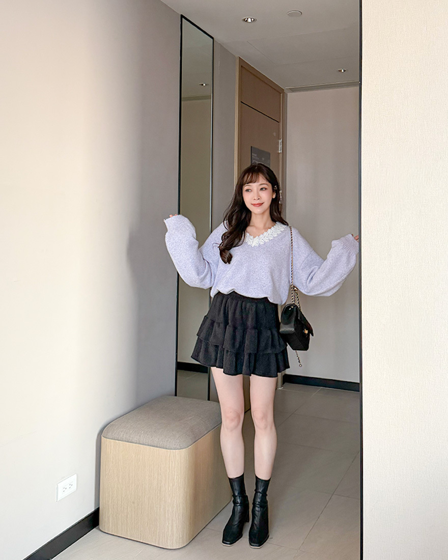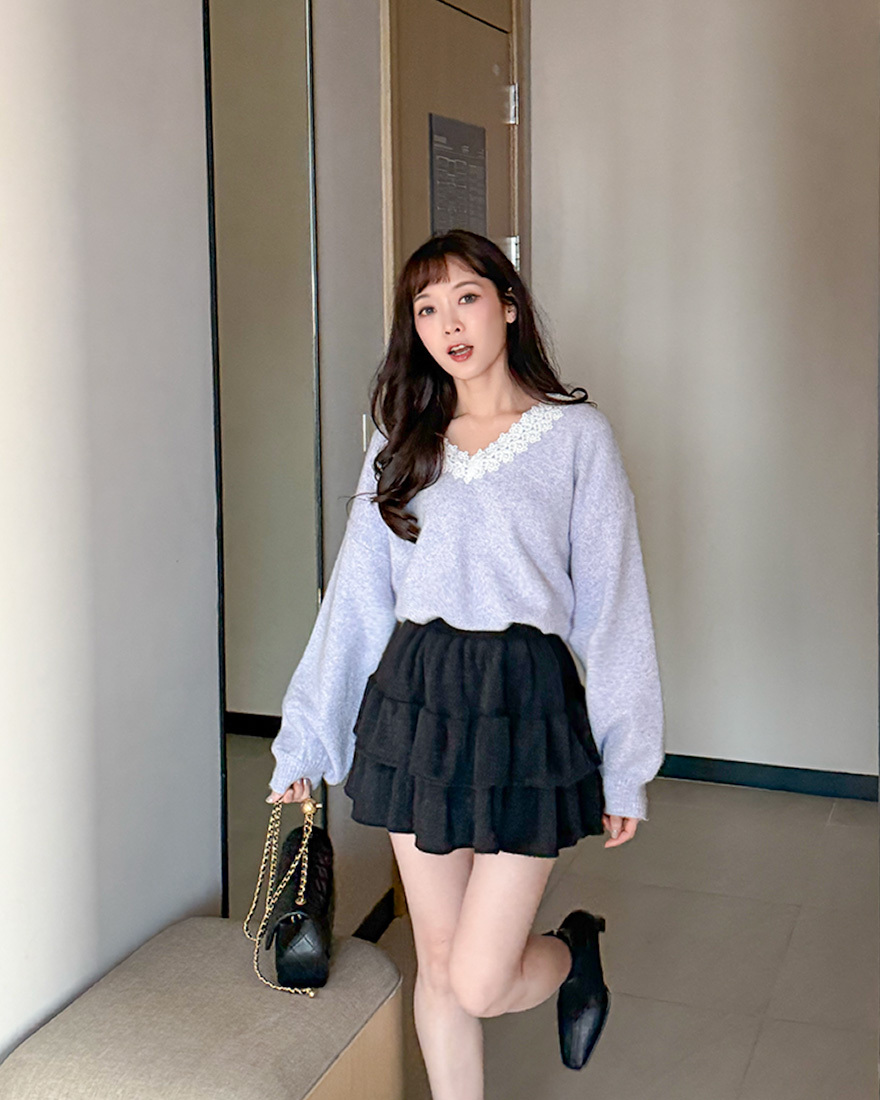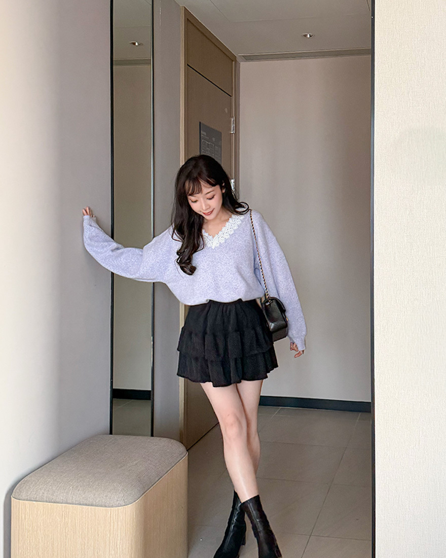 LINA LINA漫漫柔情緹花蕾絲滾邊V領毛衣-優美紫