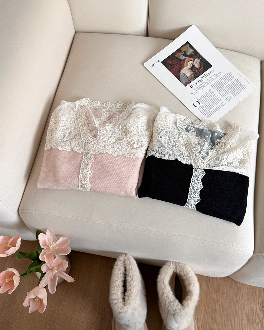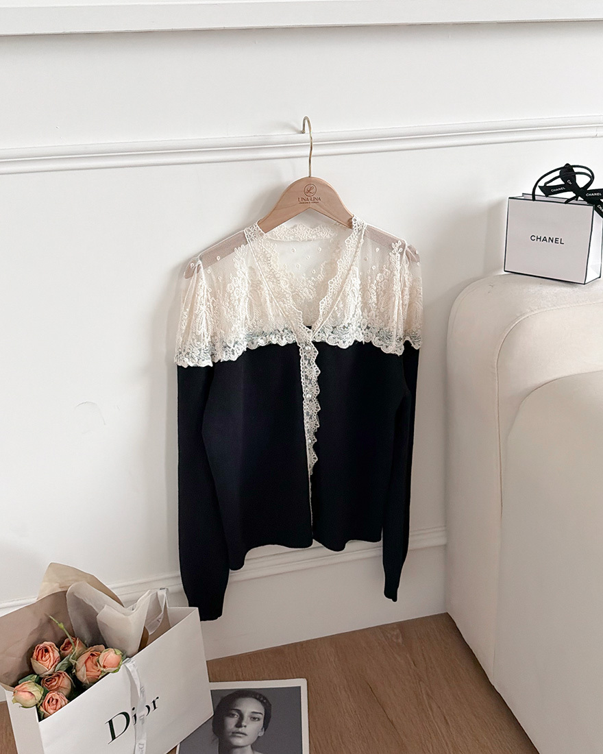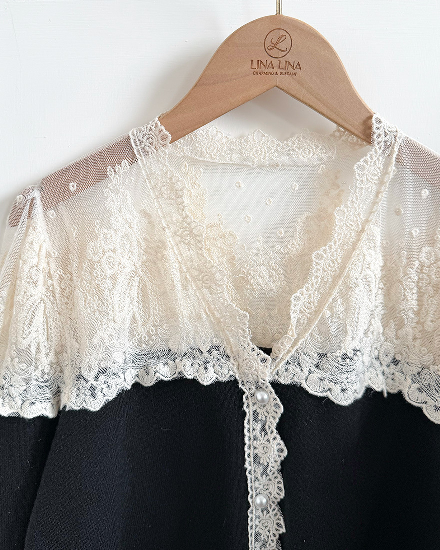 LINA LINA精緻輕語刺繡網紗珍珠釦花邊上衣-貴氣黑