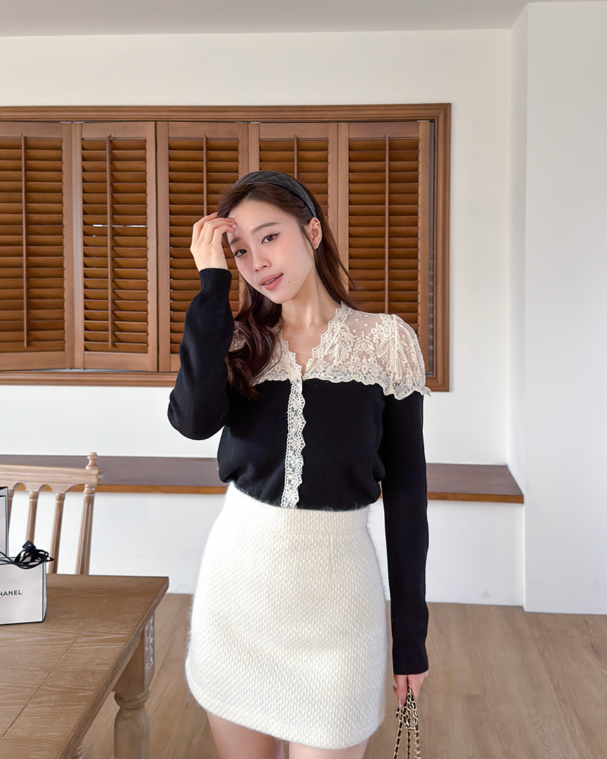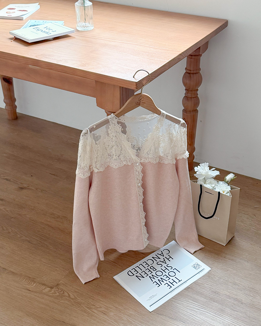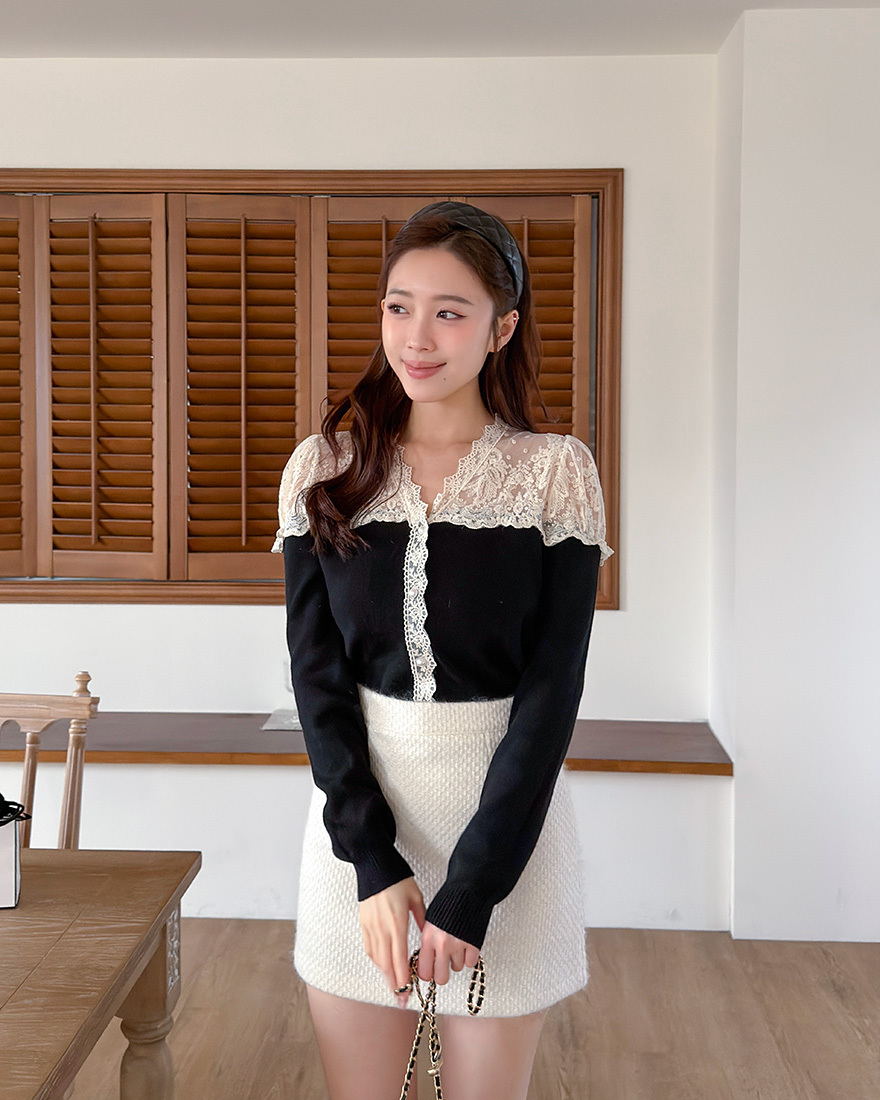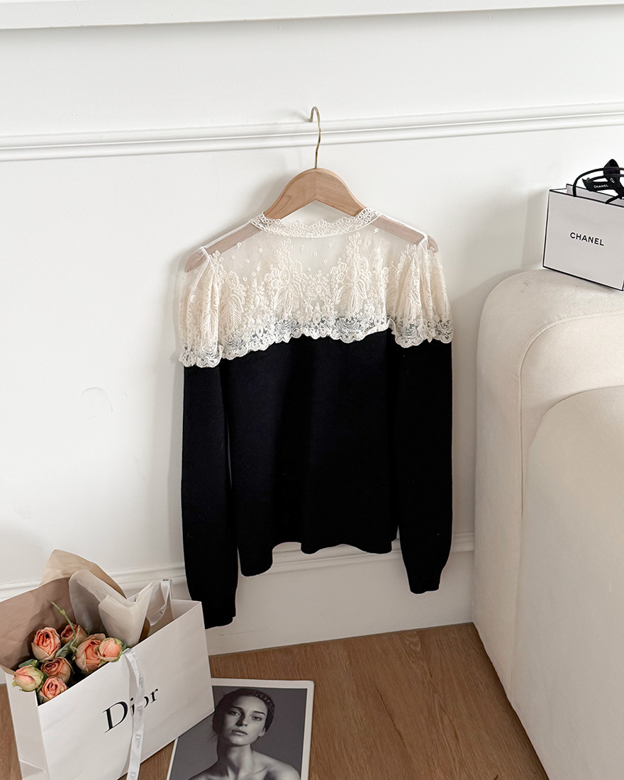 LINA LINA精緻輕語刺繡網紗珍珠釦花邊上衣-貴氣黑