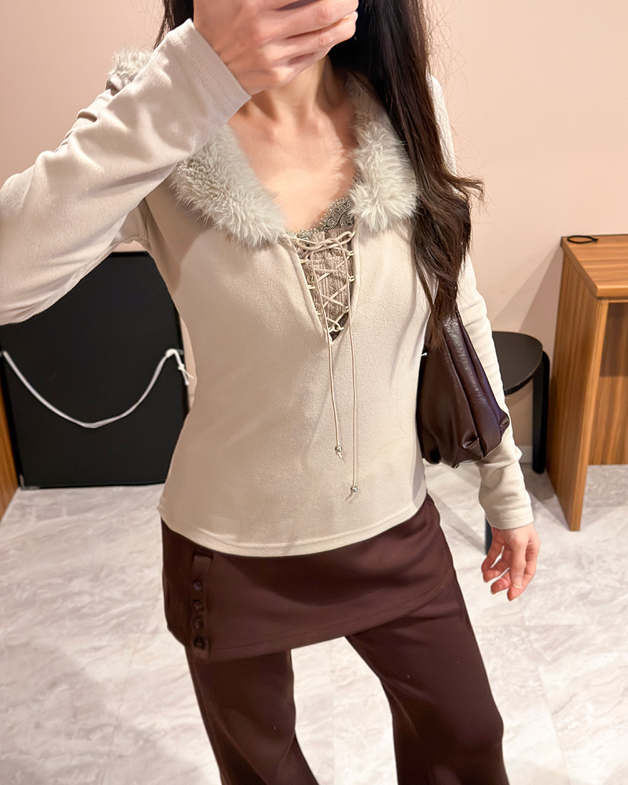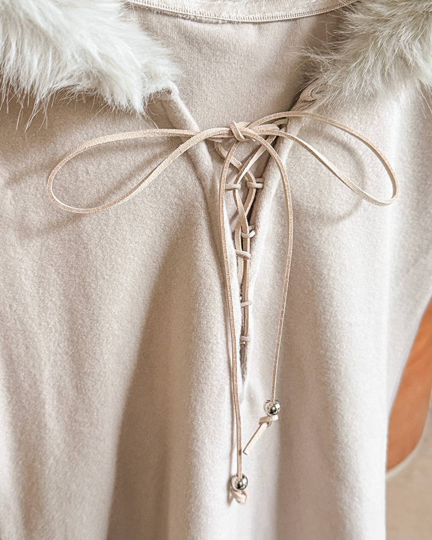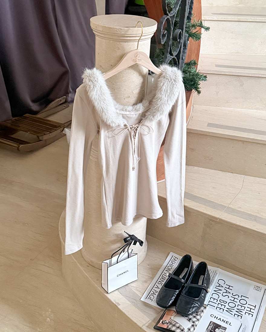 LINA LINA貴氣微辣馬甲穿繩造型毛領上衣-奶茶咖