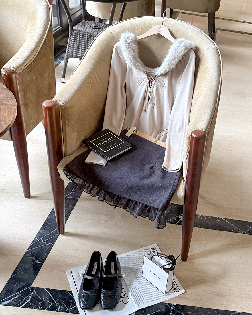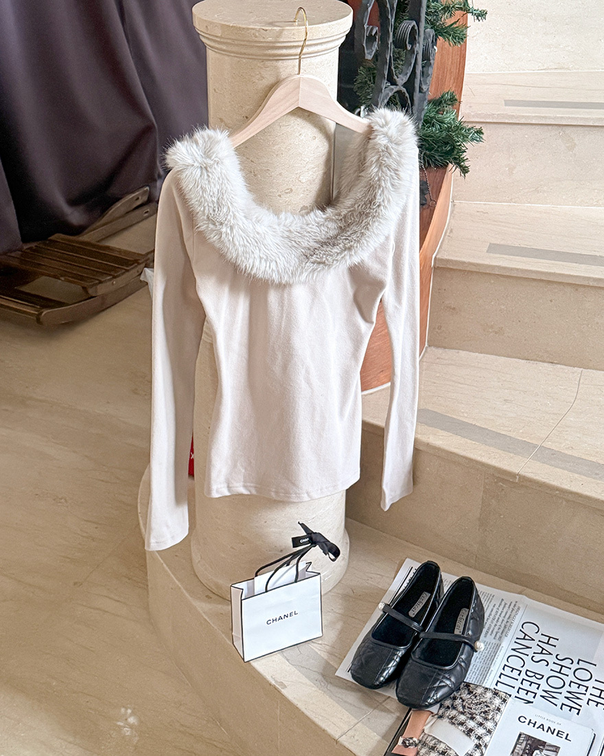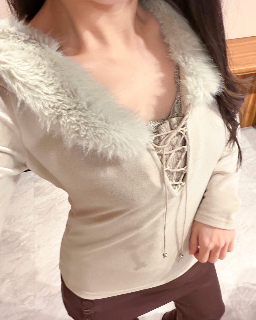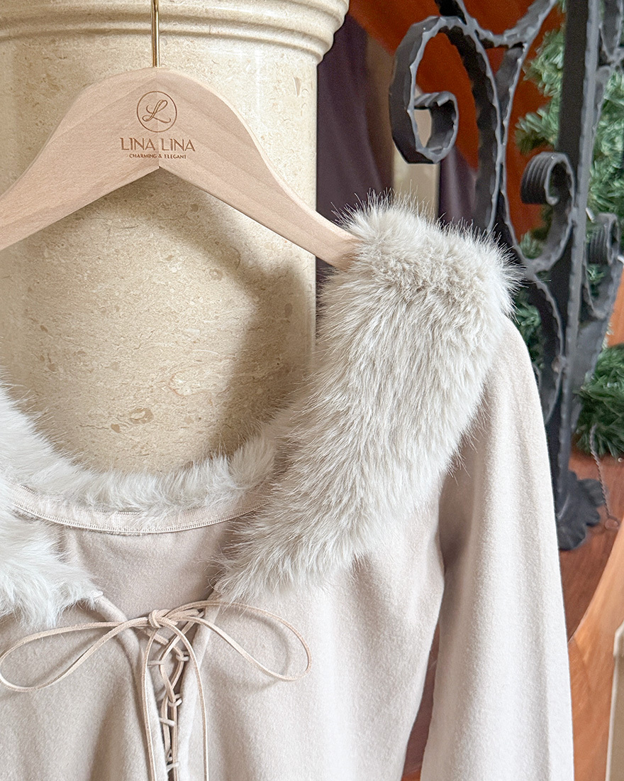 LINA LINA貴氣微辣馬甲穿繩造型毛領上衣-奶茶咖