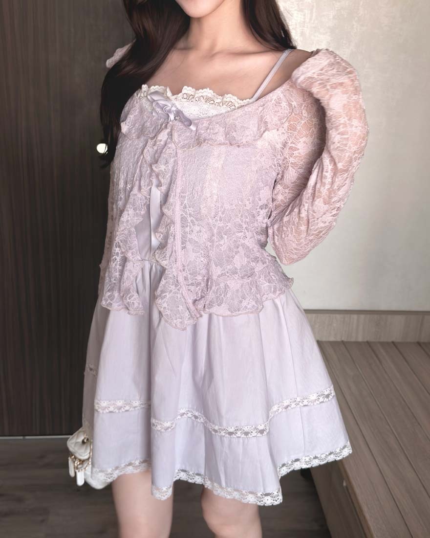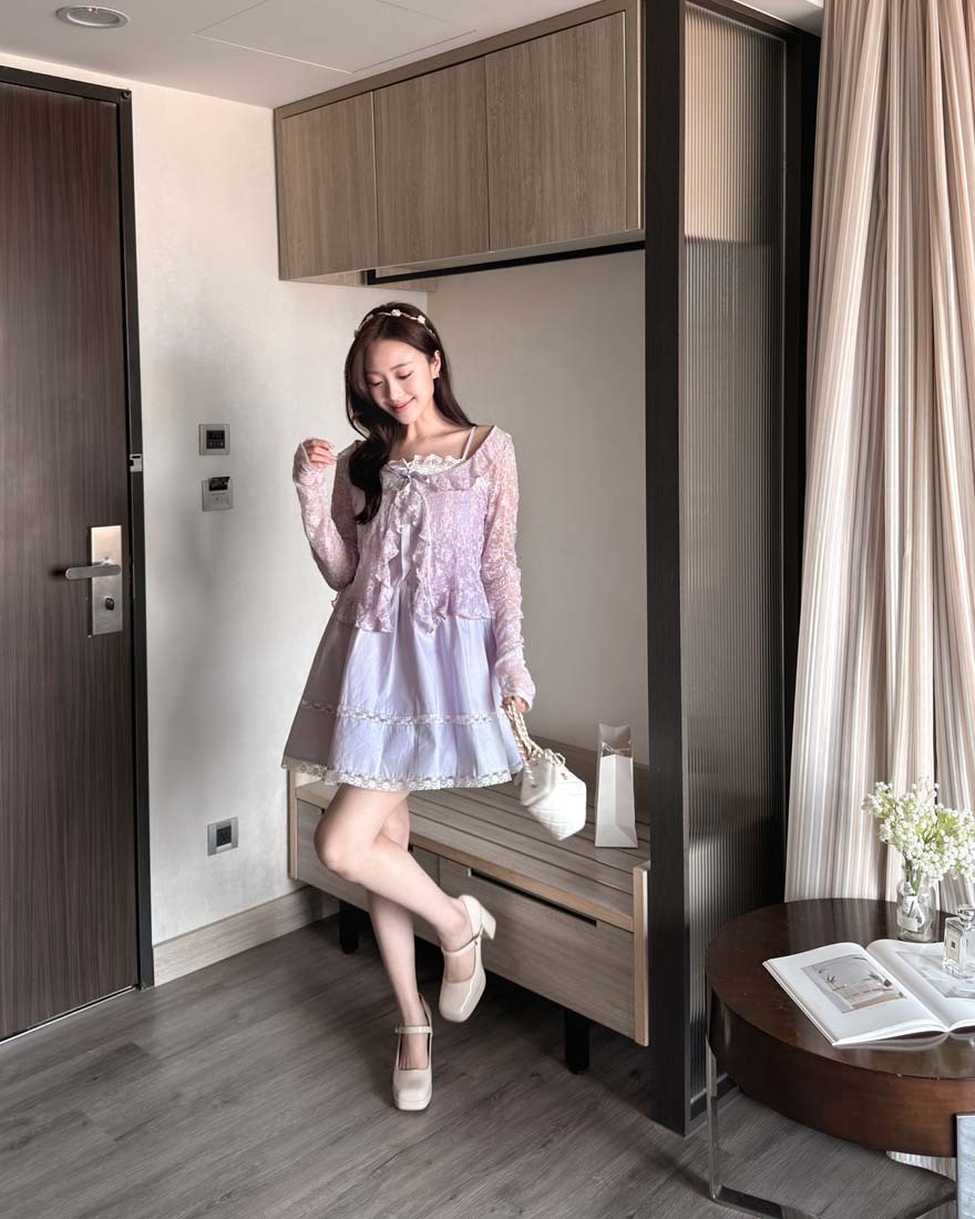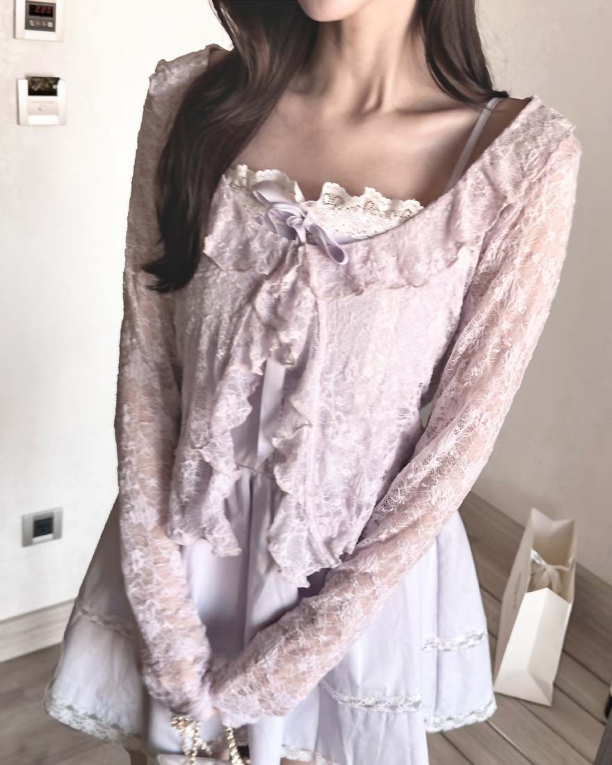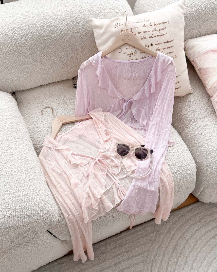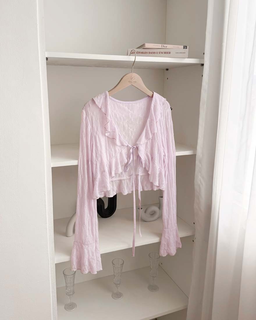 LINA LINA溫柔優美刺繡花朵荷葉滾邊綁結罩衫-浪漫紫