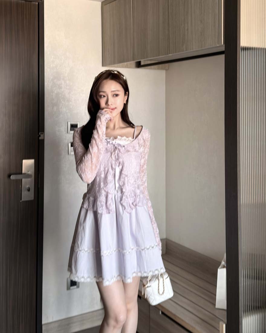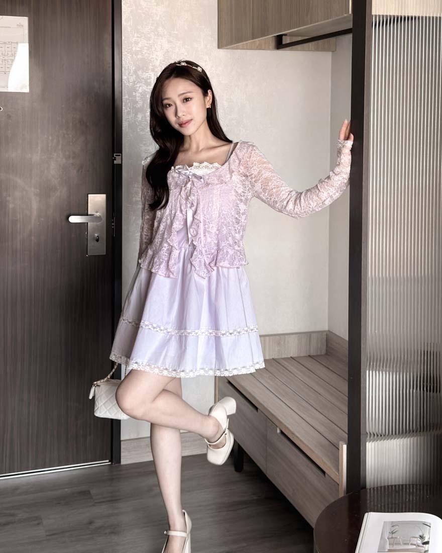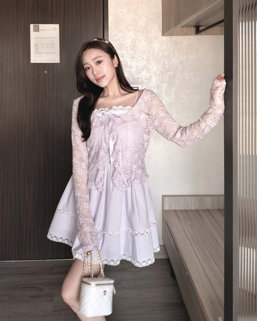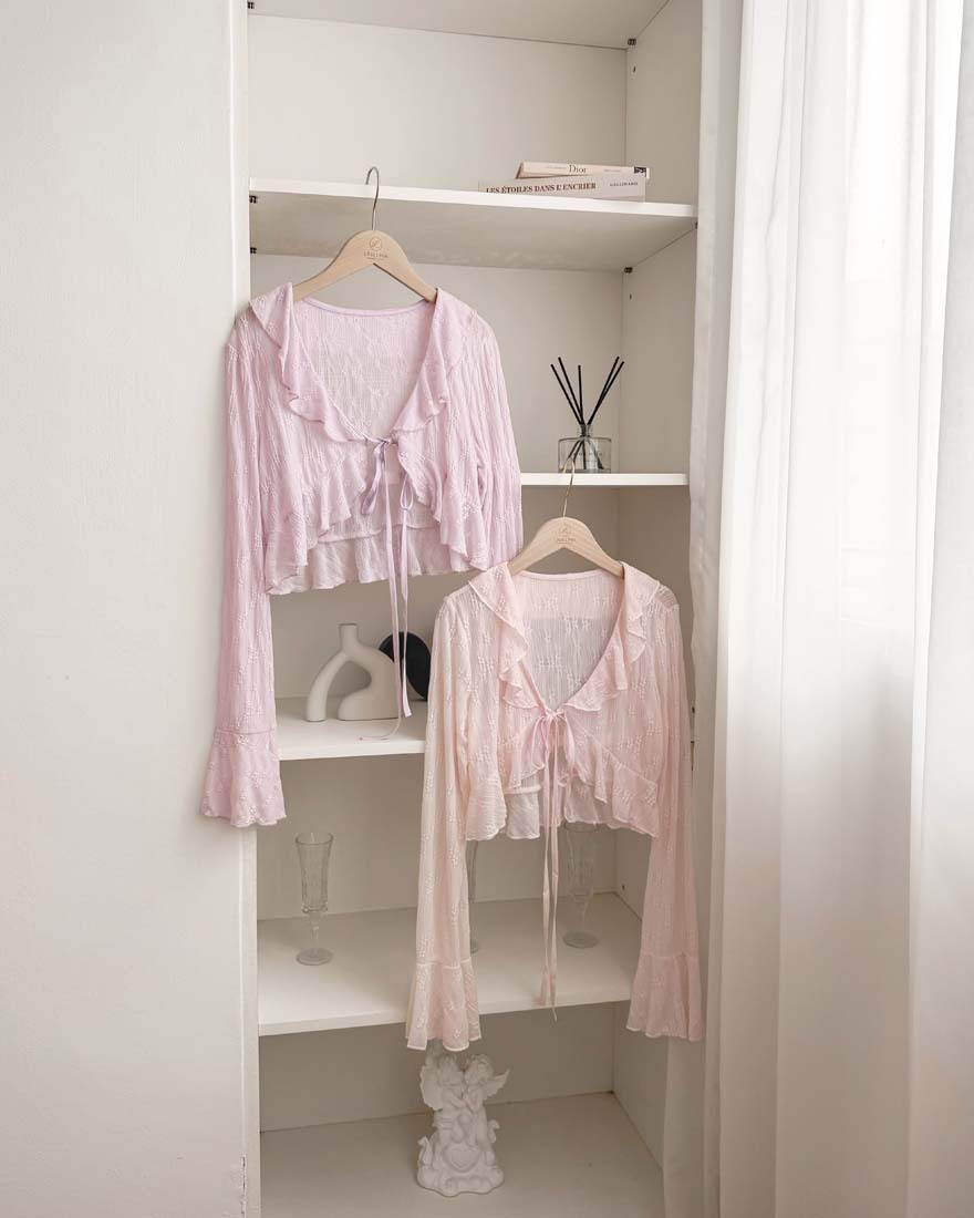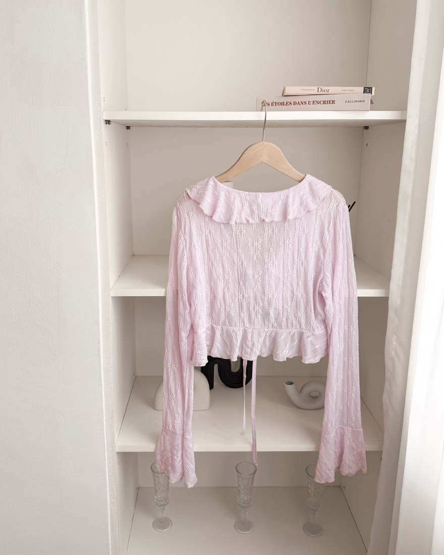 LINA LINA溫柔優美刺繡花朵荷葉滾邊綁結罩衫-浪漫紫