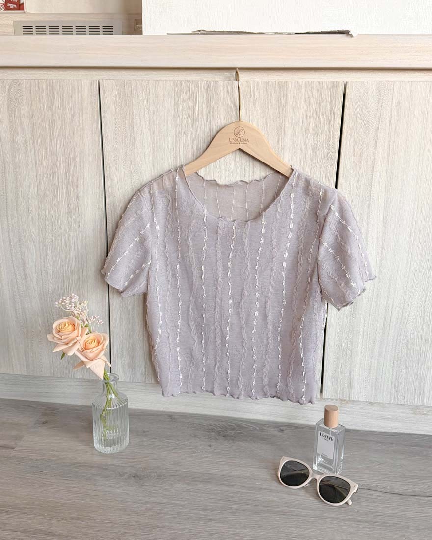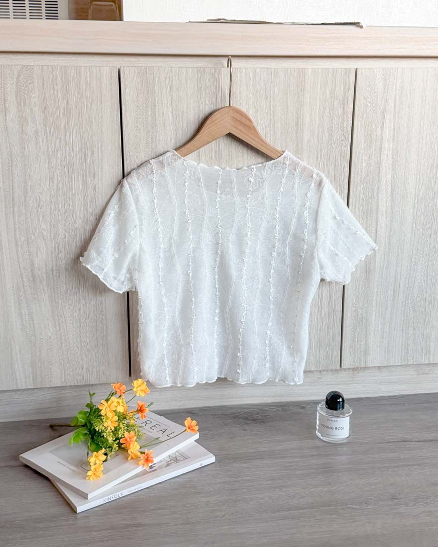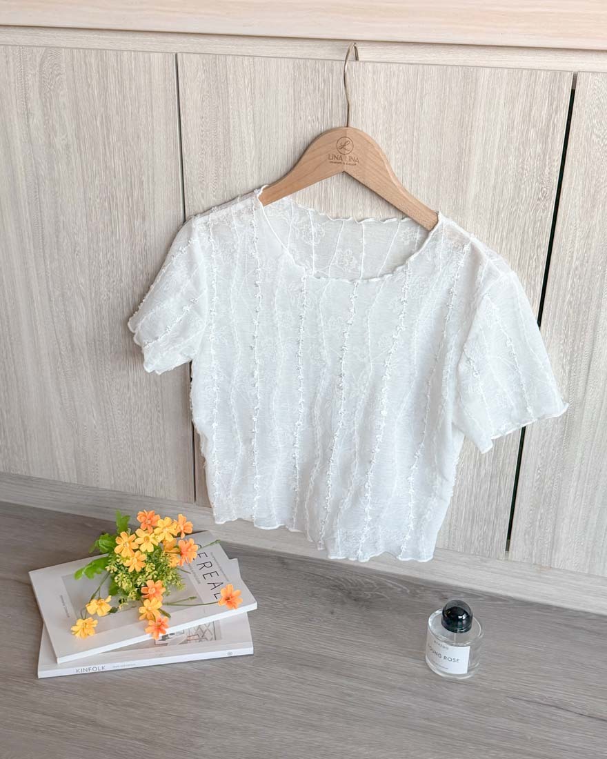 LINA LINA美好細語花朵壓摺網紗刺繡上衣-清新白