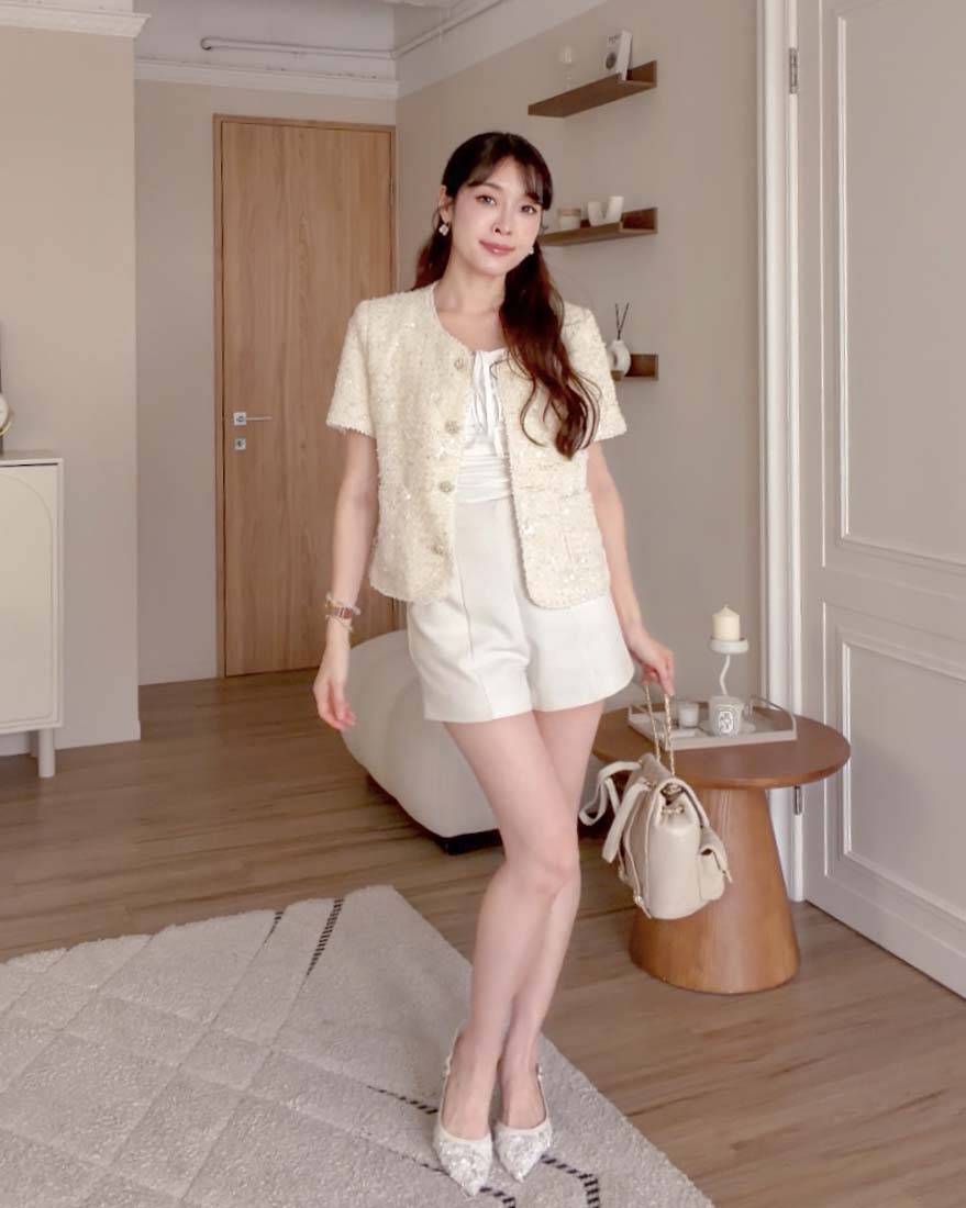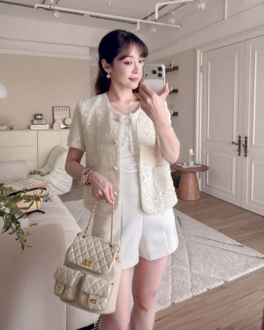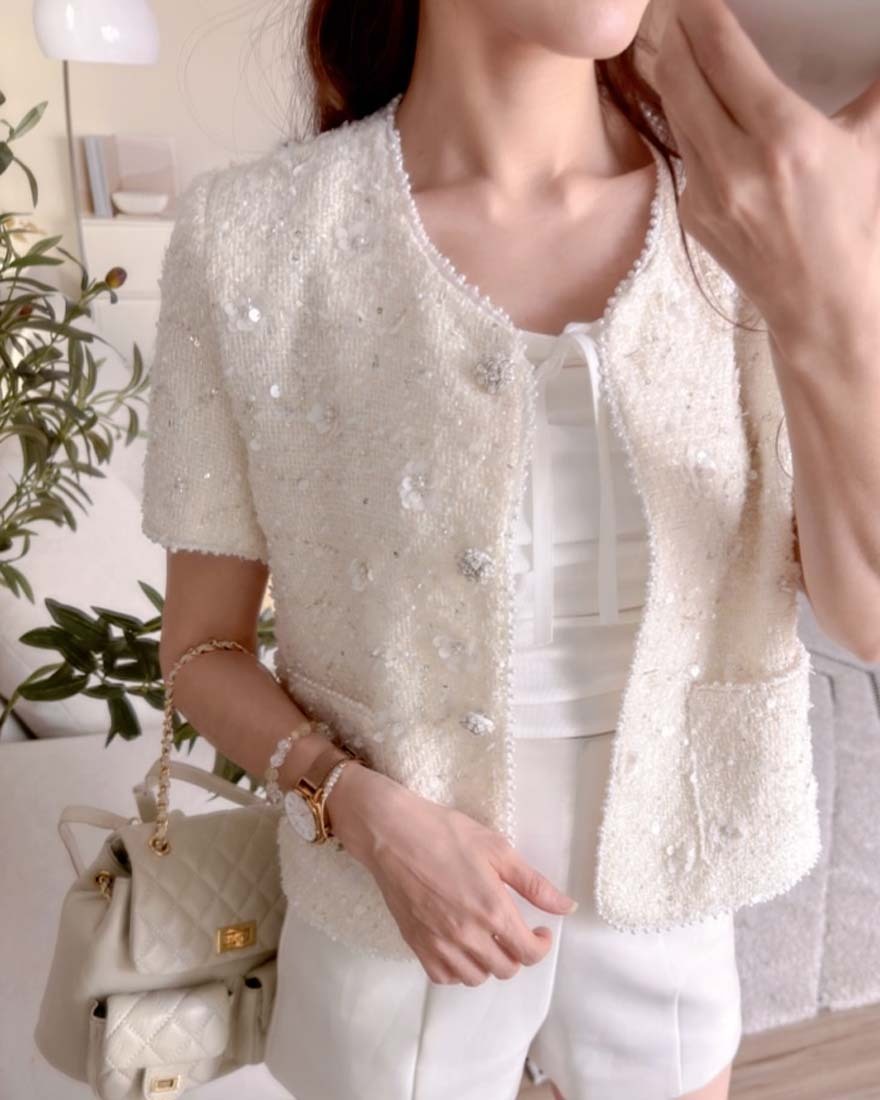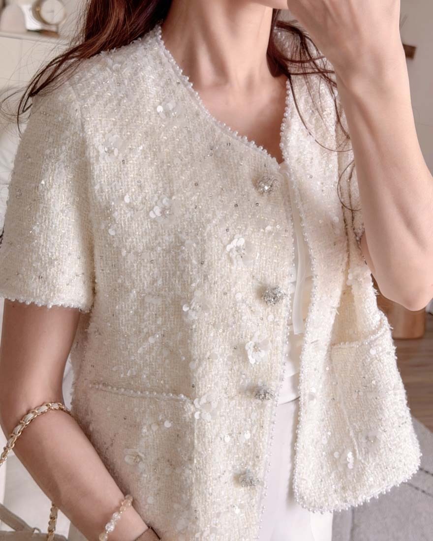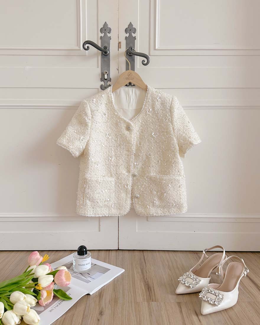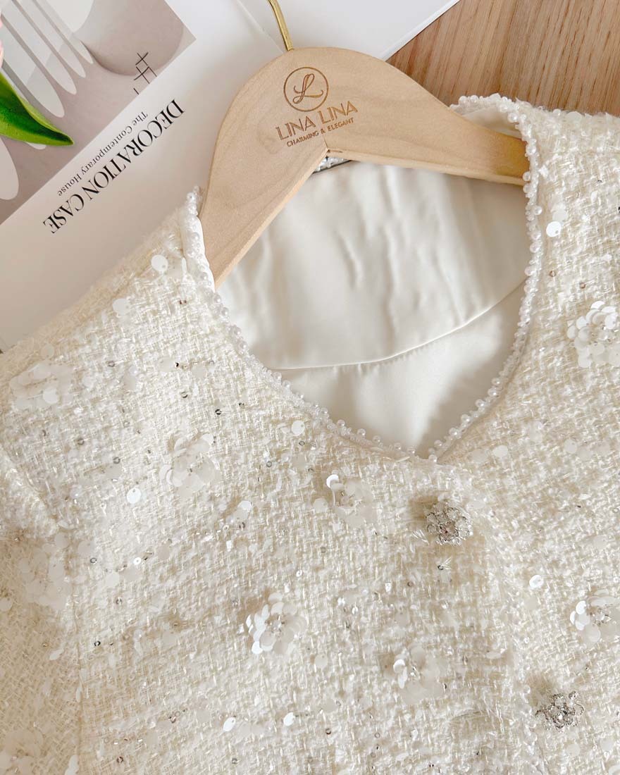 LINA LINA千金光采亮片鑽石釦珍珠小香外套-奶油白
