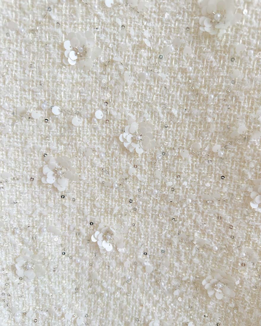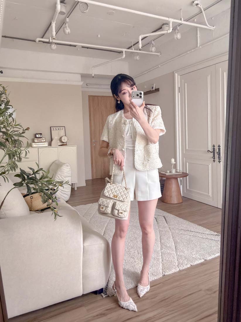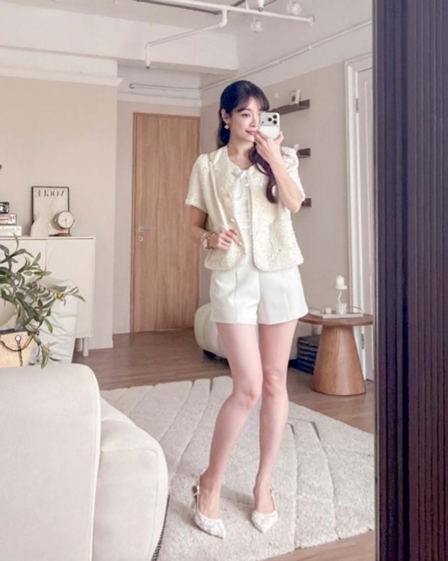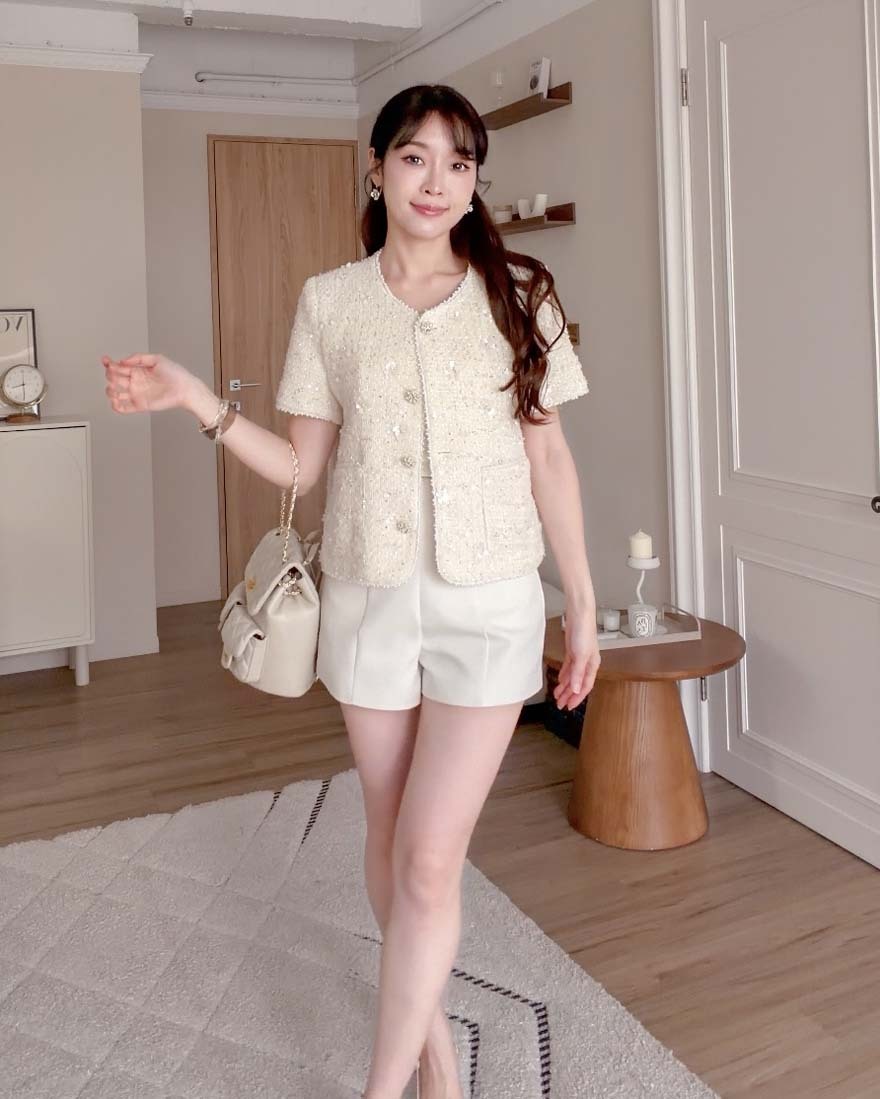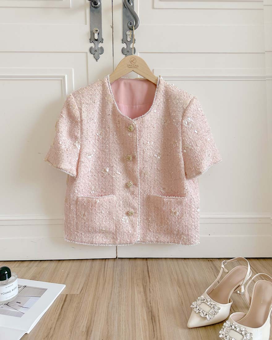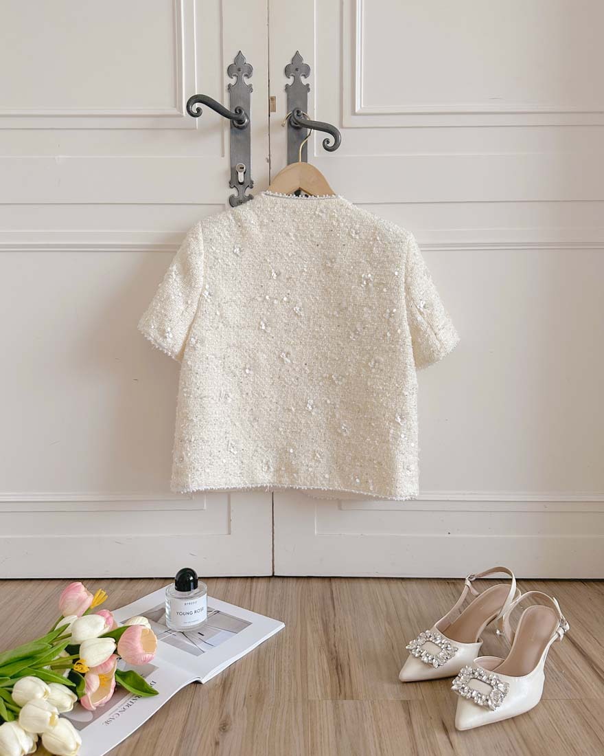 LINA LINA千金光采亮片鑽石釦珍珠小香外套-奶油白