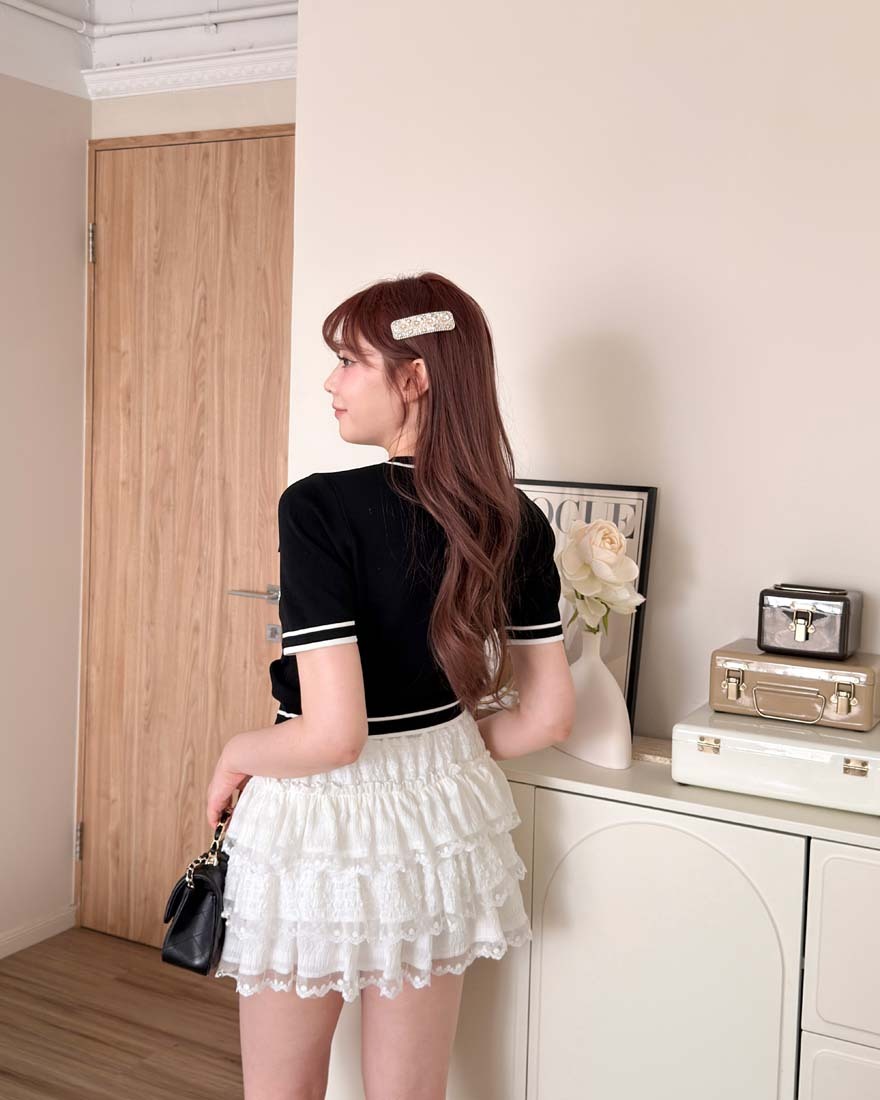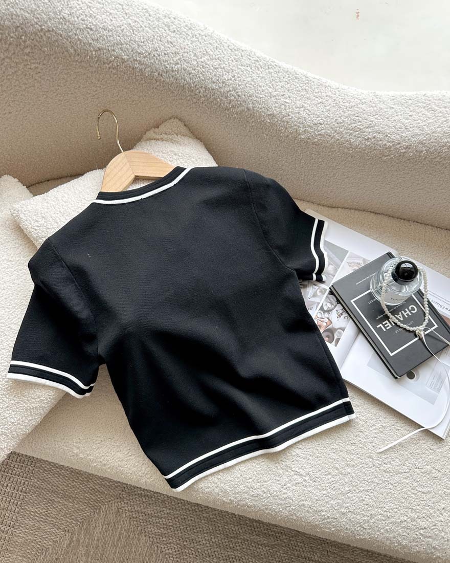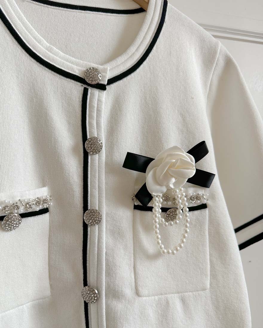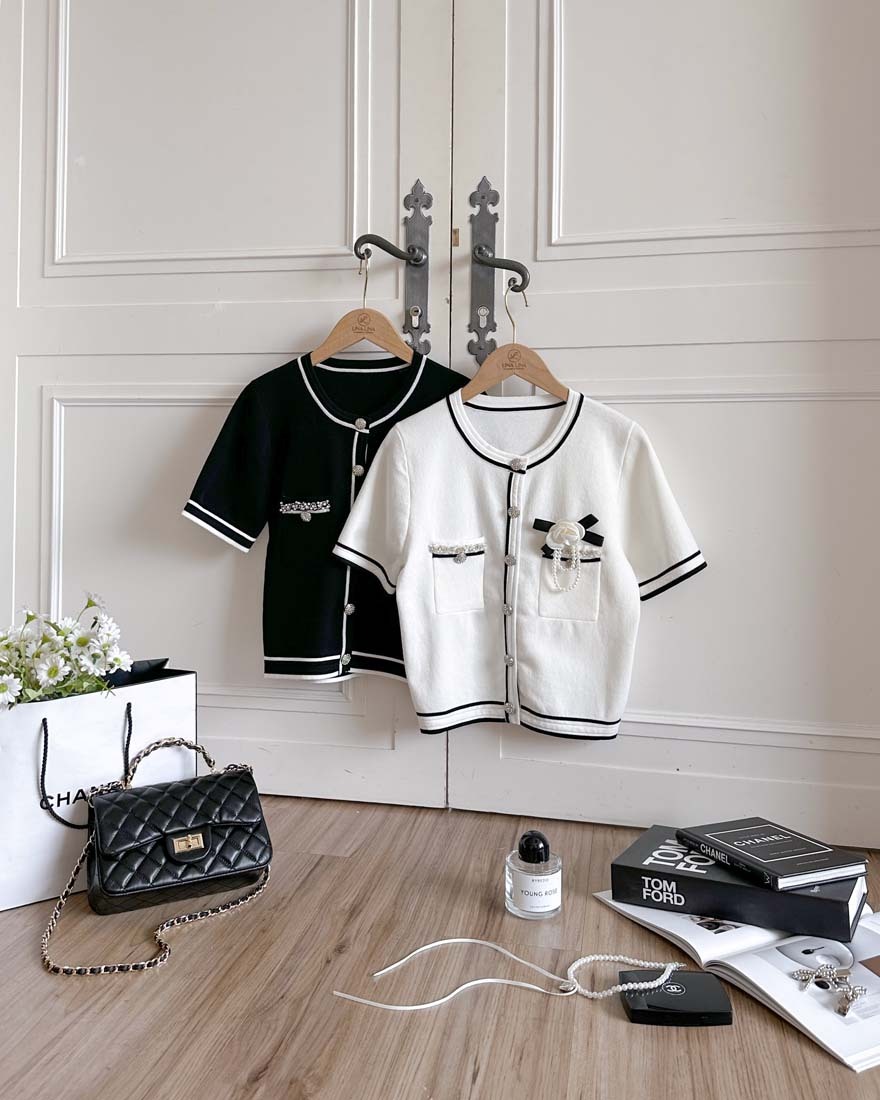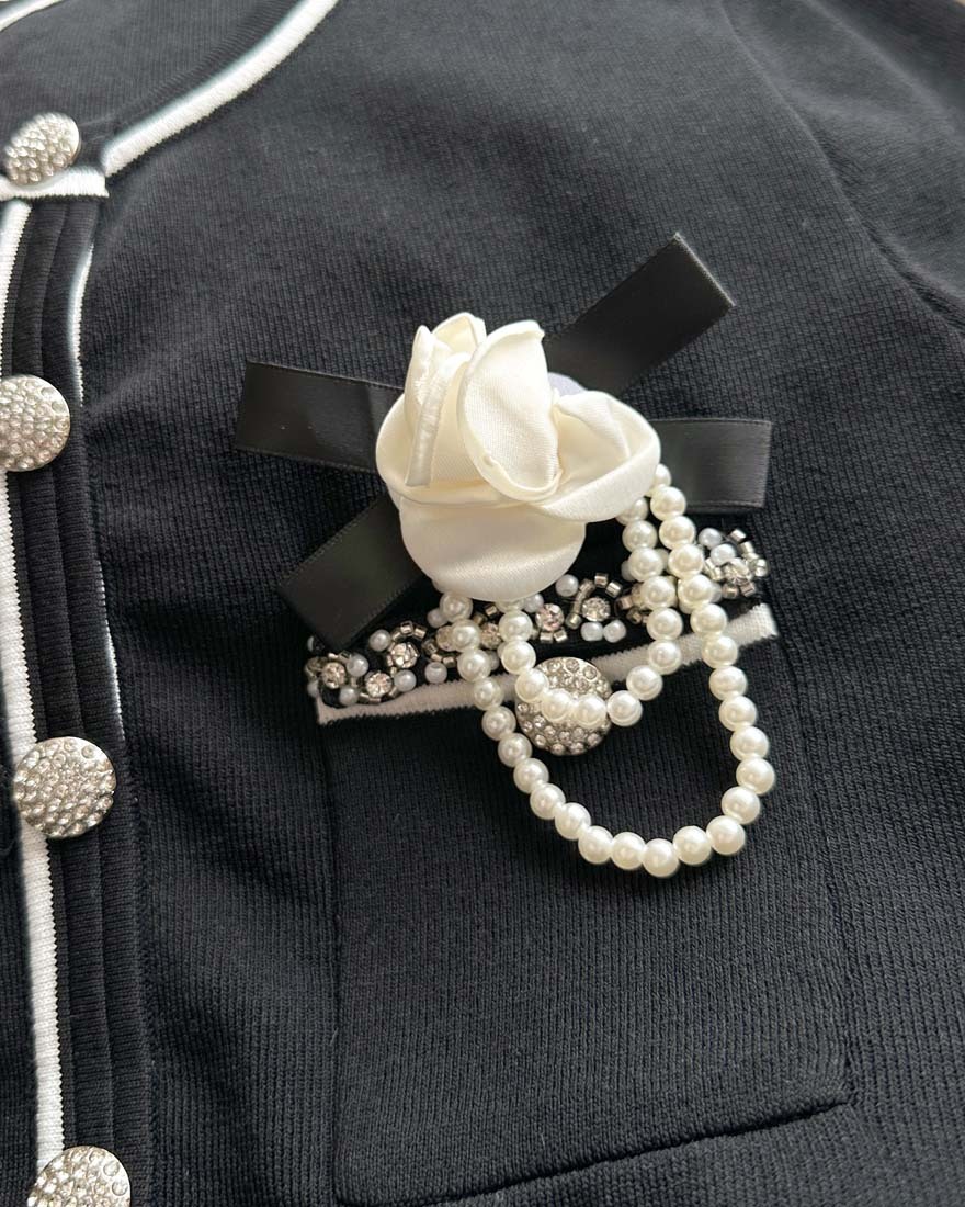 LINA LINA名媛小香撞色珍珠鑽石山茶花上衣-貴氣黑