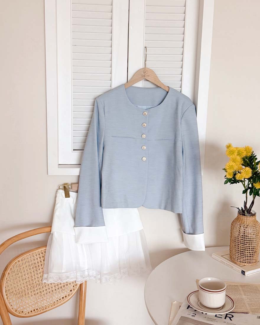 LINA LINA時髦風采金釦西裝外套附繞帶-優雅藍