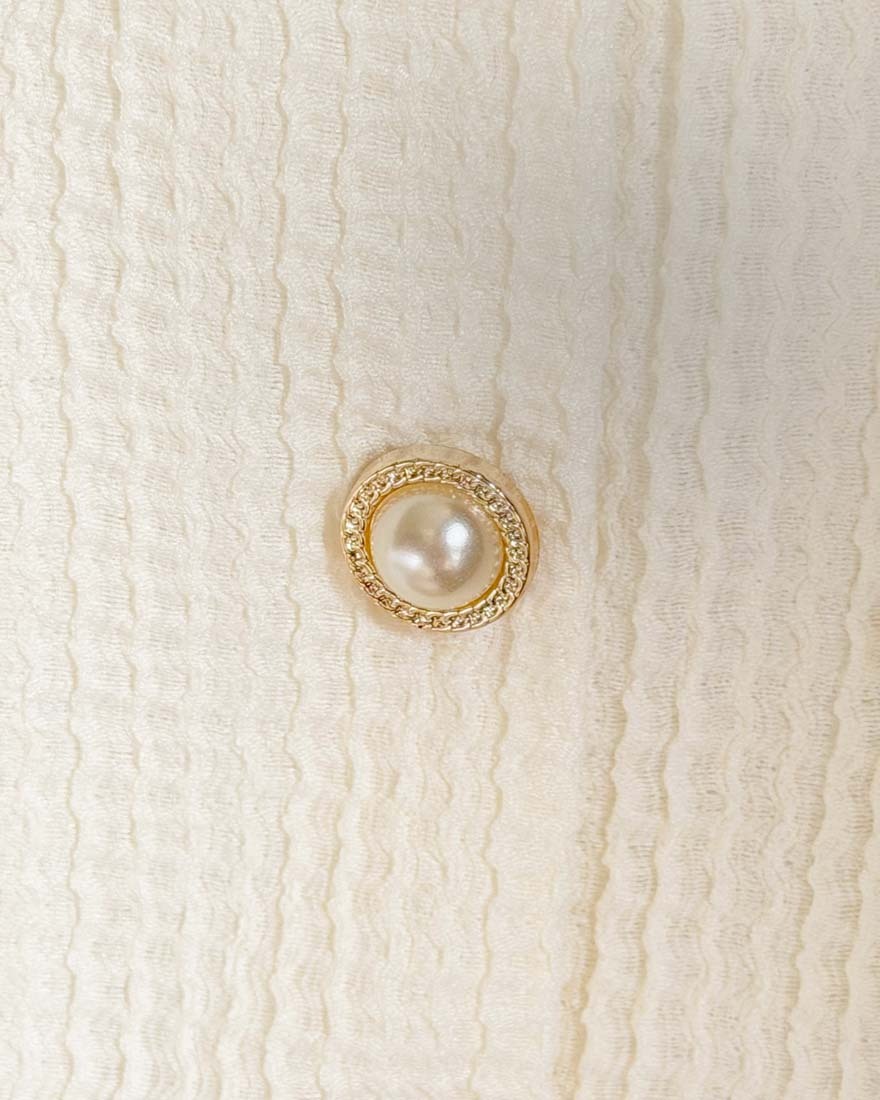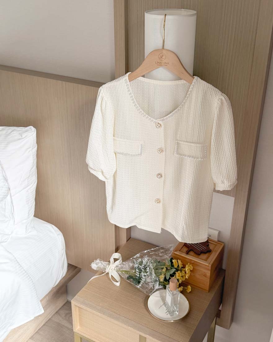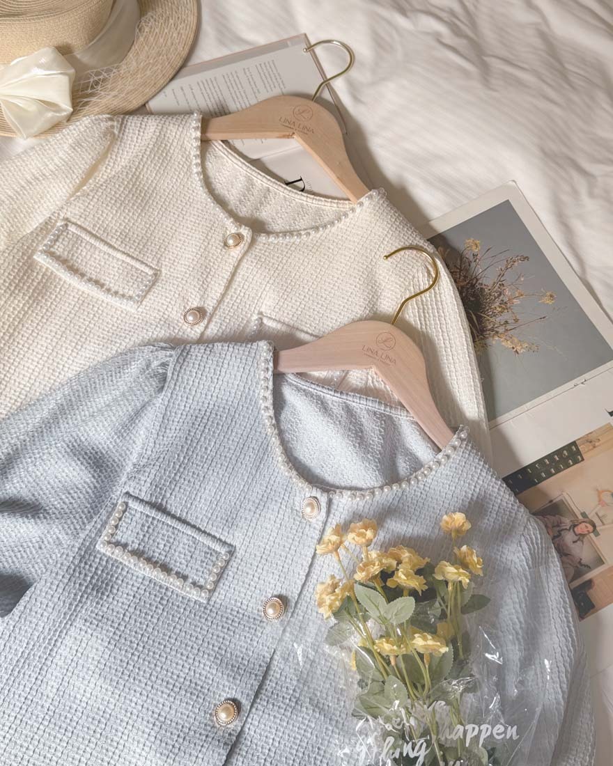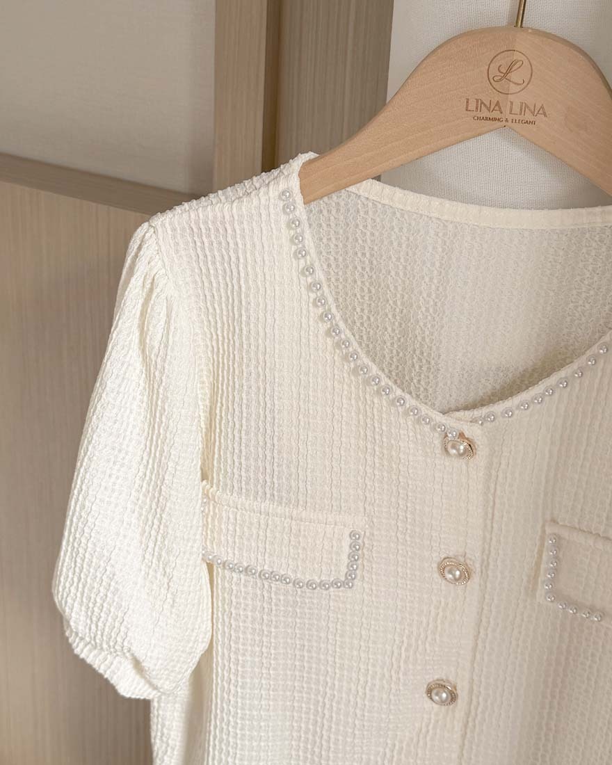 LINA LINA輕甜千金珍珠滾邊華夫格排釦上衣-淡鵝黃