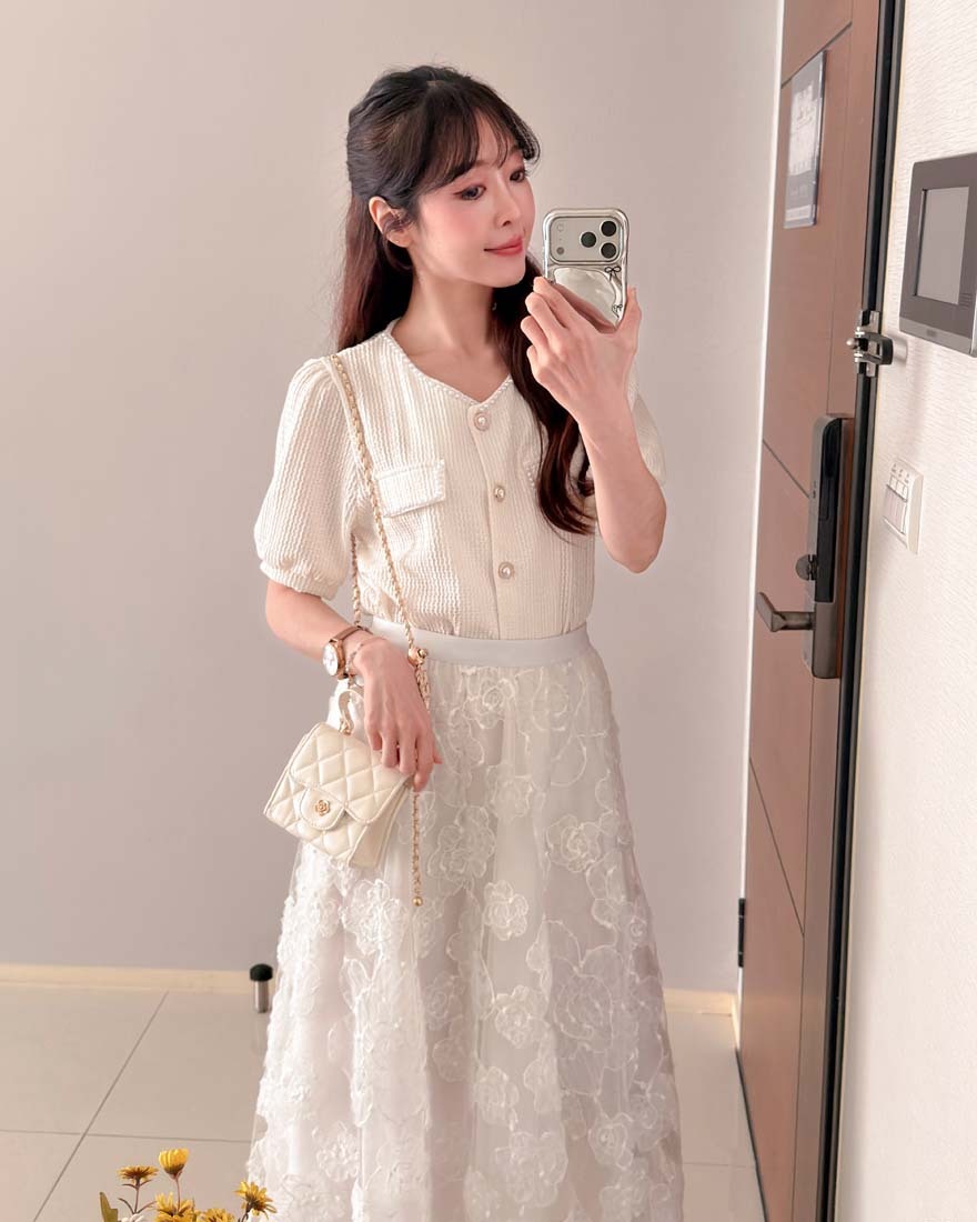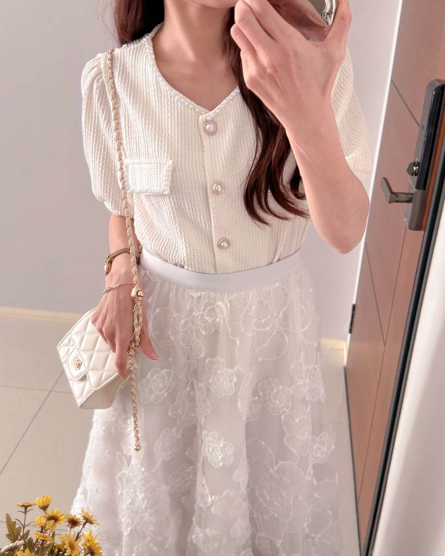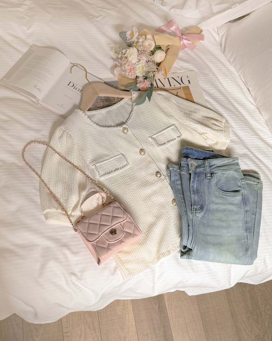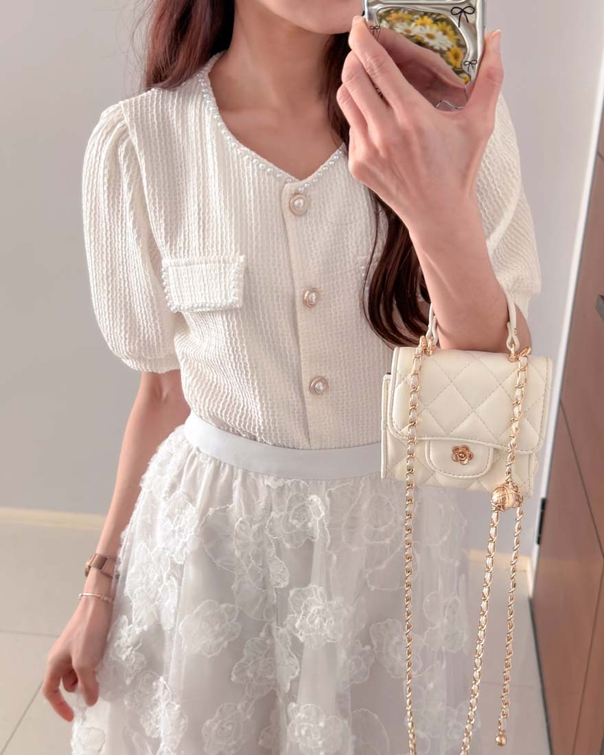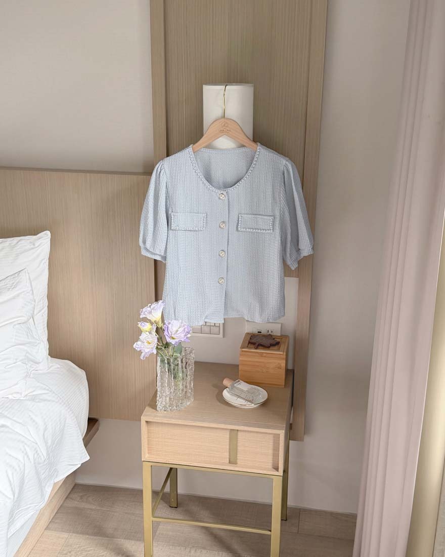 LINA LINA輕甜千金珍珠滾邊華夫格排釦上衣-淡鵝黃